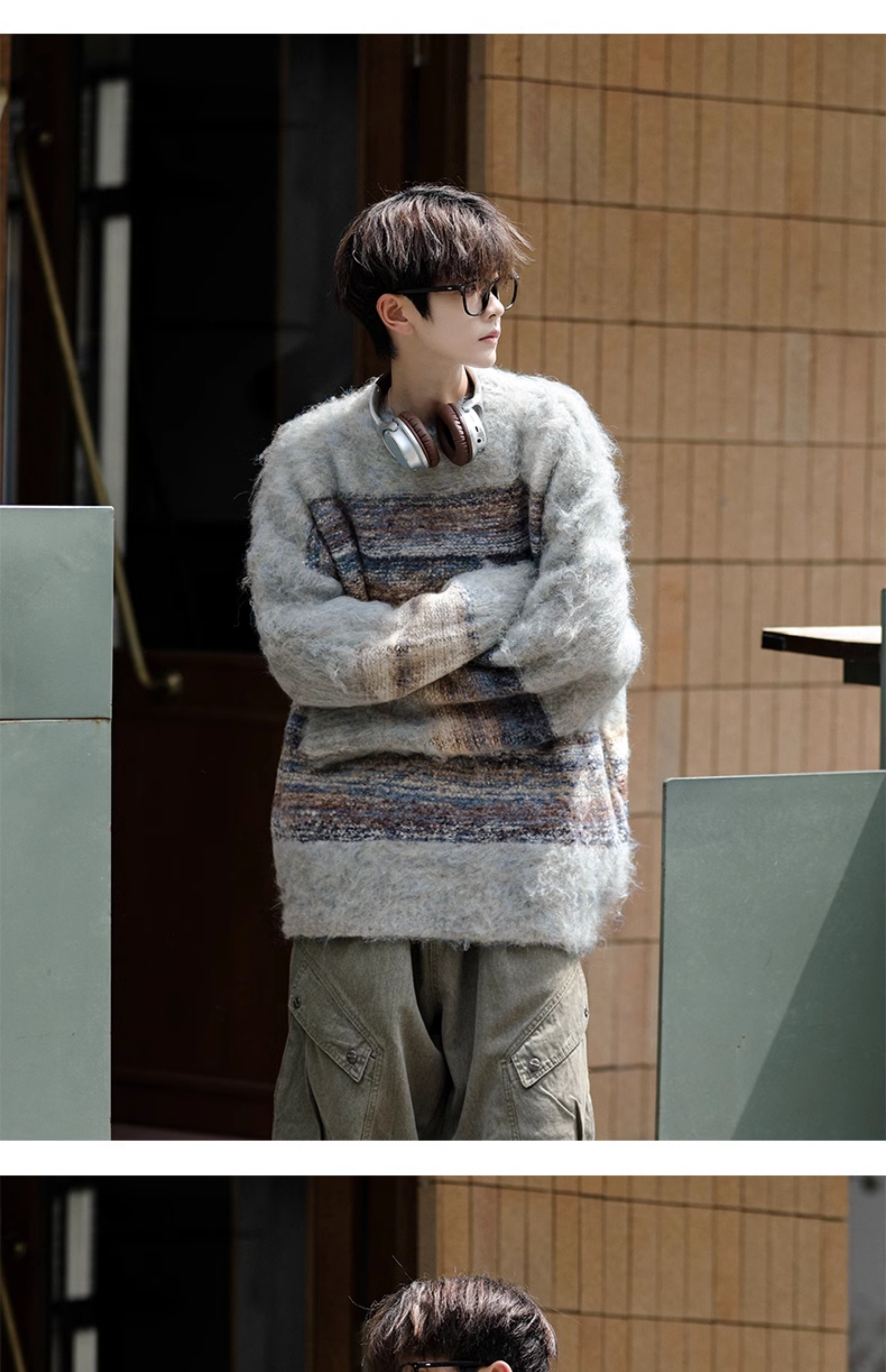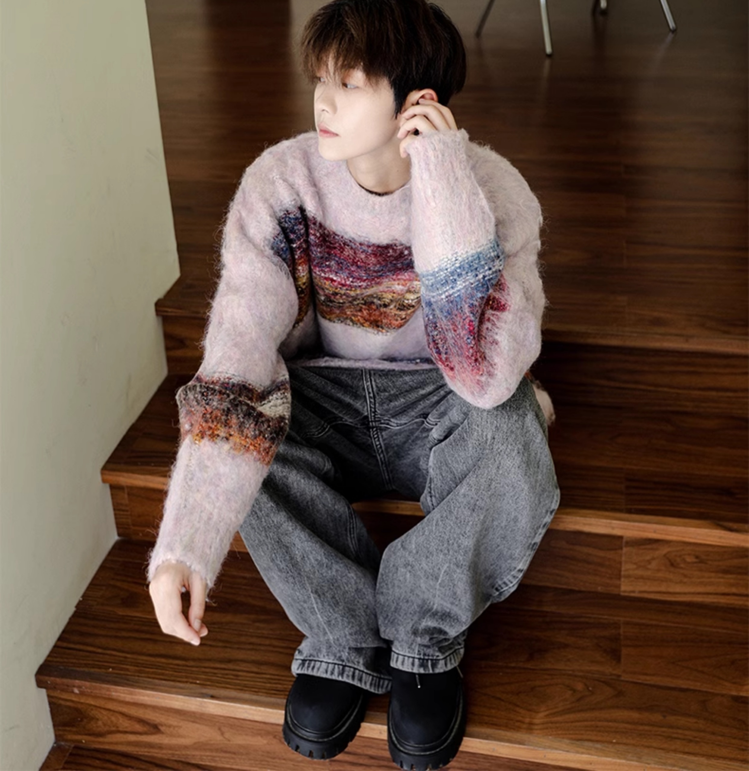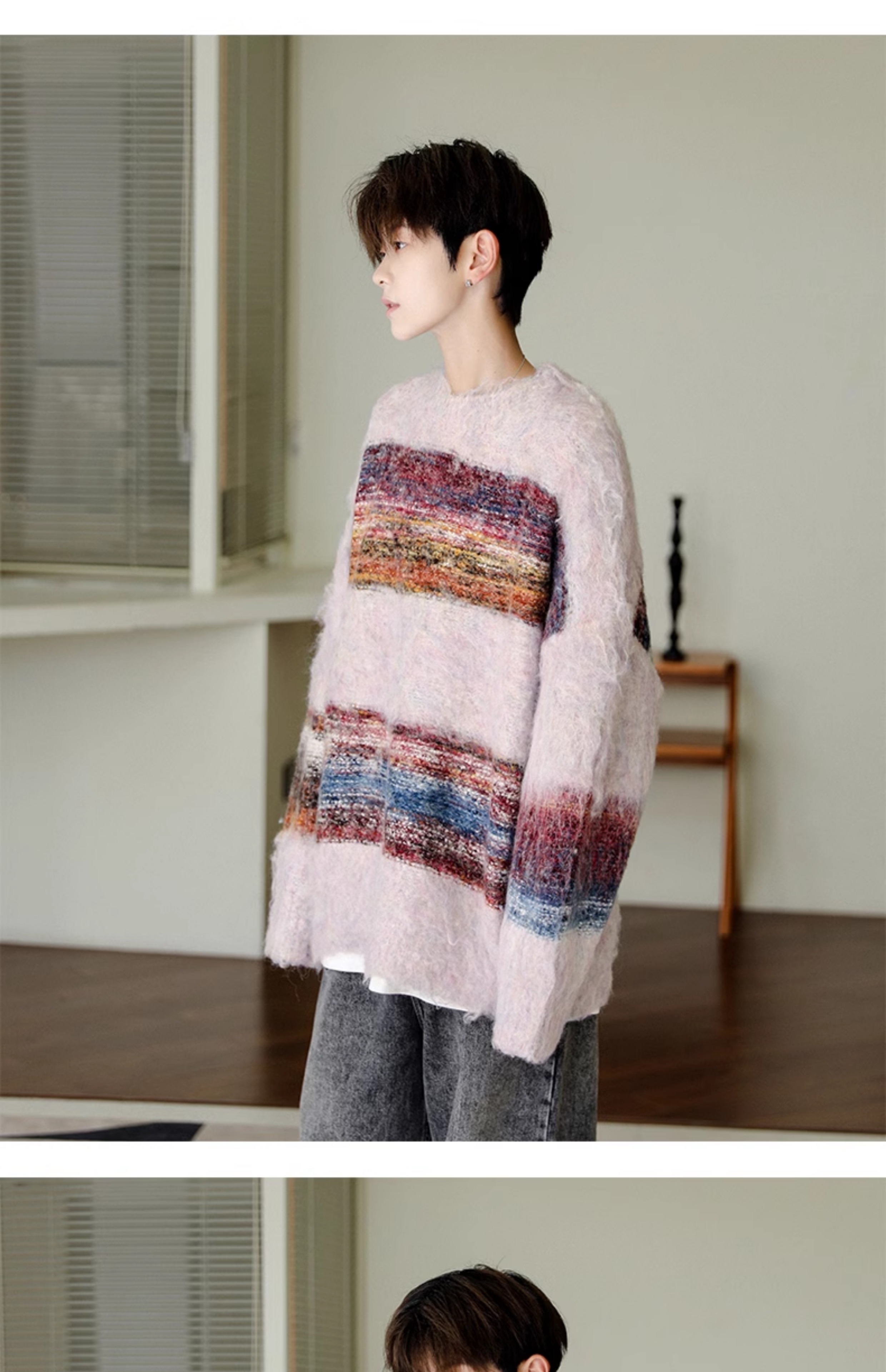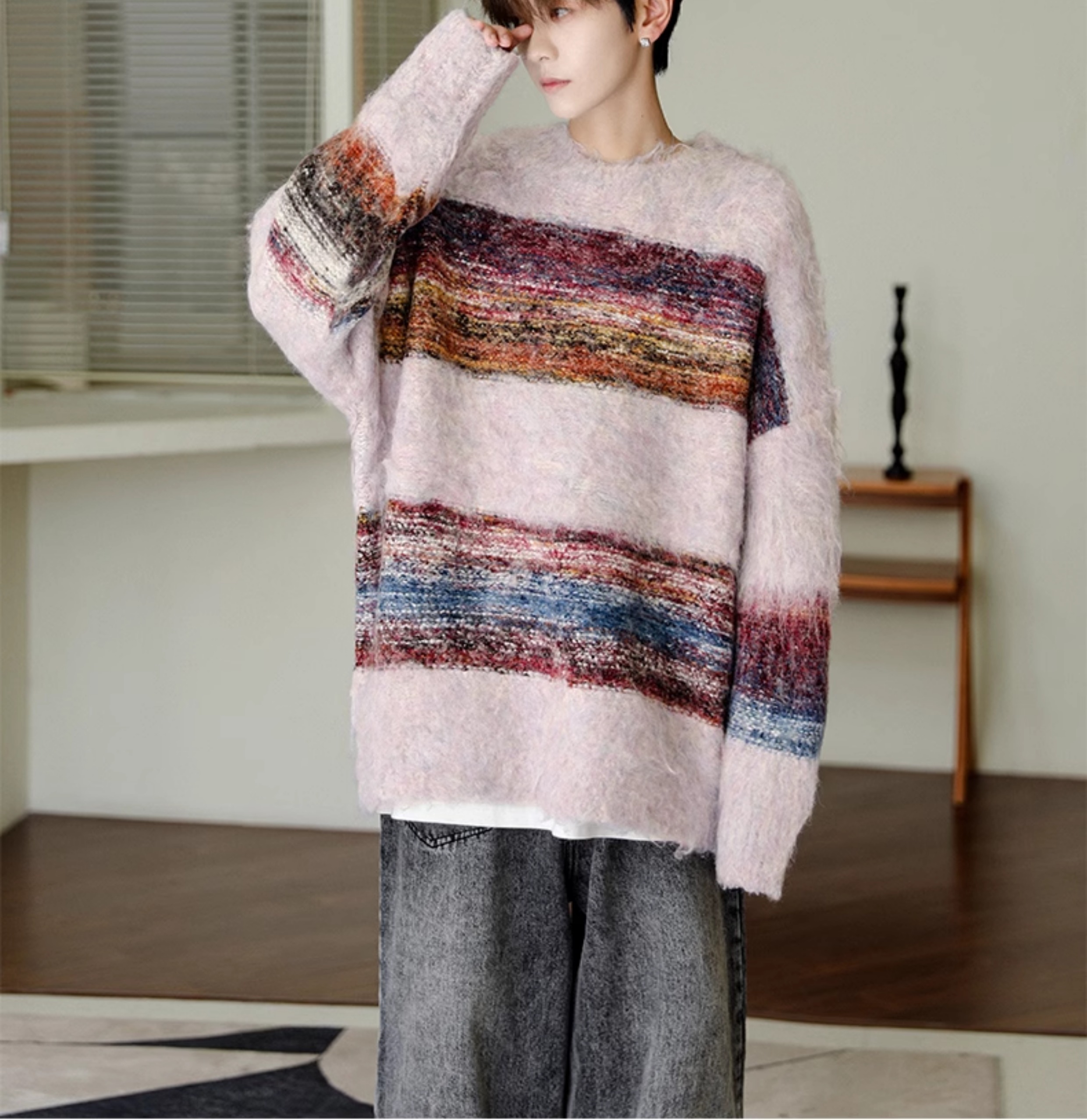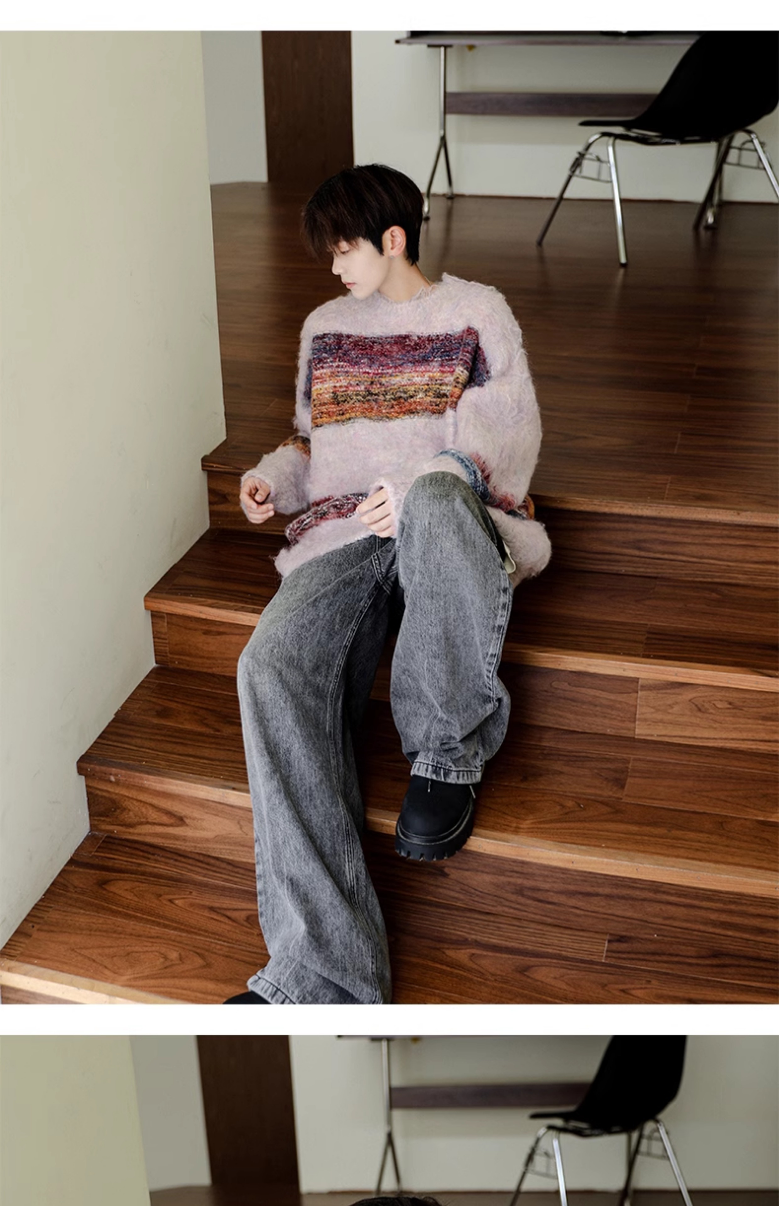 美式chic復古慵懶風漸變圓領毛衣男秋冬季潮牌情侶小衆寬松針織衫
