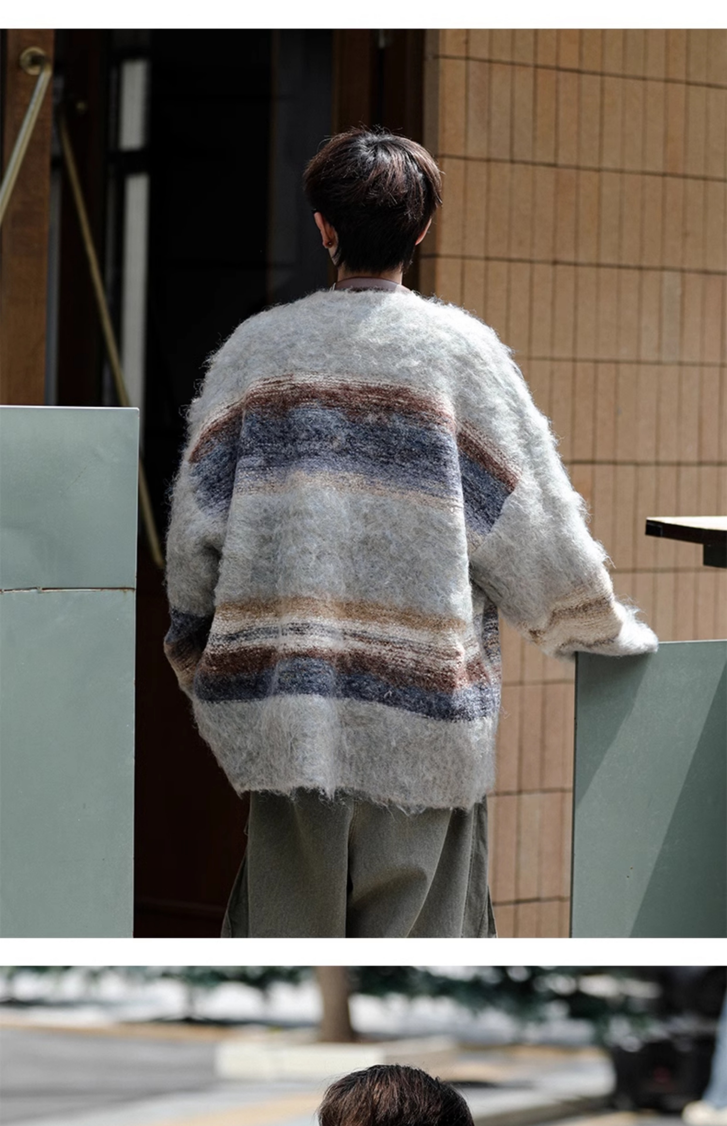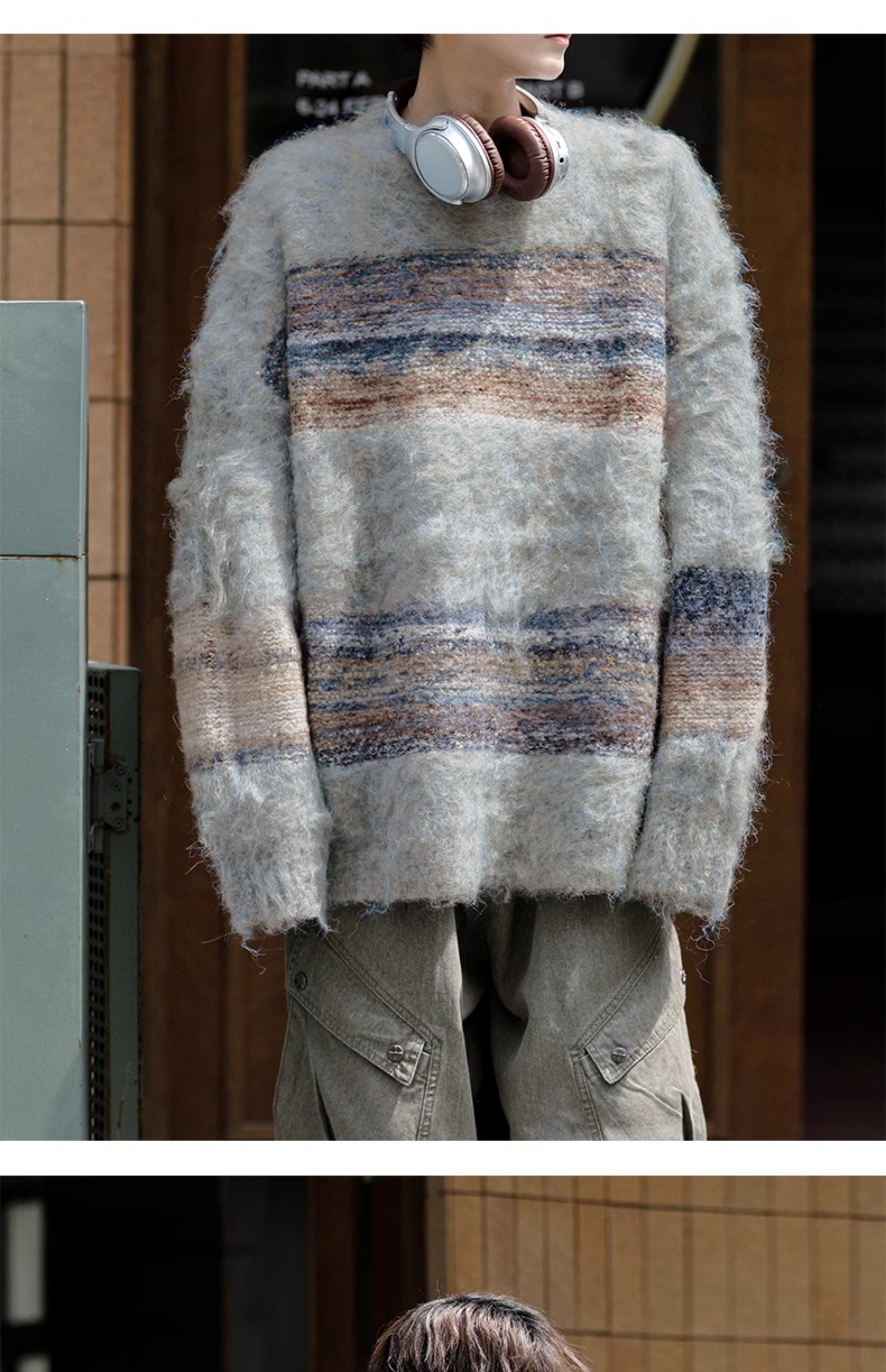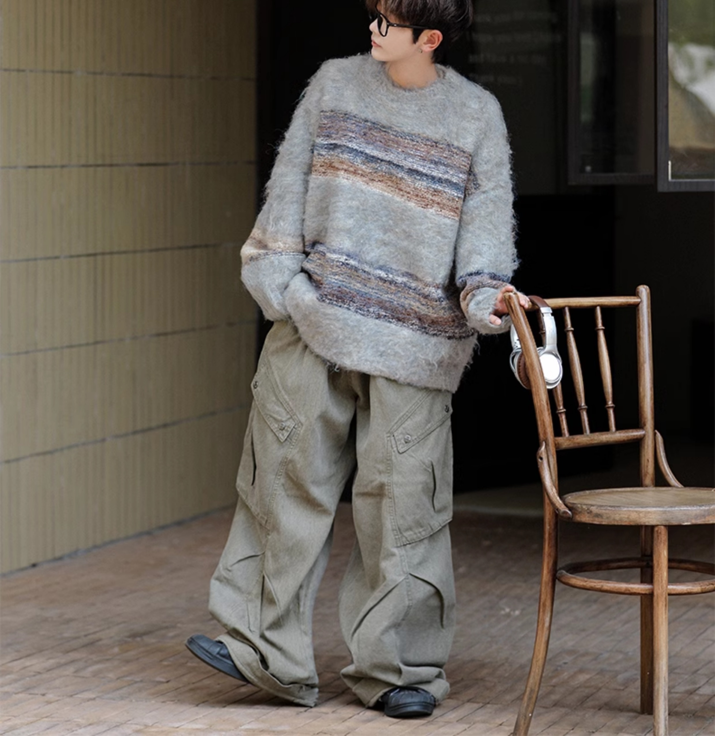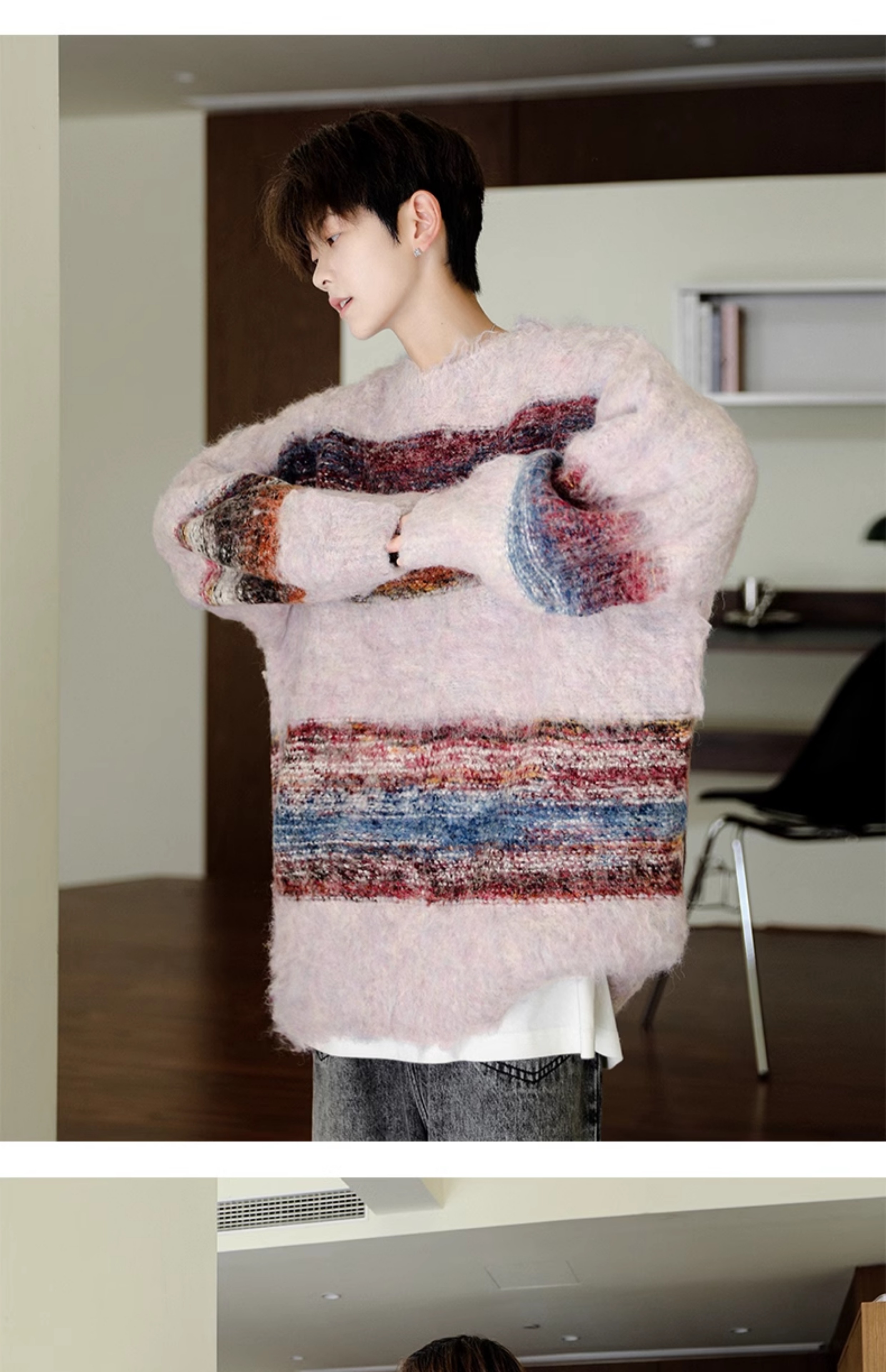 美式chic復古慵懶風漸變圓領毛衣男秋冬季潮牌情侶小衆寬松針織衫