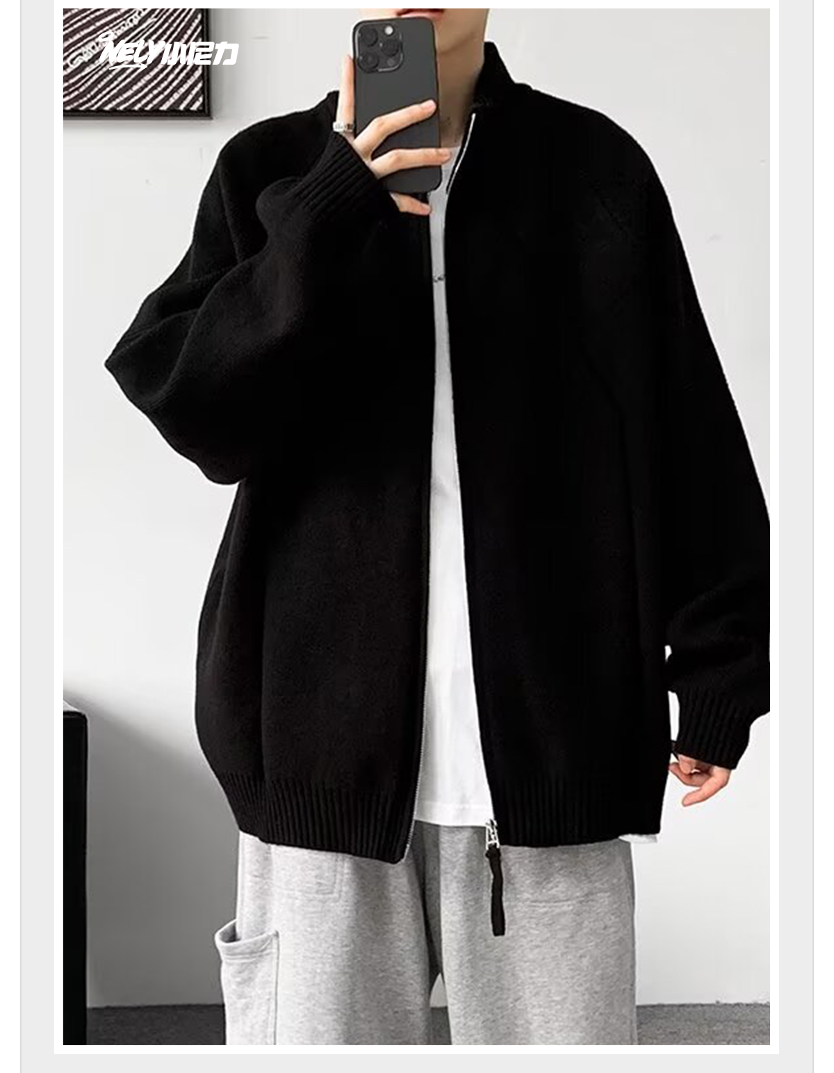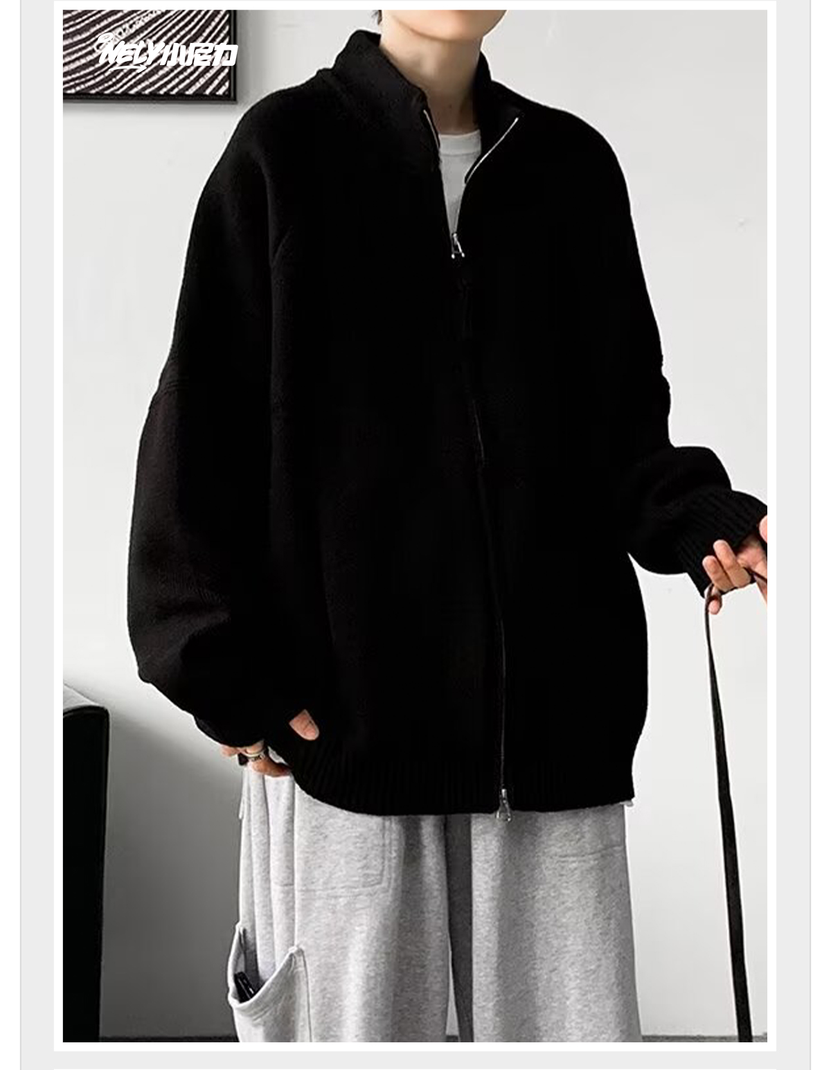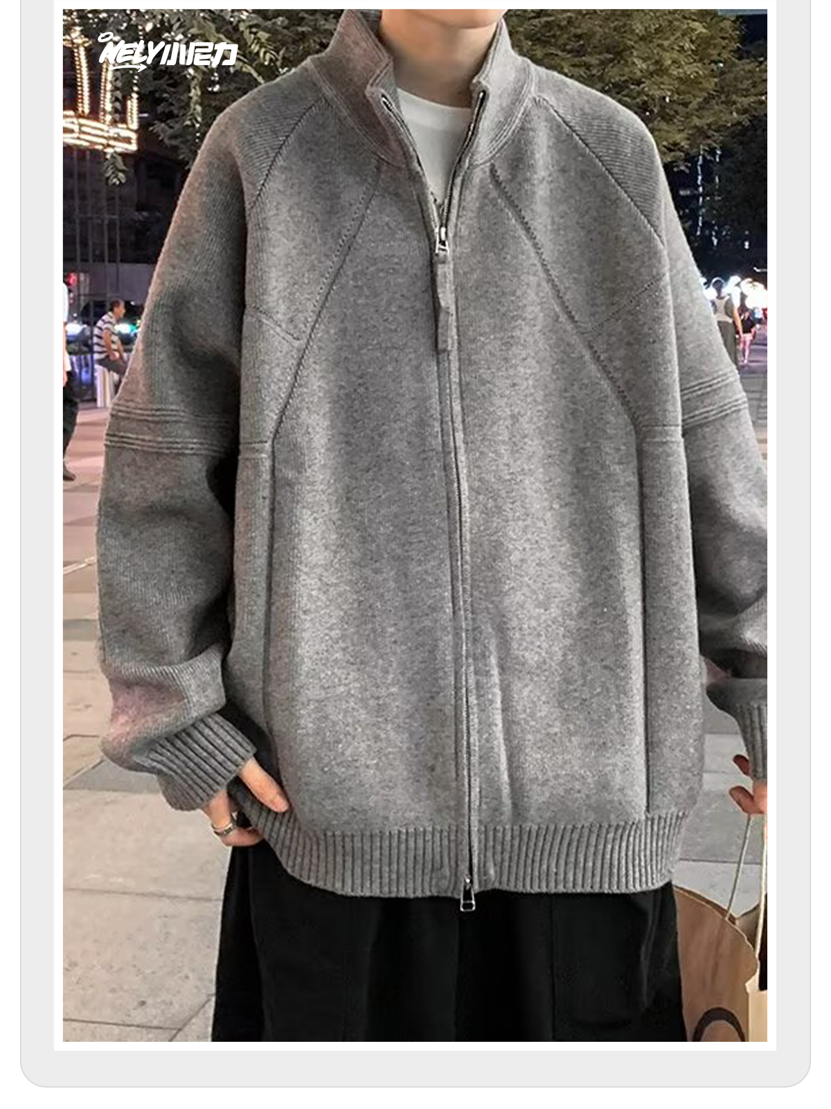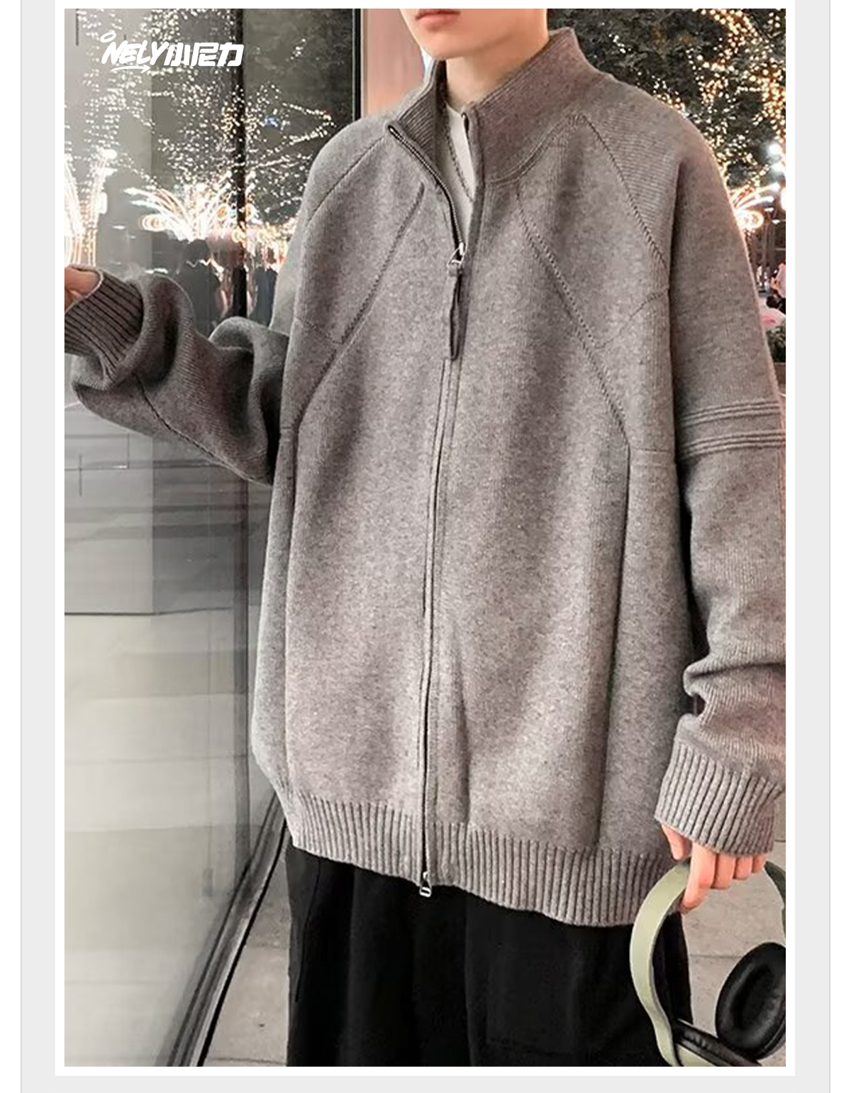 NELY小尼力秋冬慵懶風簡約百搭拉鍊立領毛衣男女休閒情侶針織開衫