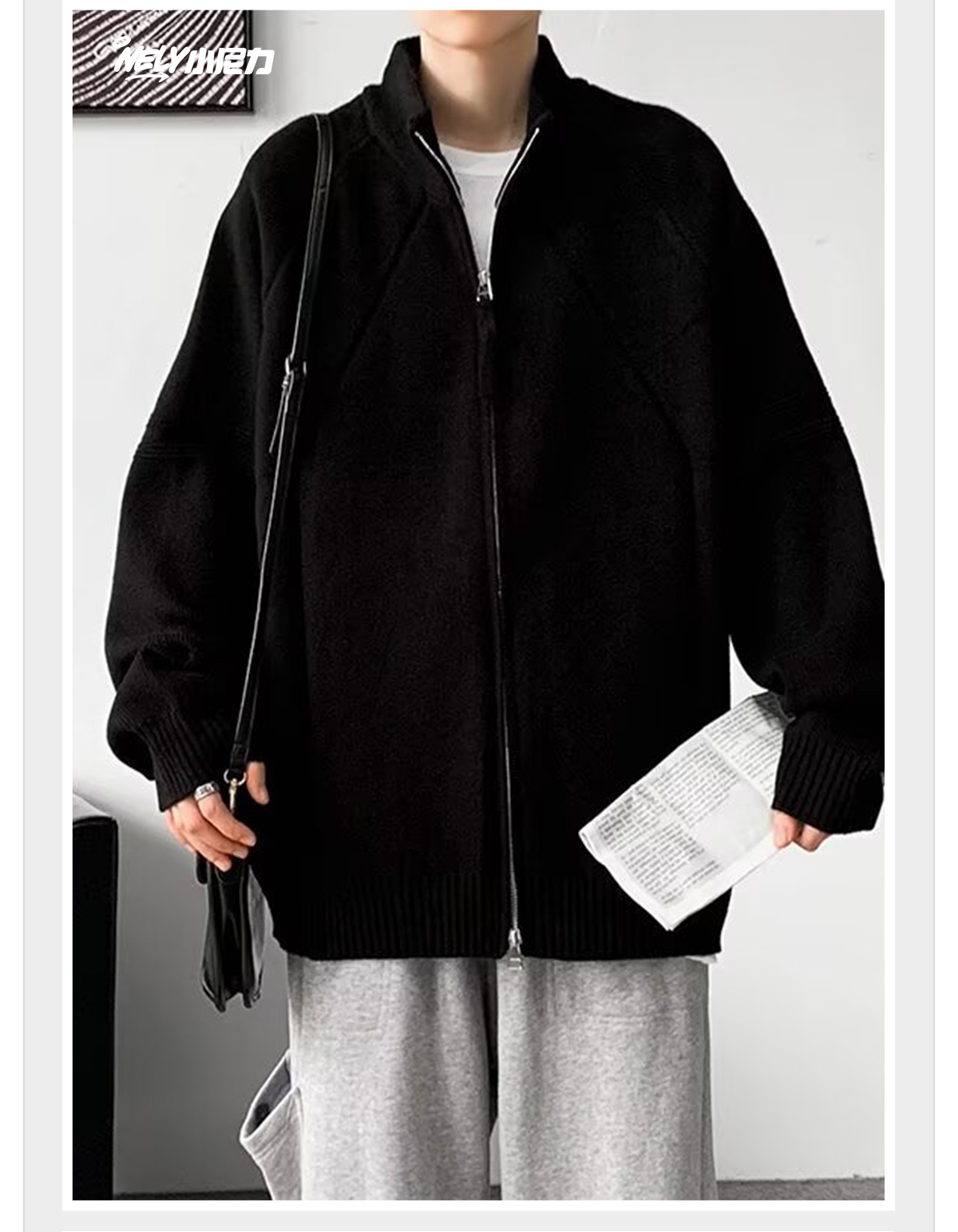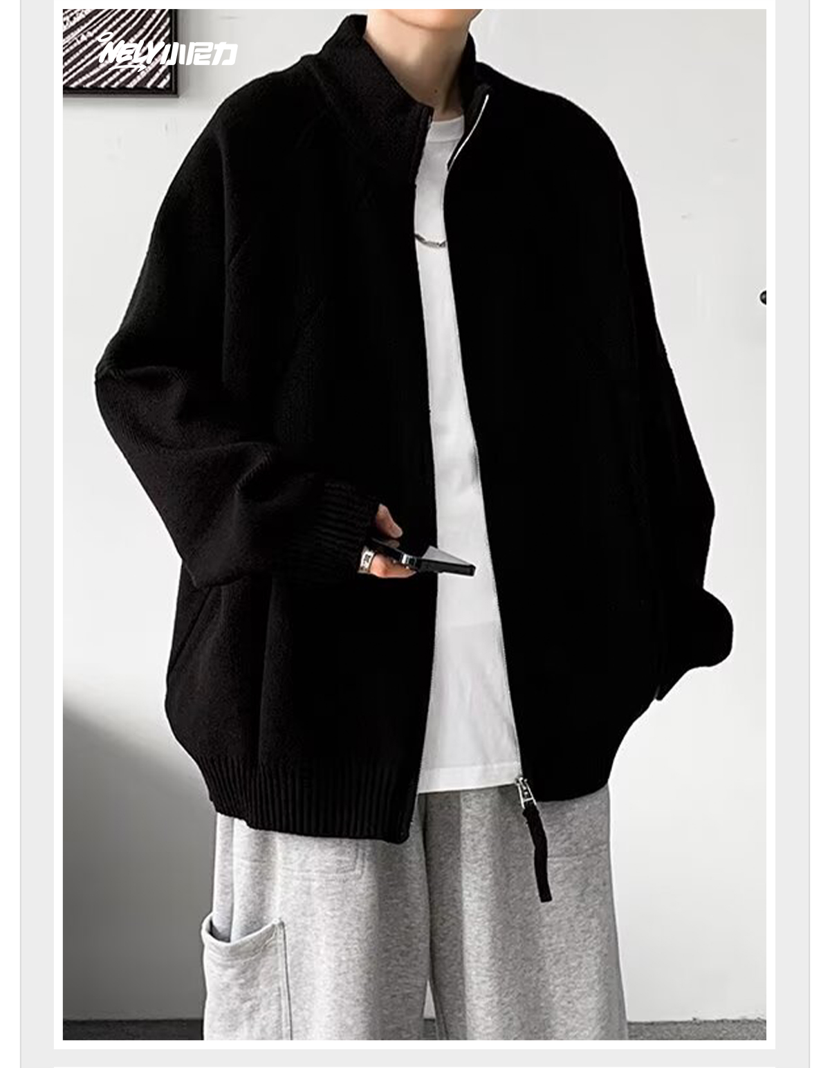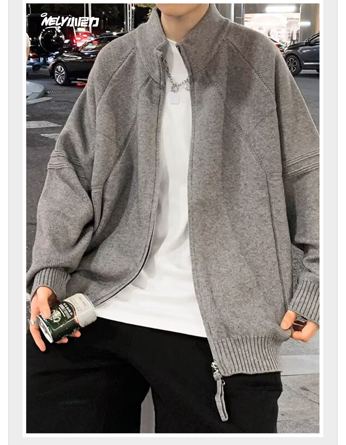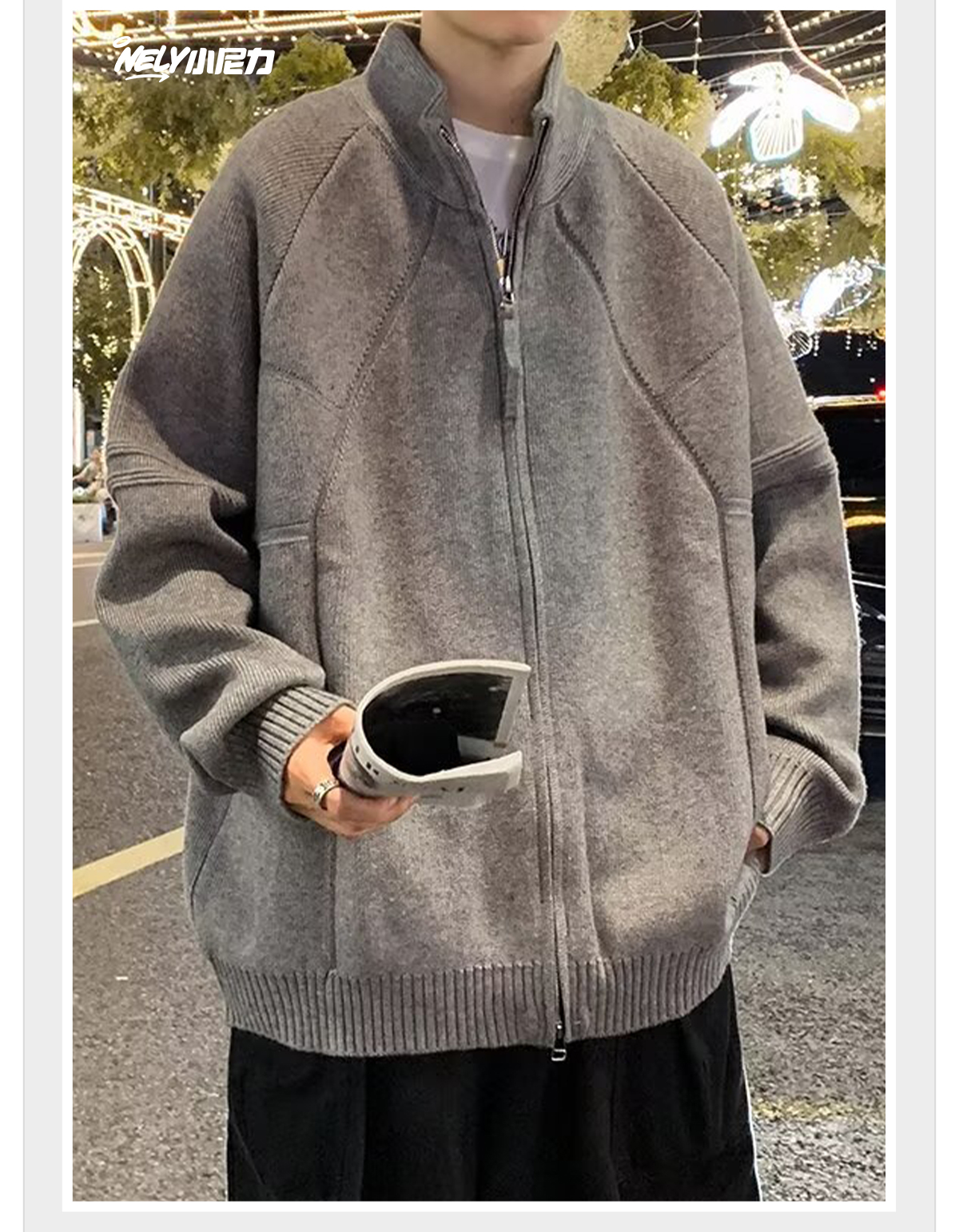 NELY小尼力秋冬慵懶風簡約百搭拉鍊立領毛衣男女休閒情侶針織開衫