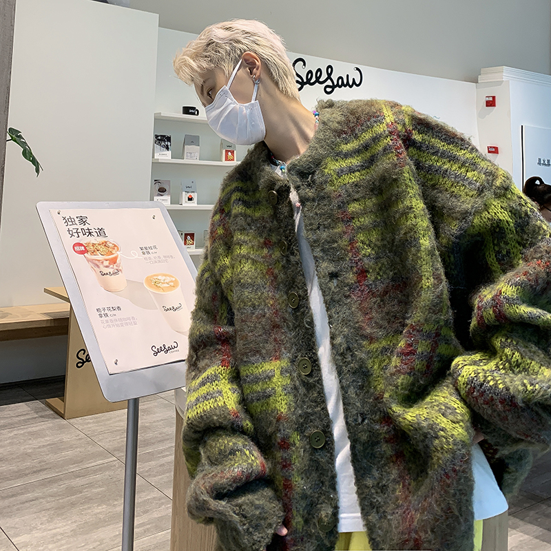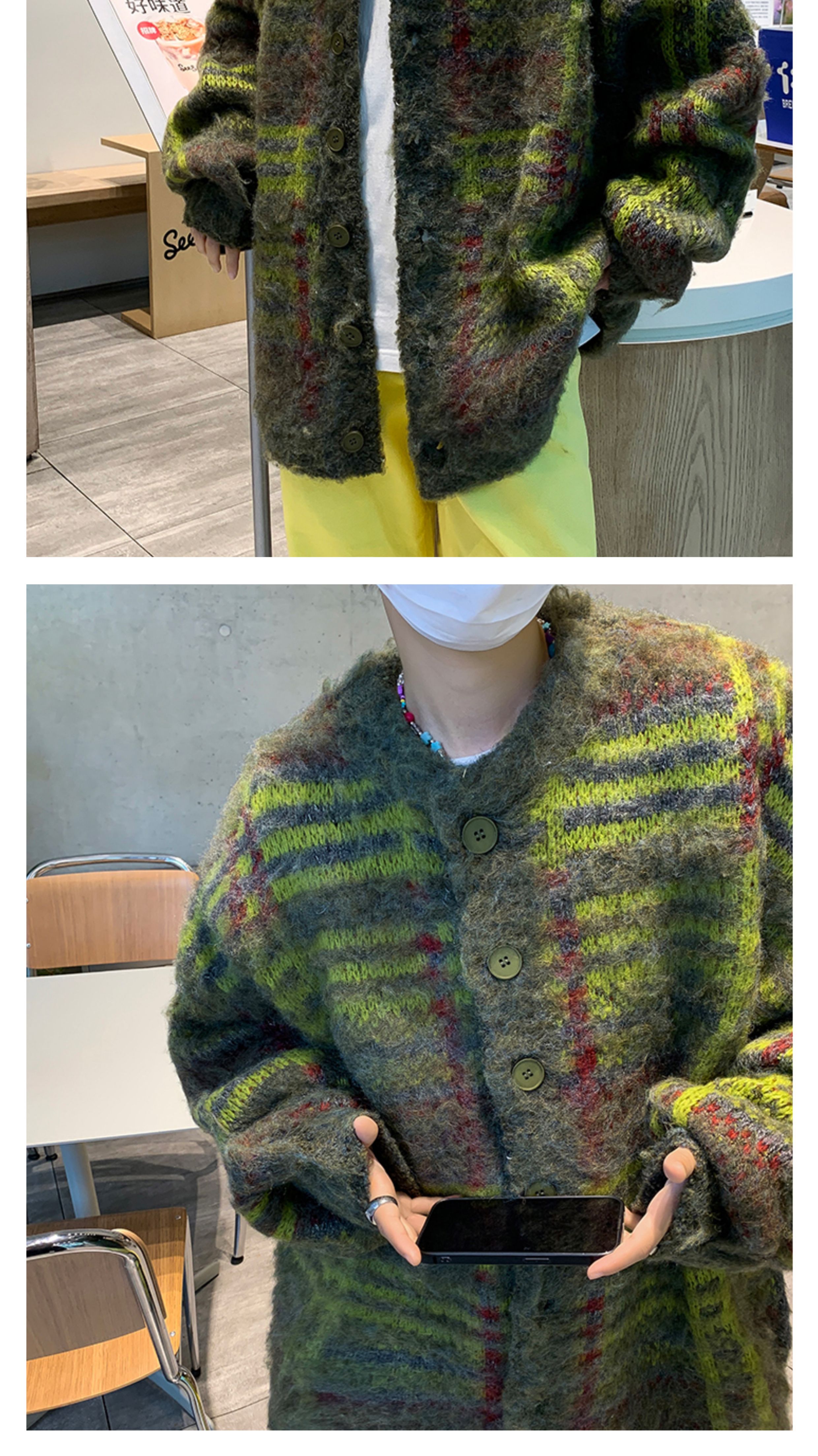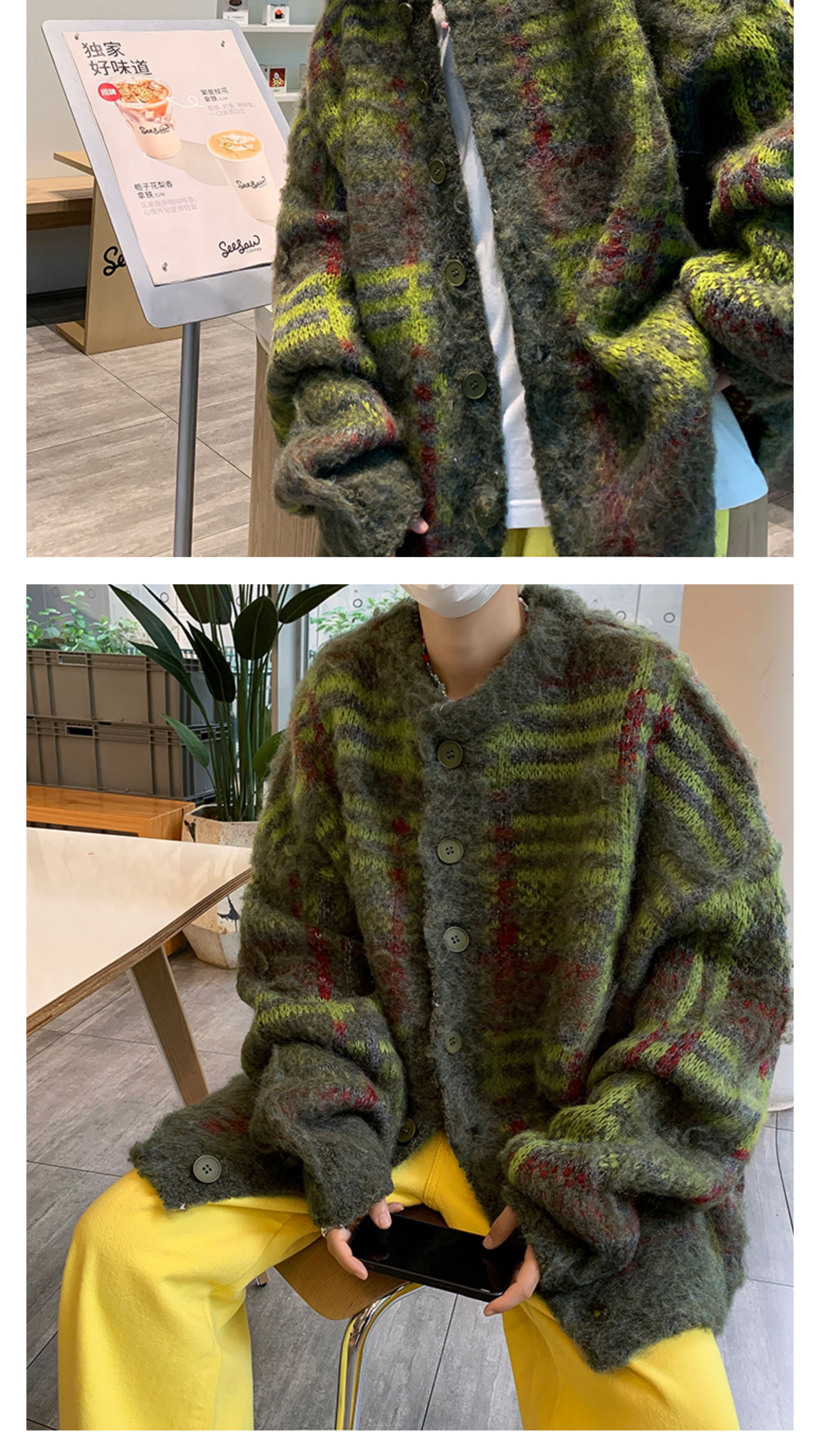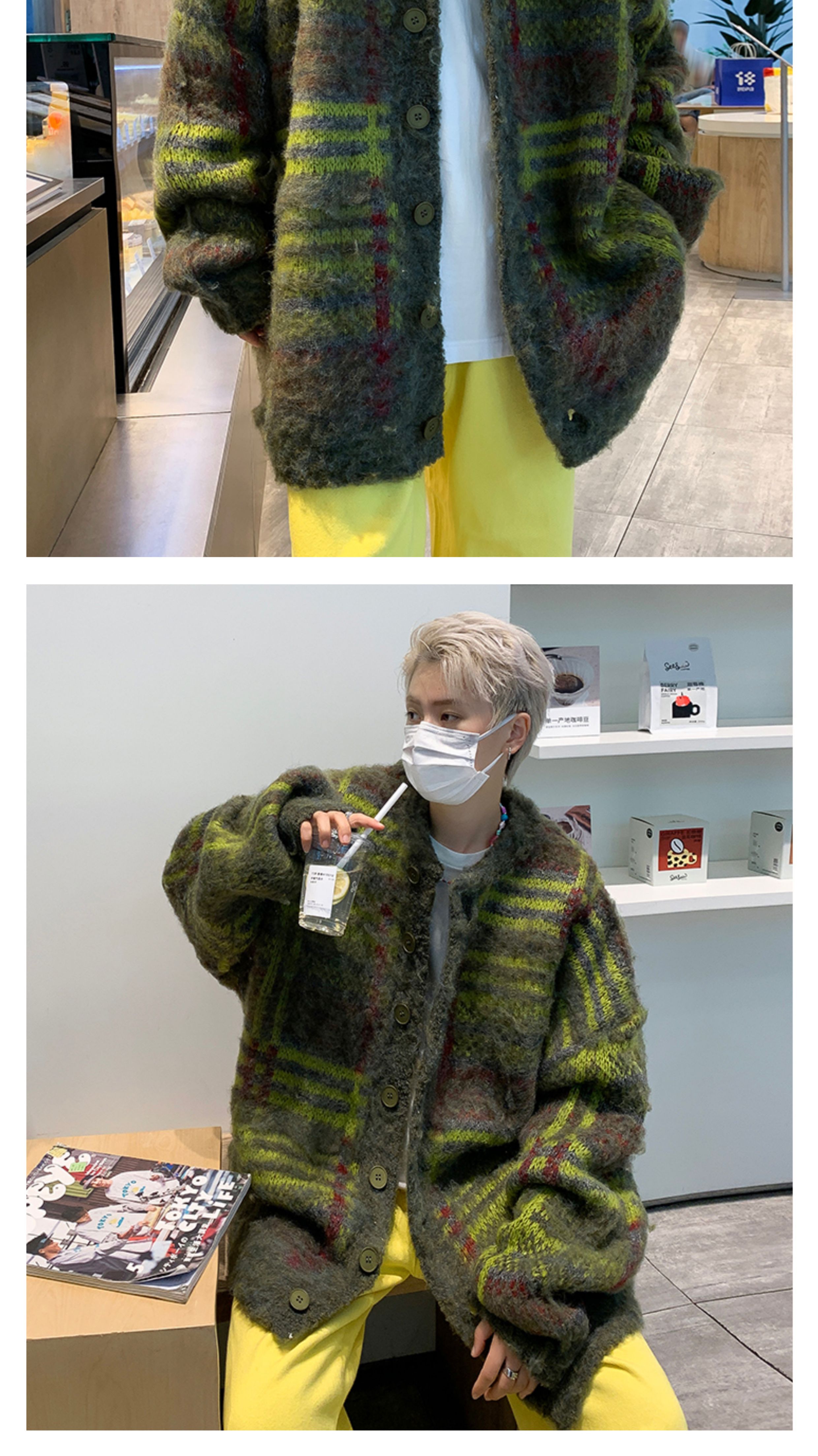 美式復古彩色編織馬海毛開衫毛衣男女潮牌情侶外套撞色拼接針織衫