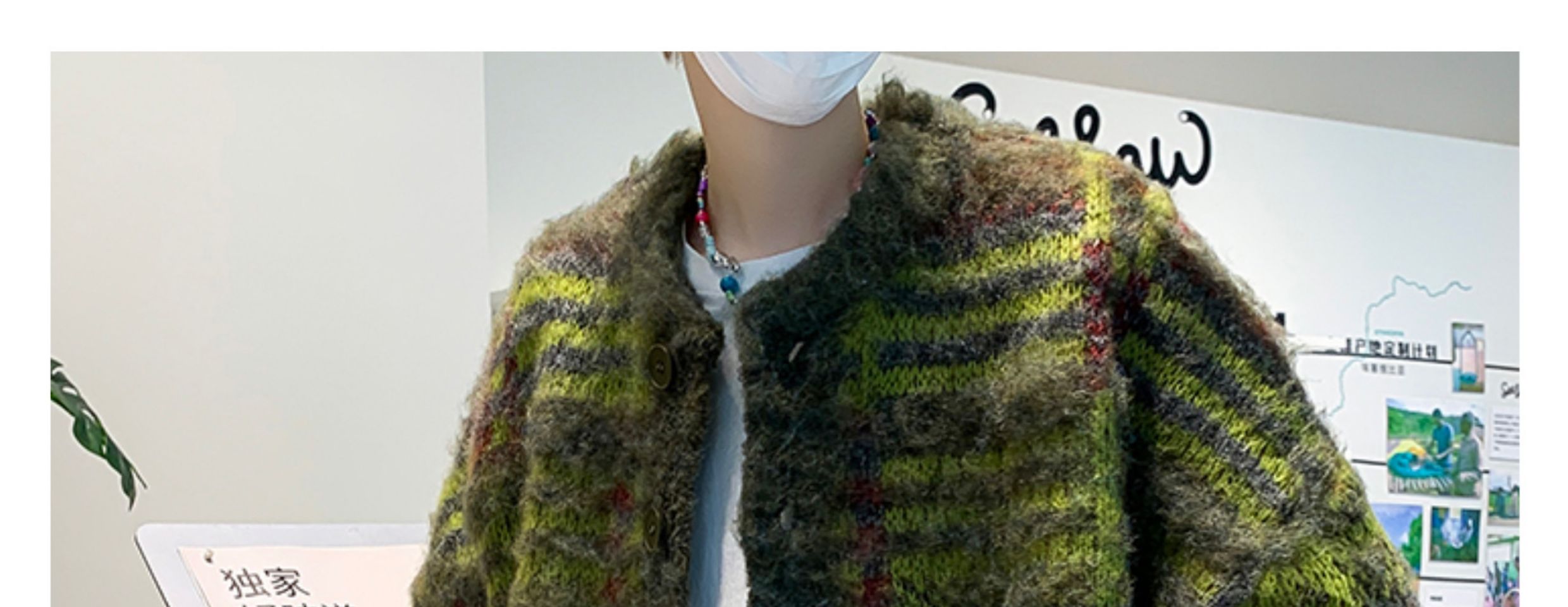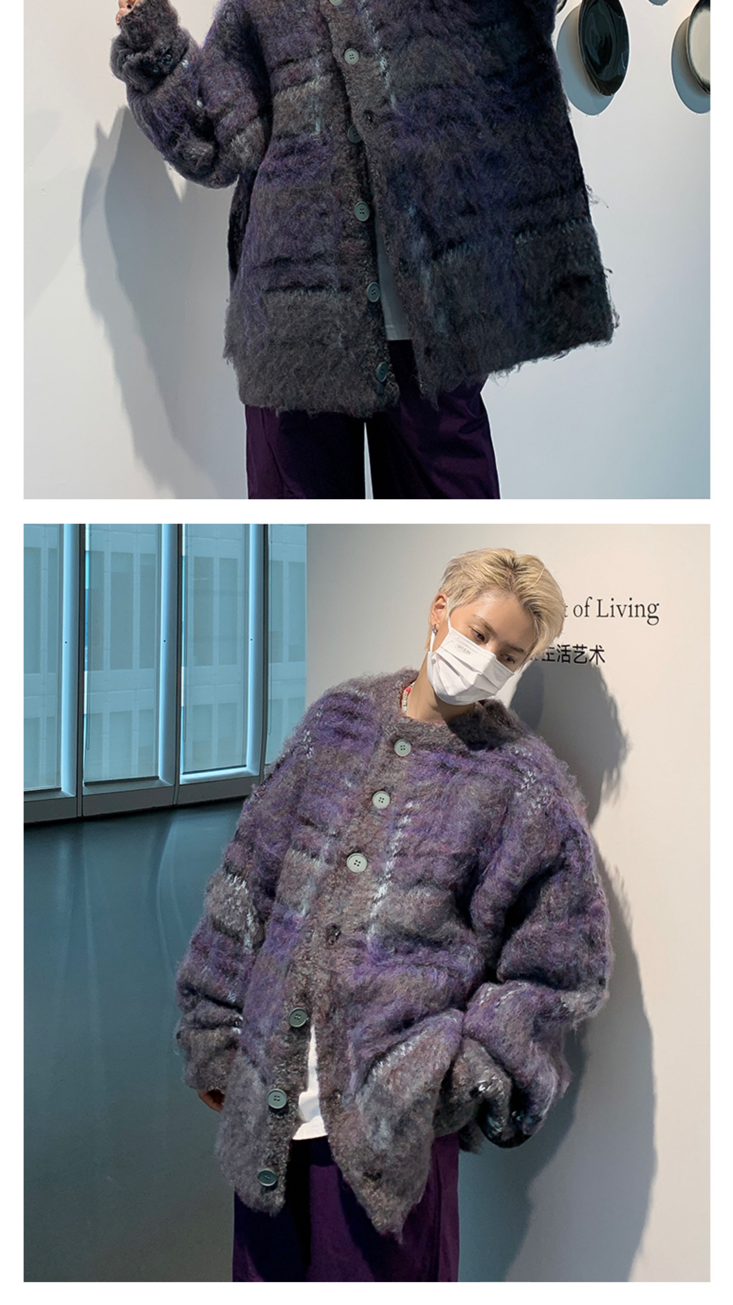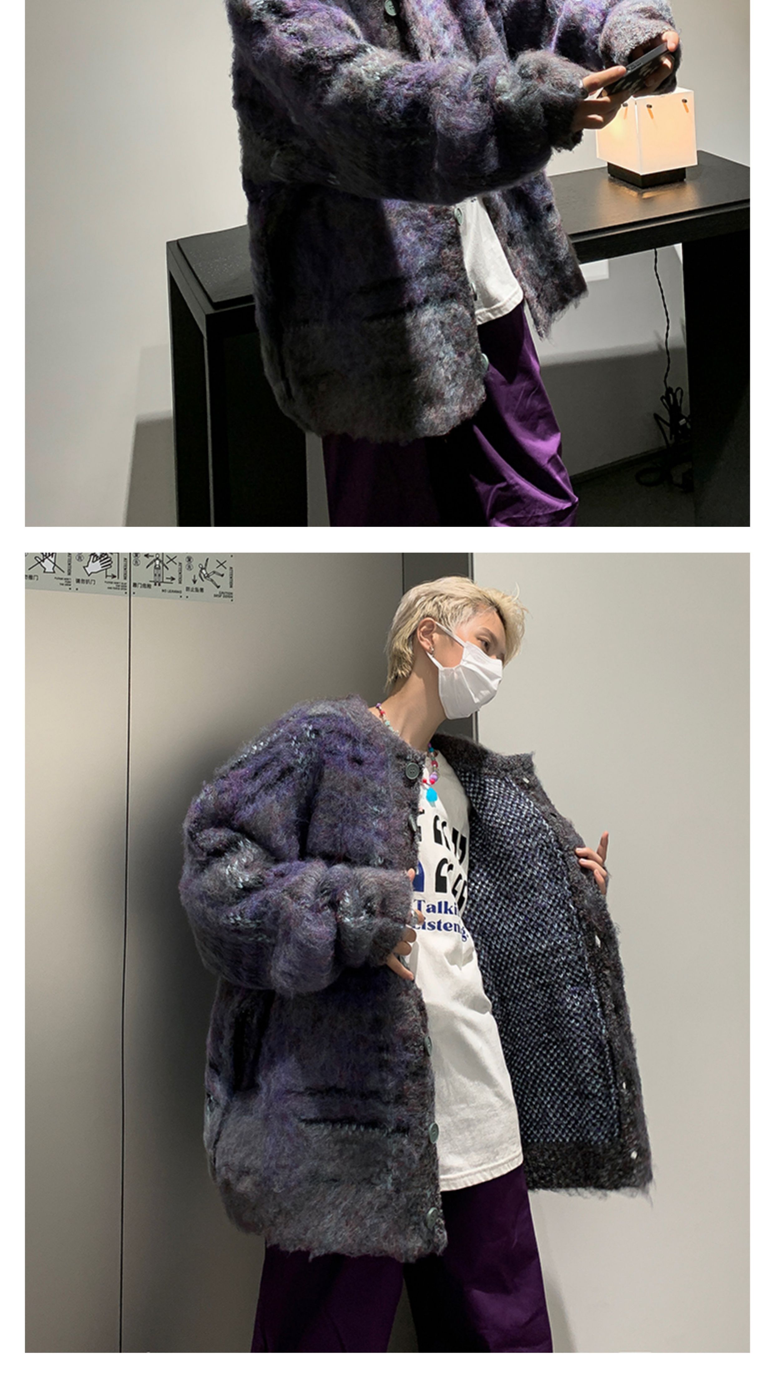 美式復古彩色編織馬海毛開衫毛衣男女潮牌情侶外套撞色拼接針織衫