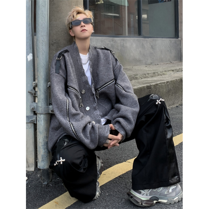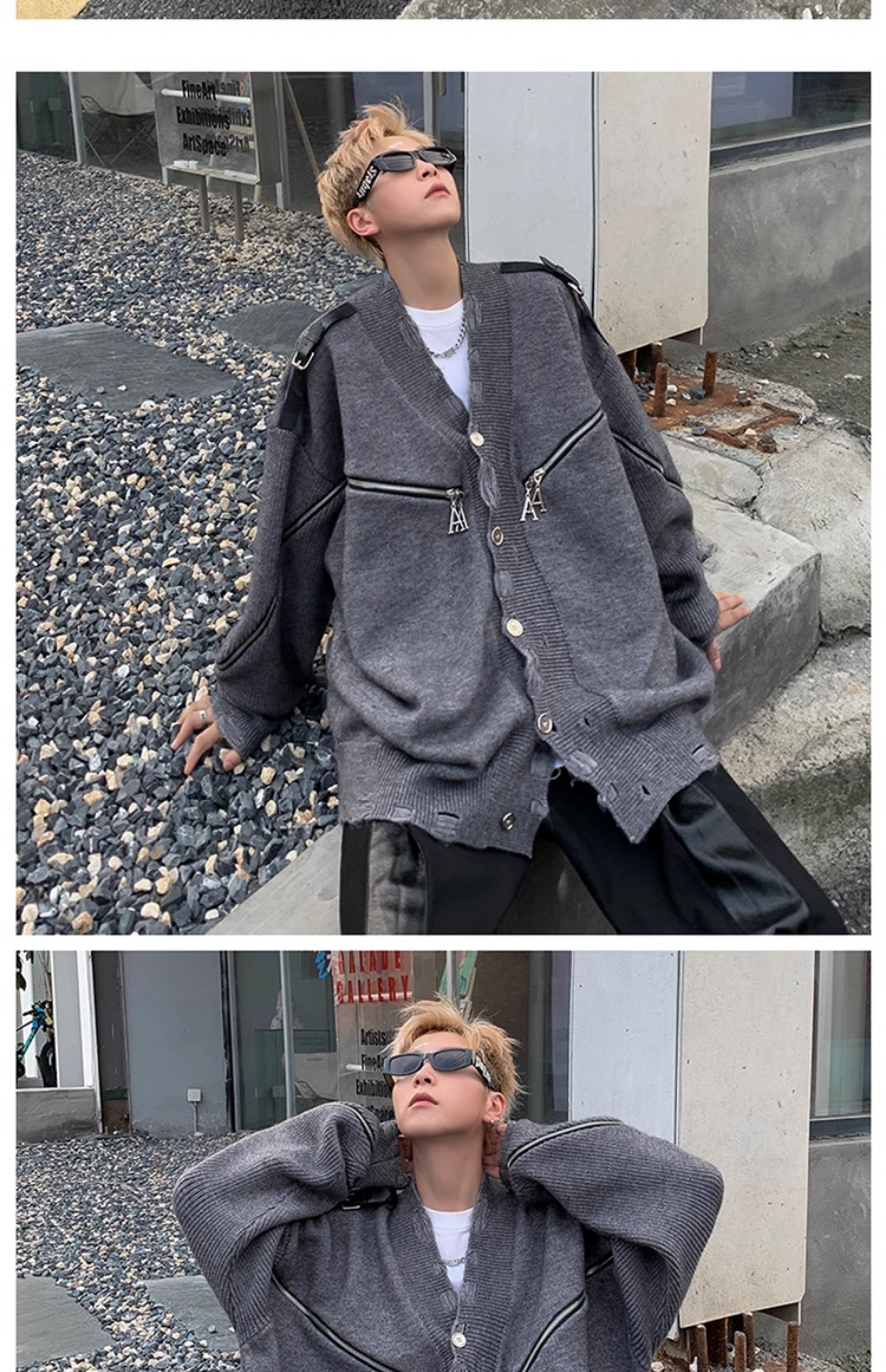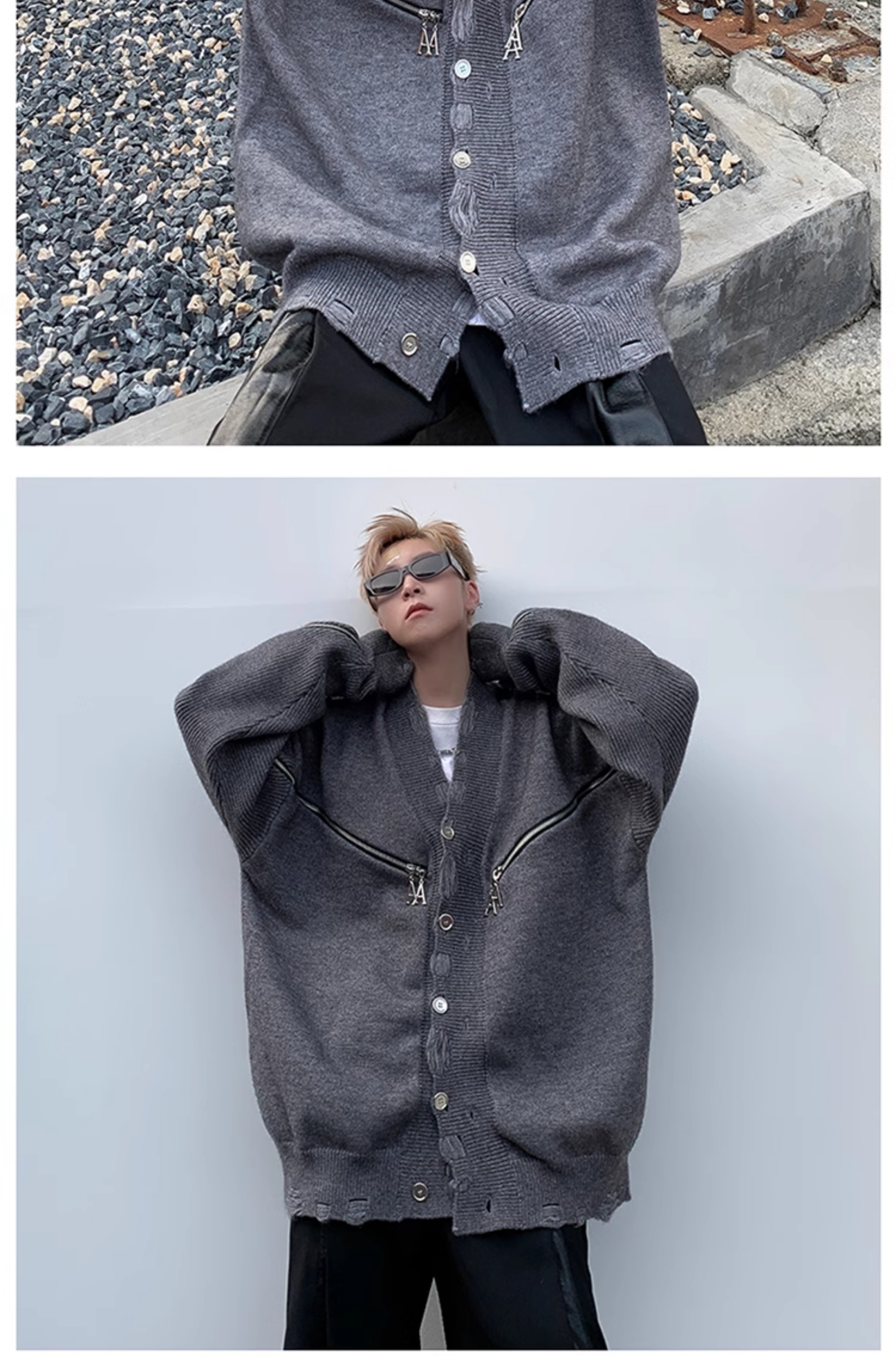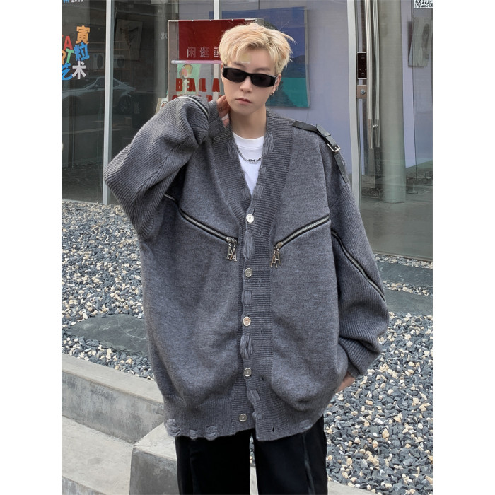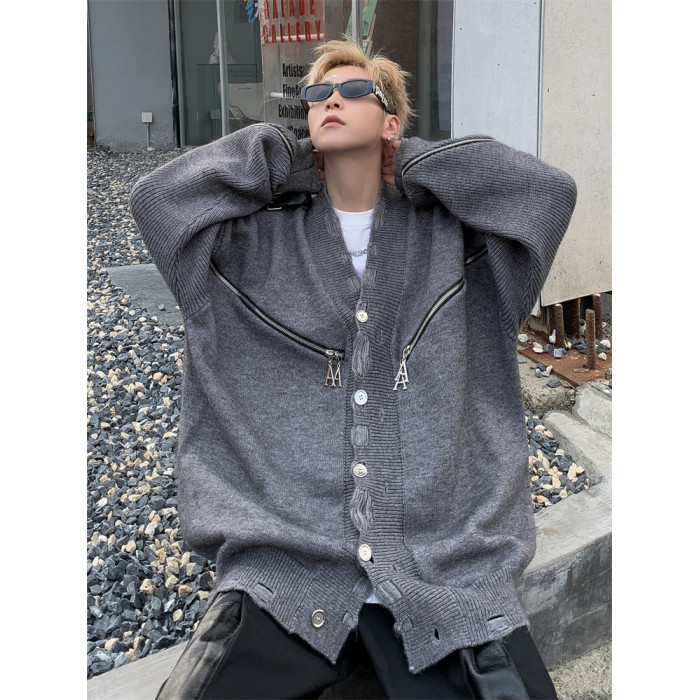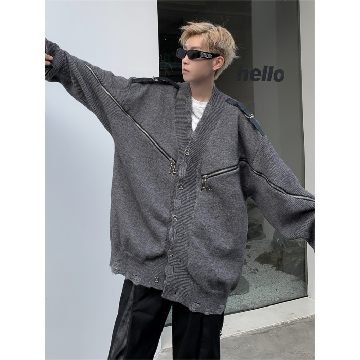 小衆解搆拉鍊開衫毛衣男秋冬灰色重工破壞美式設計感復古針織外套