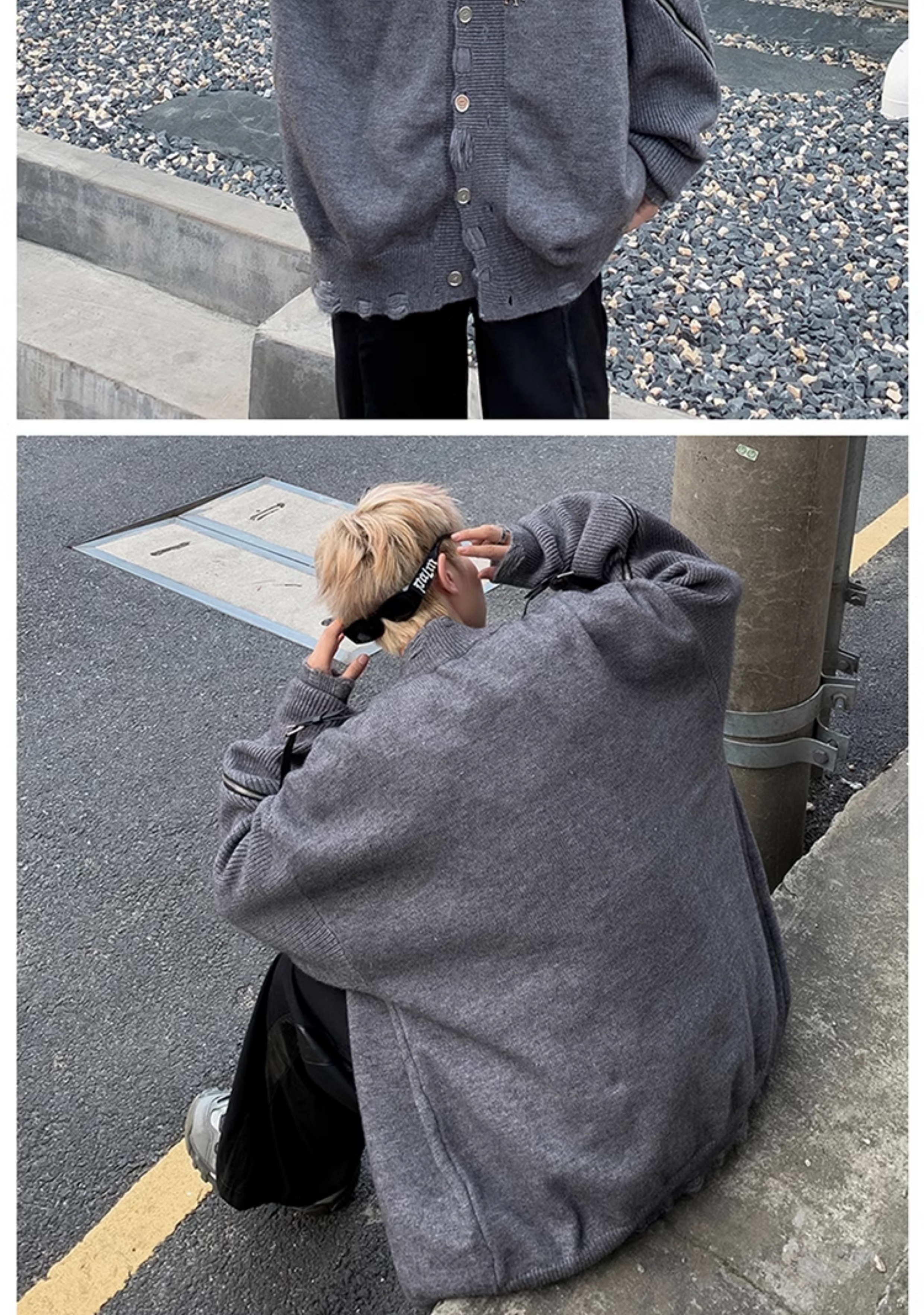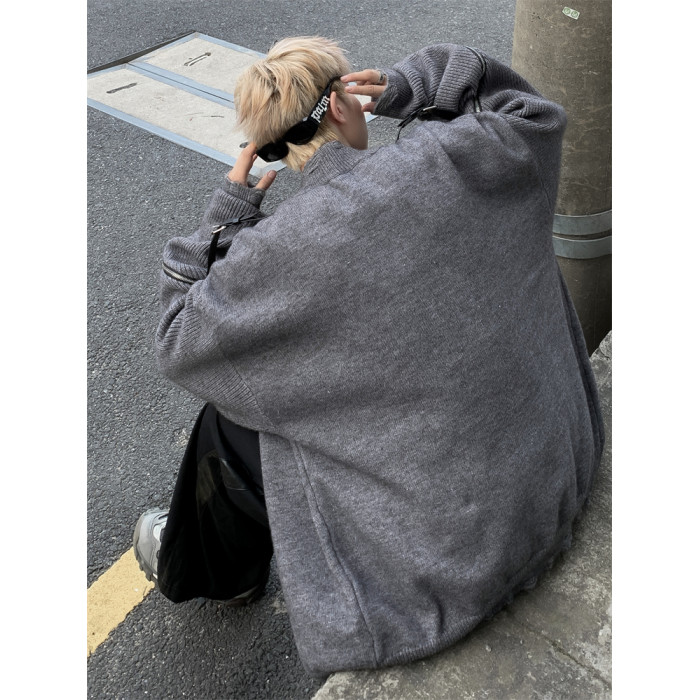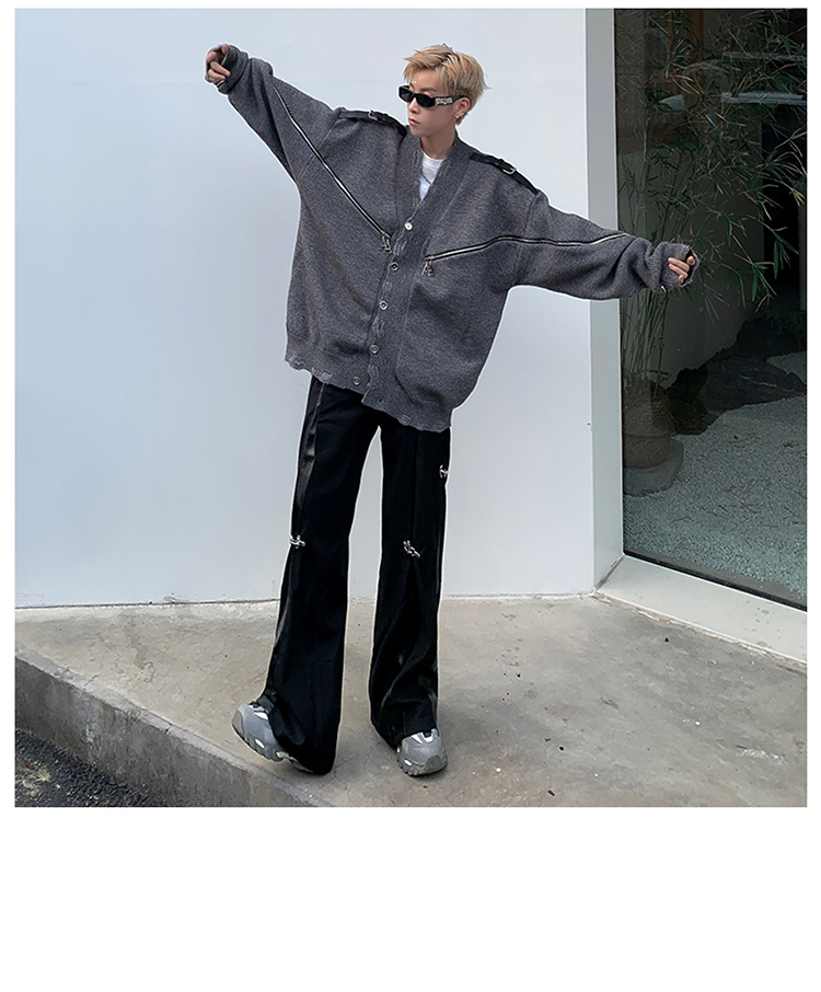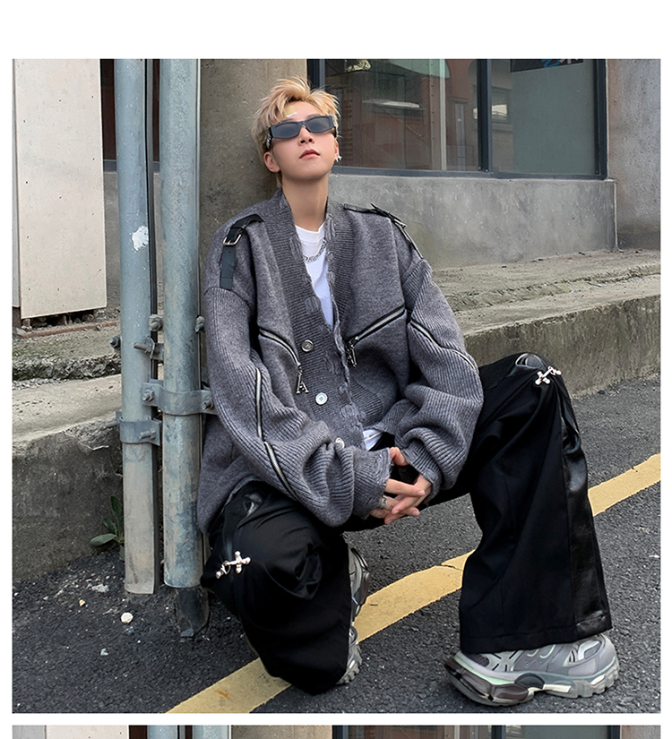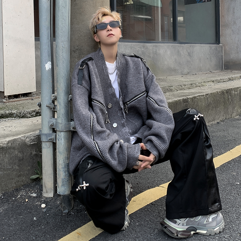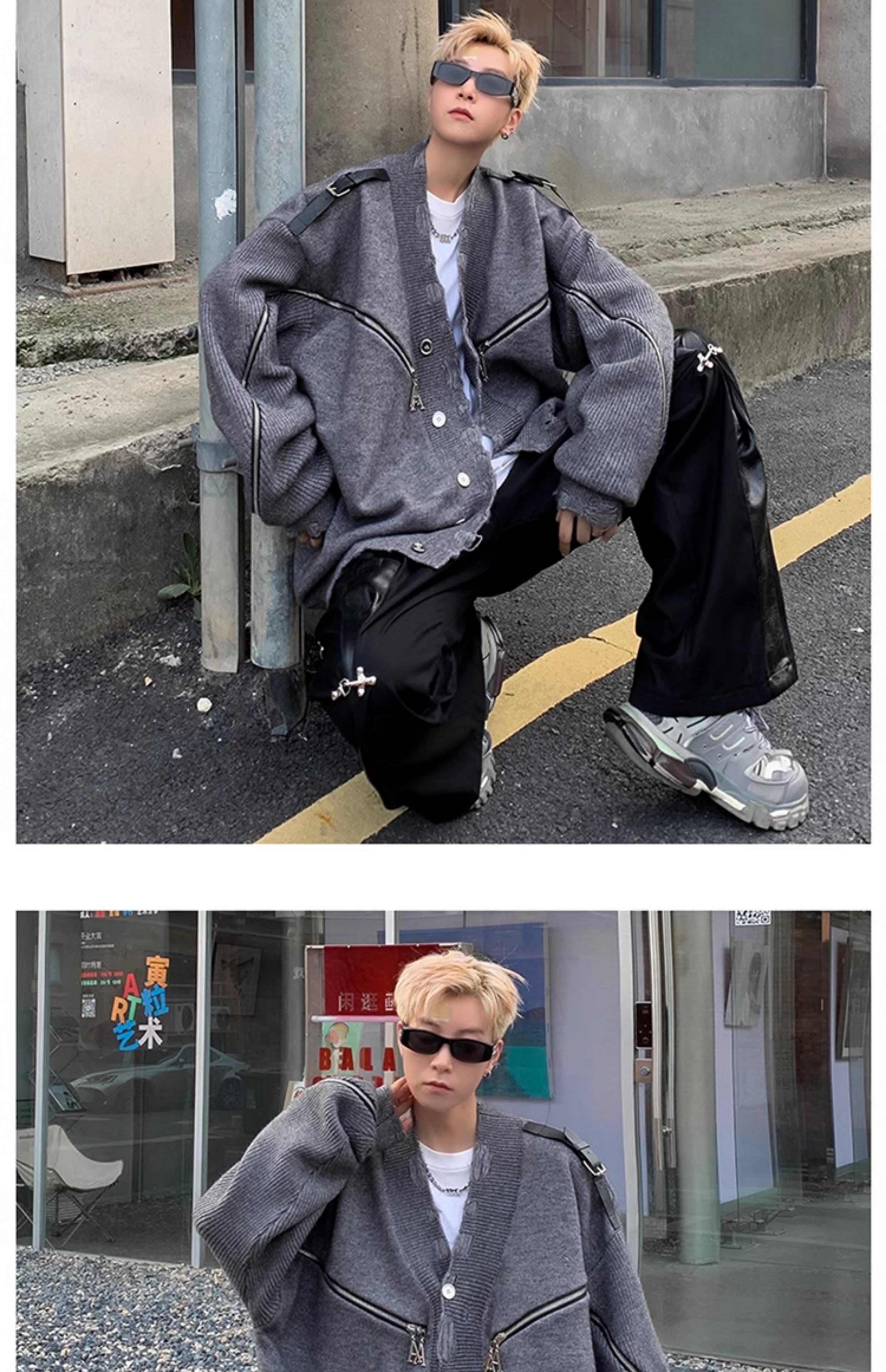 小衆解搆拉鍊開衫毛衣男秋冬灰色重工破壞美式設計感復古針織外套