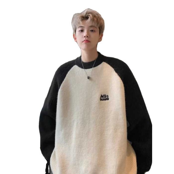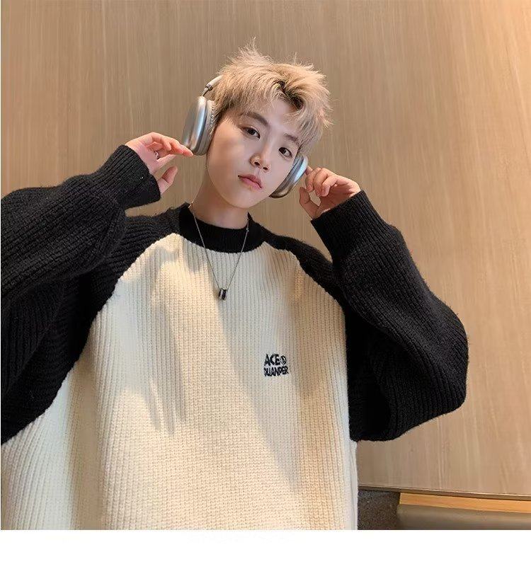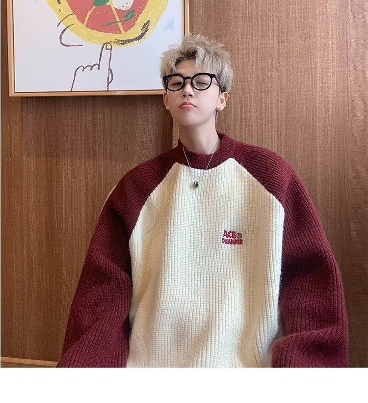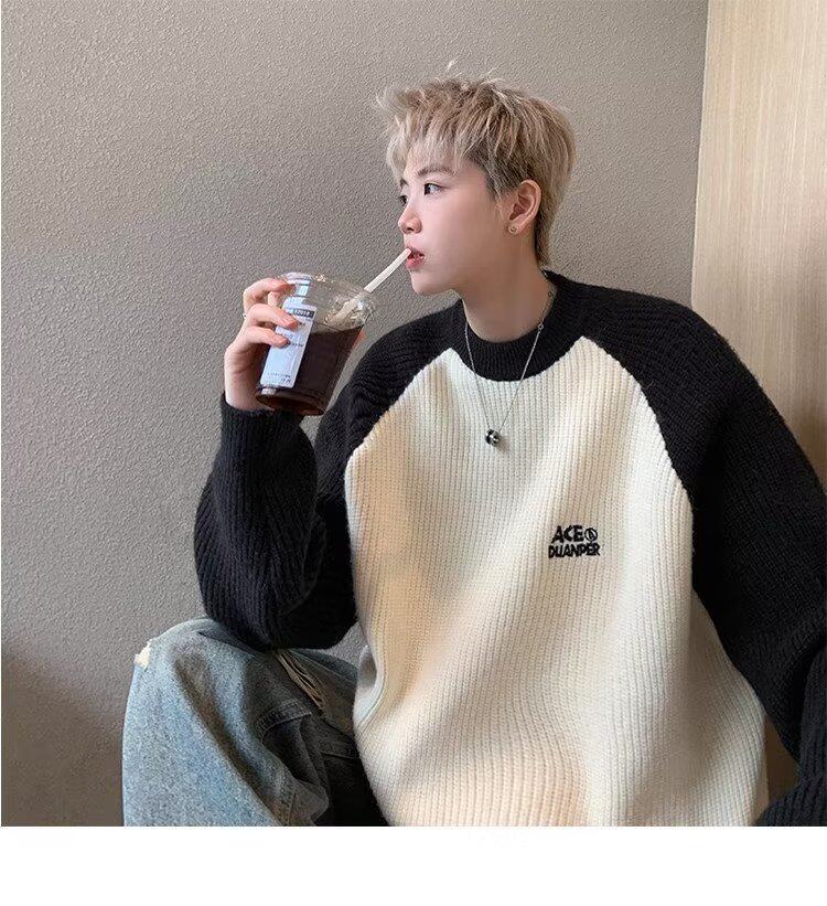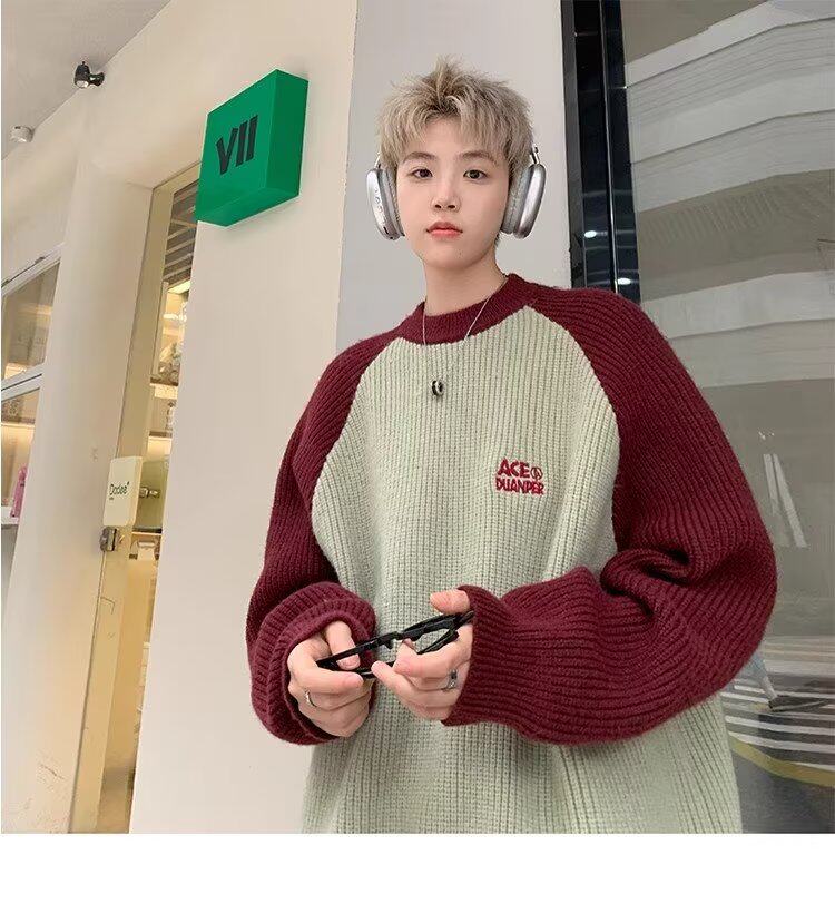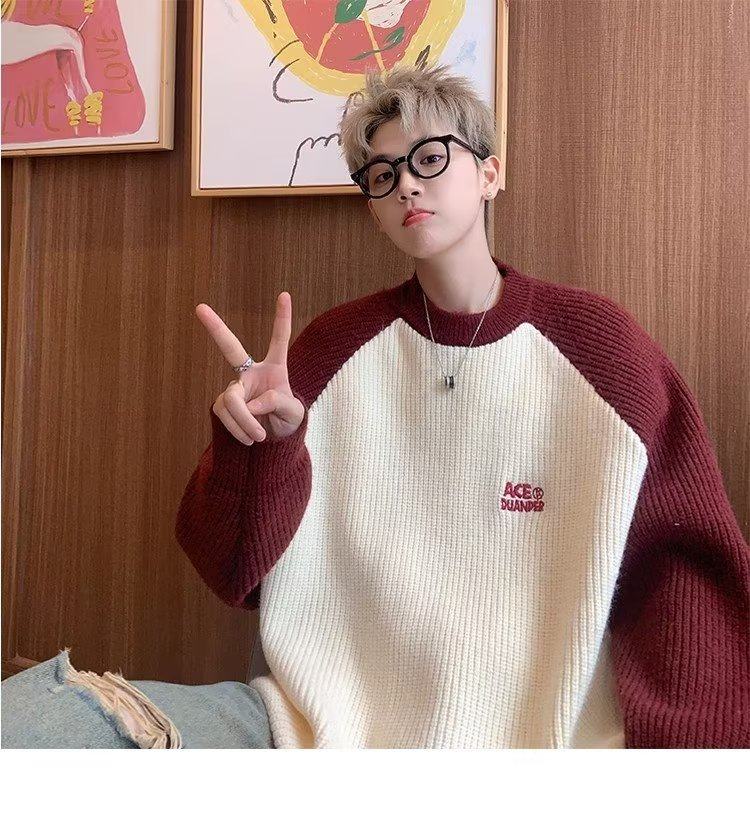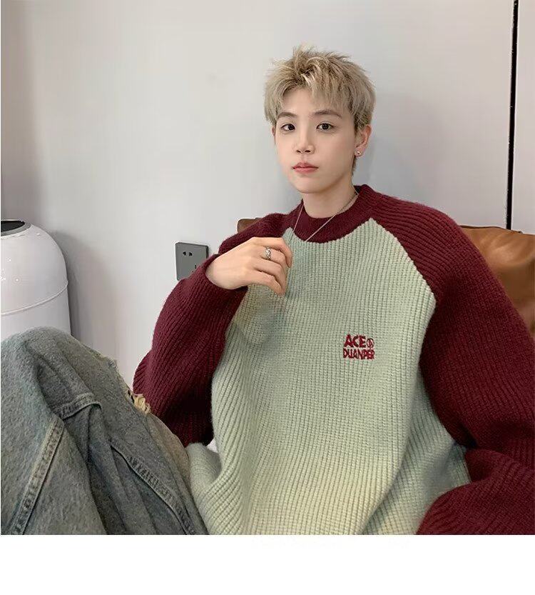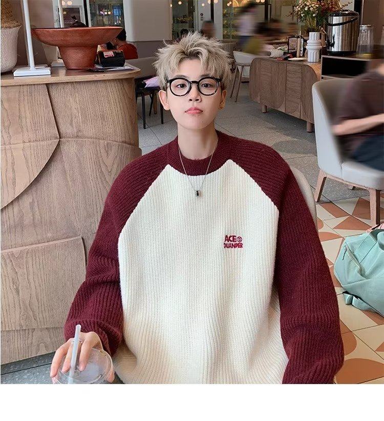 美式潮牌插色毛衣男秋冬季日系慵嬾復古針織衫拼接青少年線衣外套