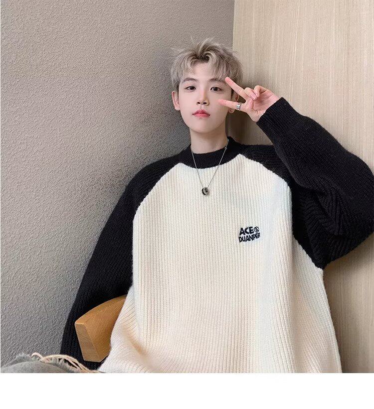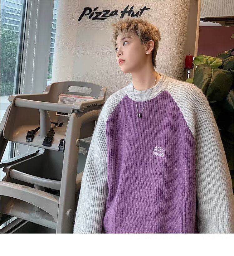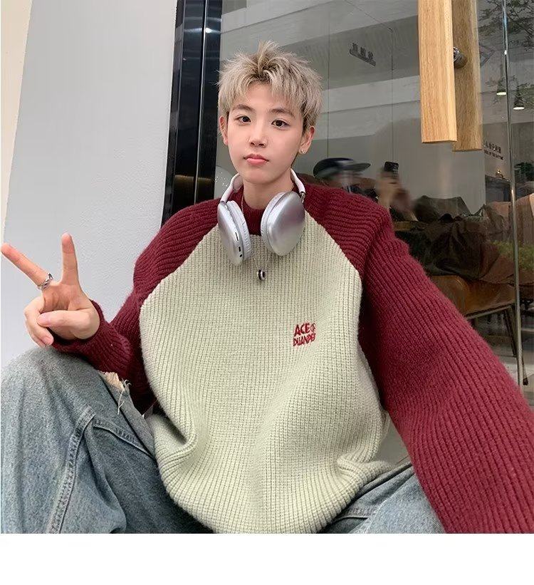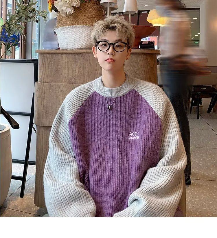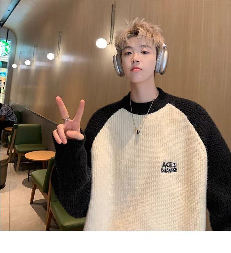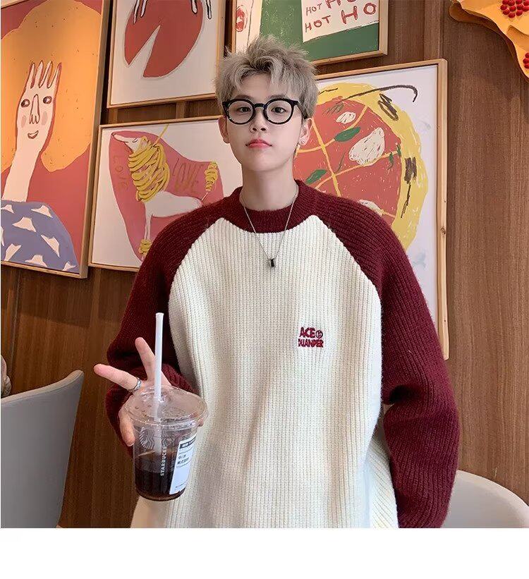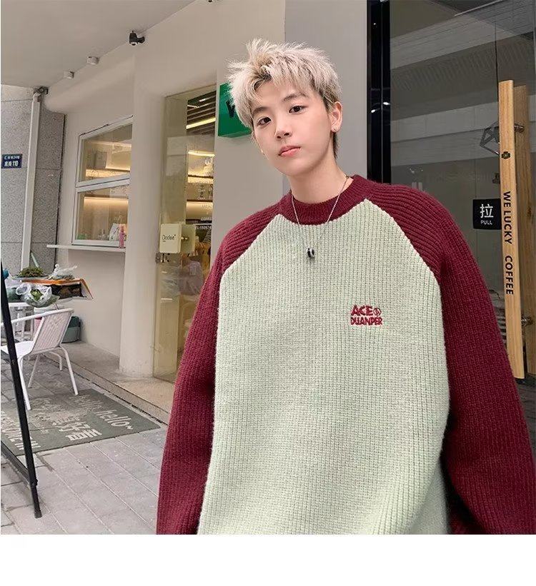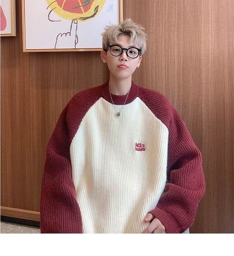 美式潮牌插色毛衣男秋冬季日系慵嬾復古針織衫拼接青少年線衣外套
