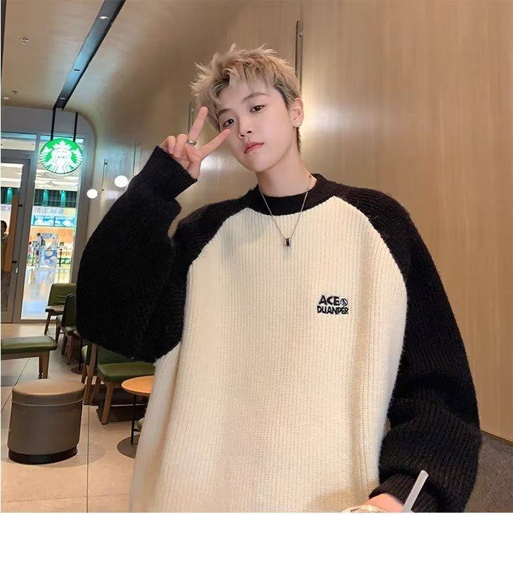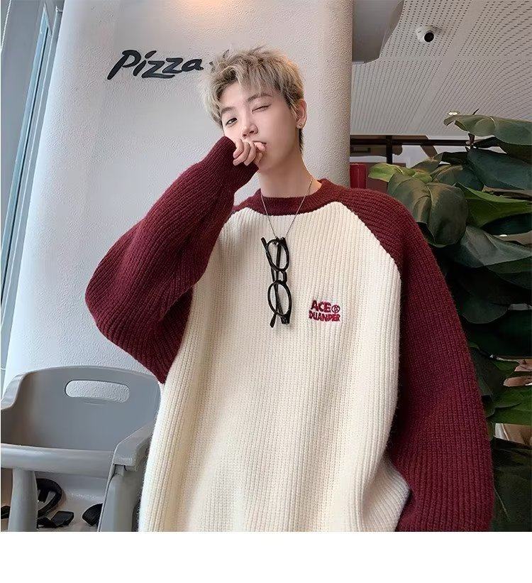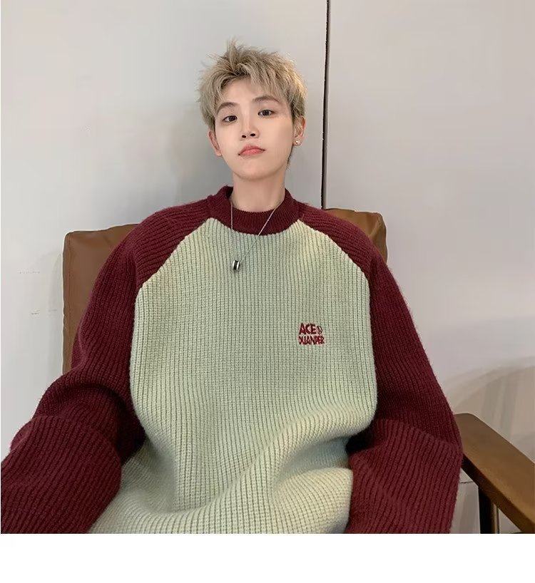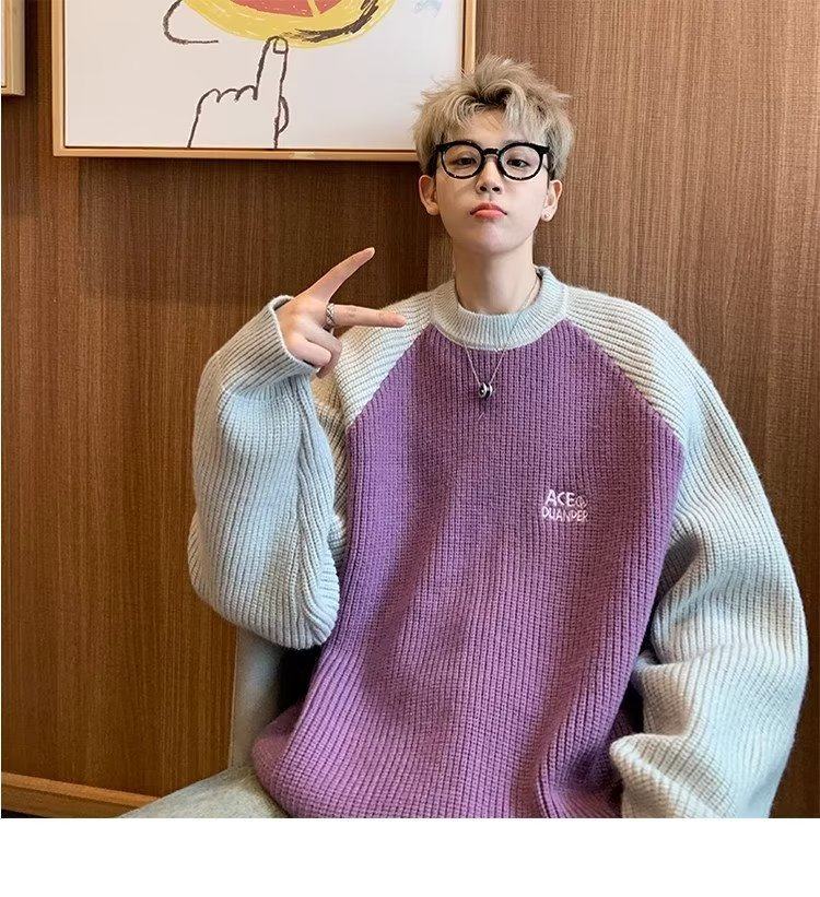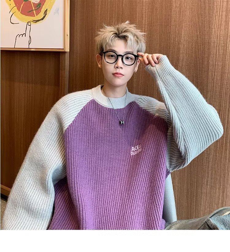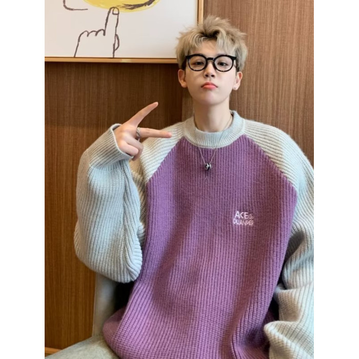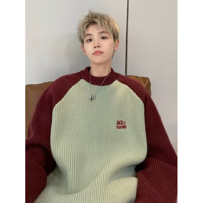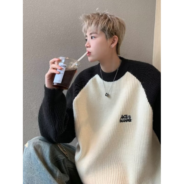 美式潮牌插色毛衣男秋冬季日系慵嬾復古針織衫拼接青少年線衣外套