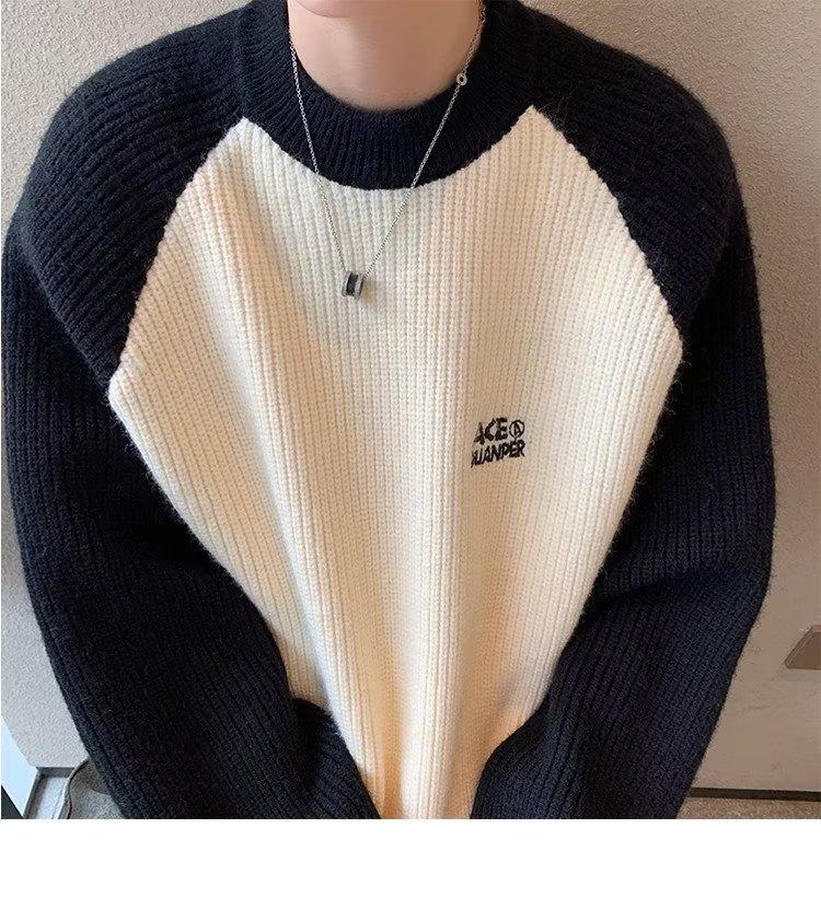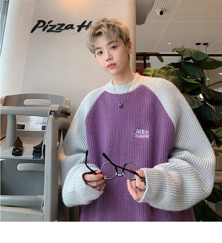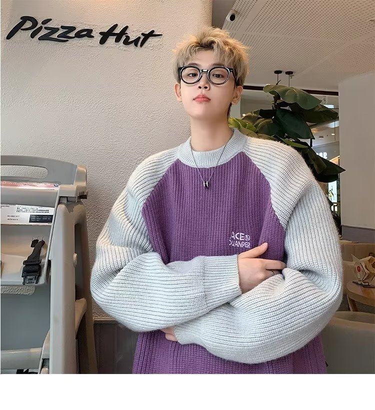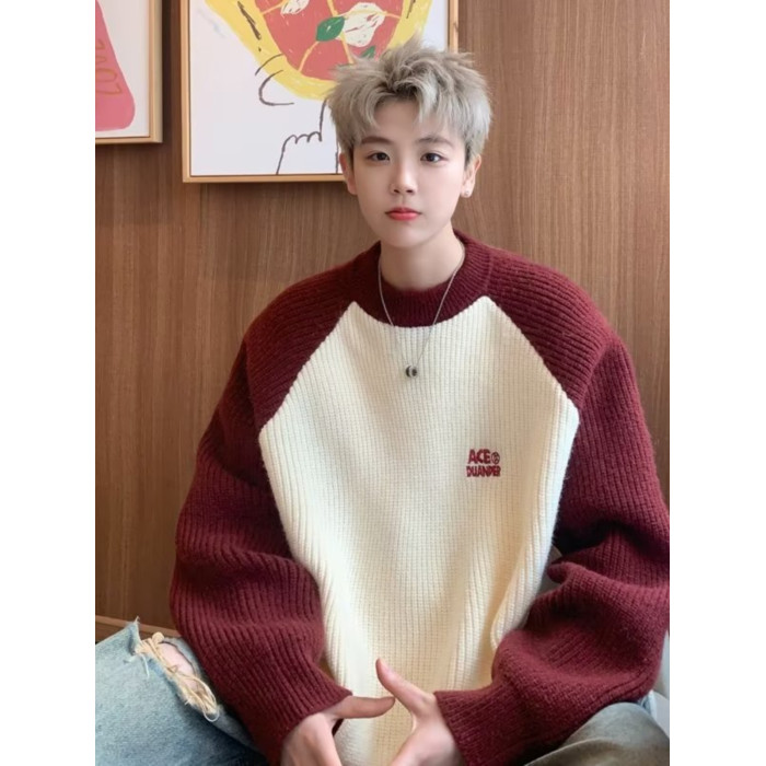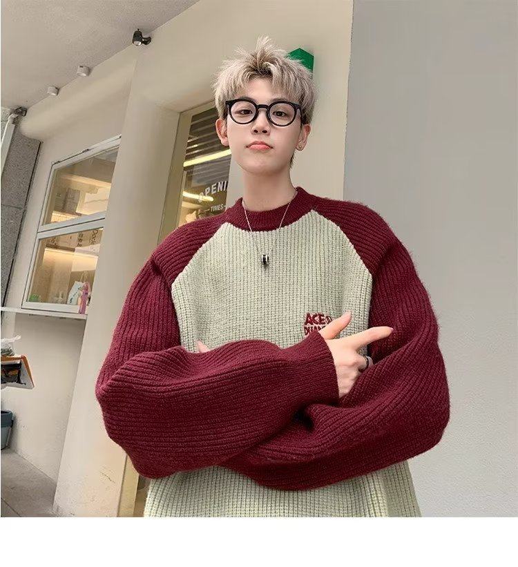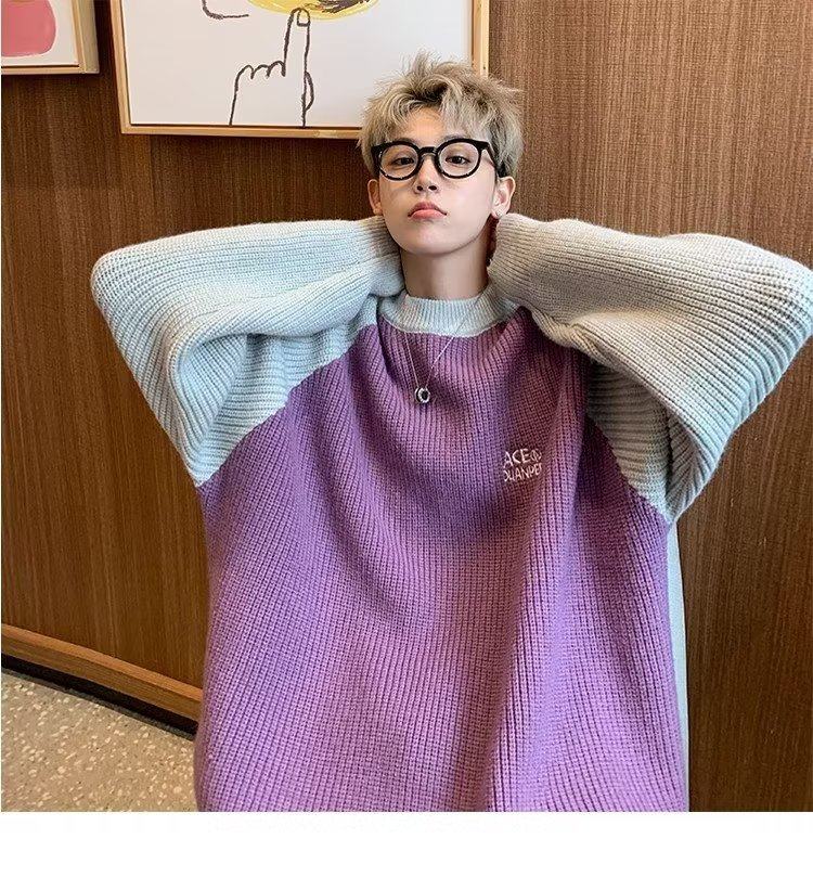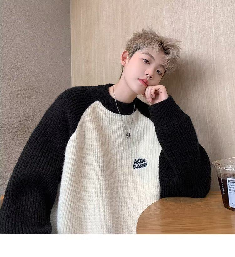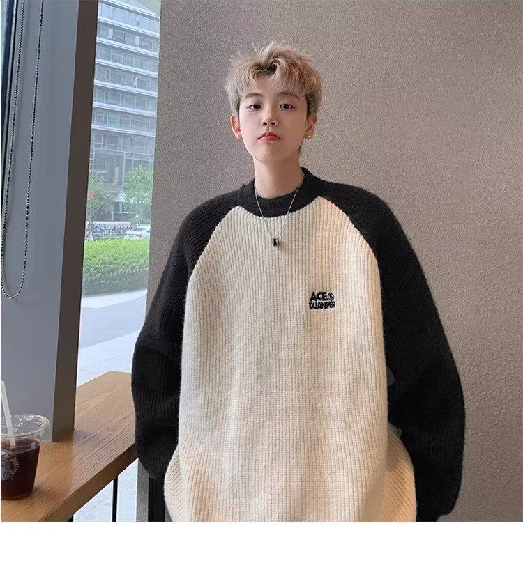 美式潮牌插色毛衣男秋冬季日系慵嬾復古針織衫拼接青少年線衣外套