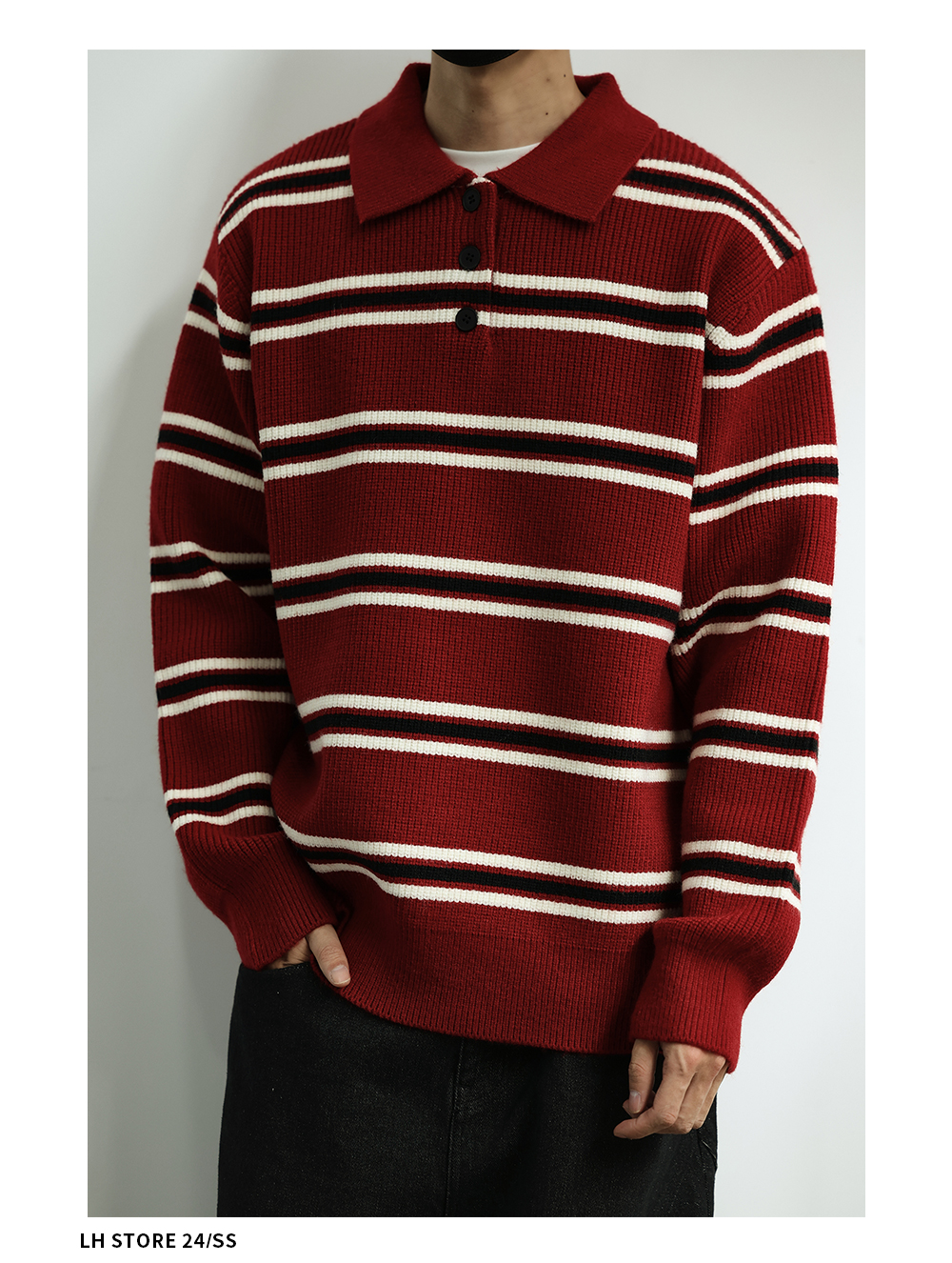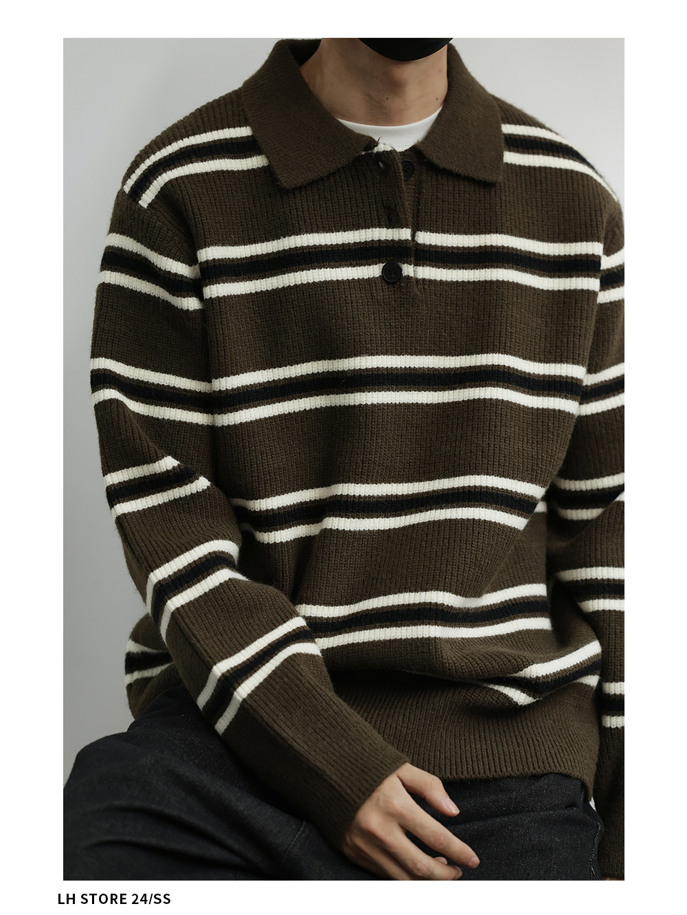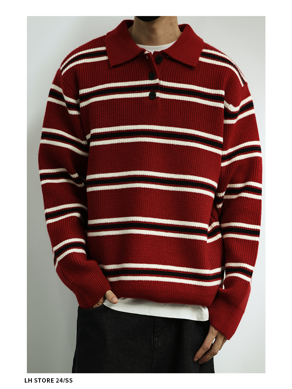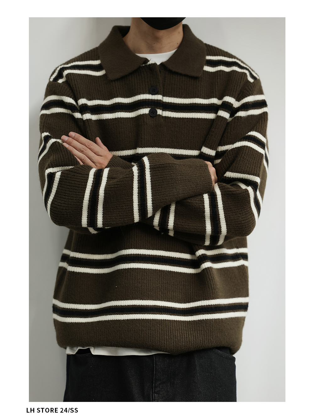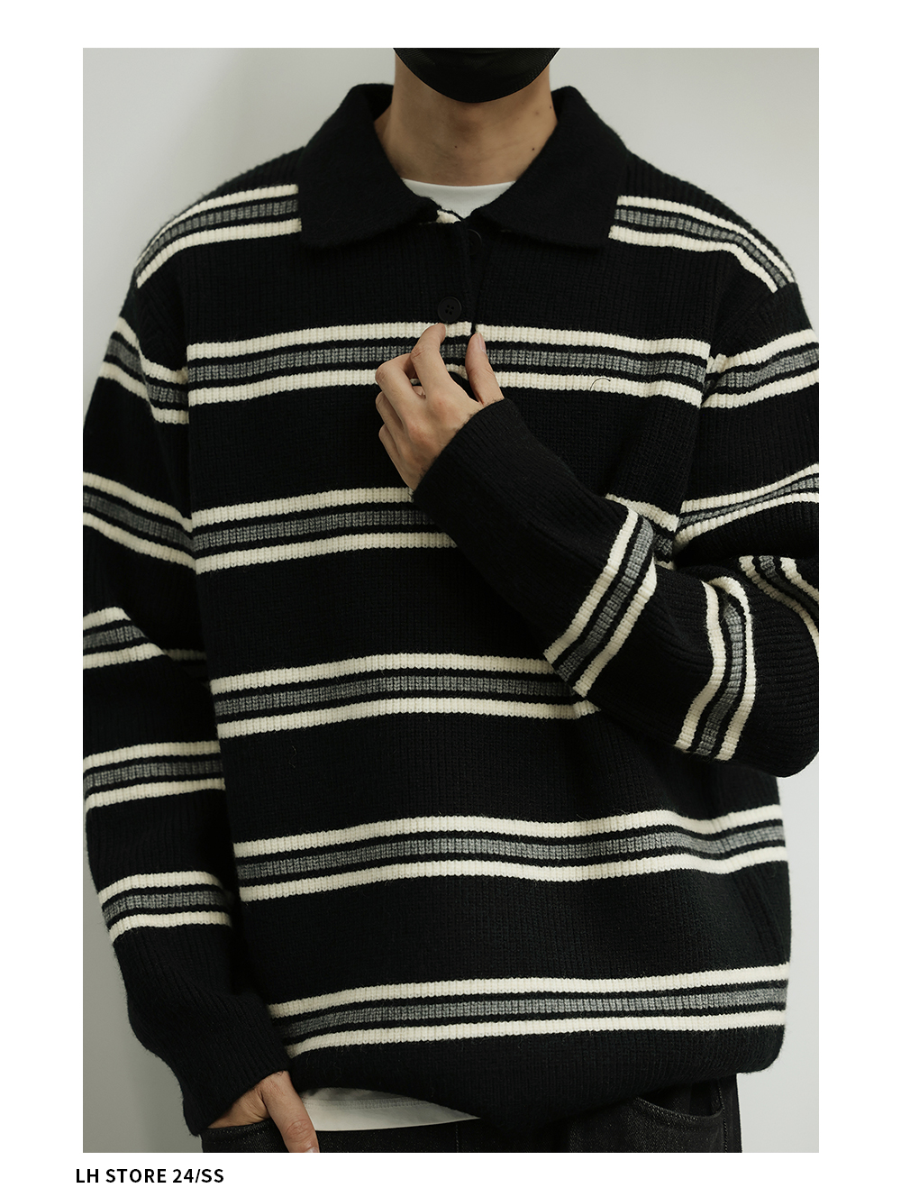 LH store 美式復古條紋POLO毛衣男秋寬松情侶翻領長袖針織衫上衣