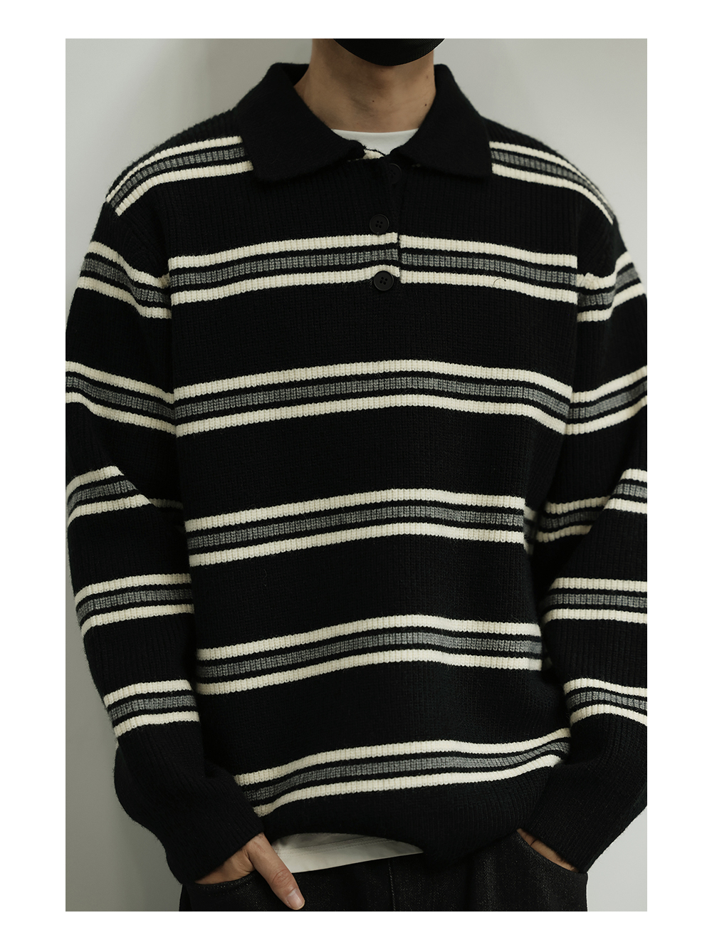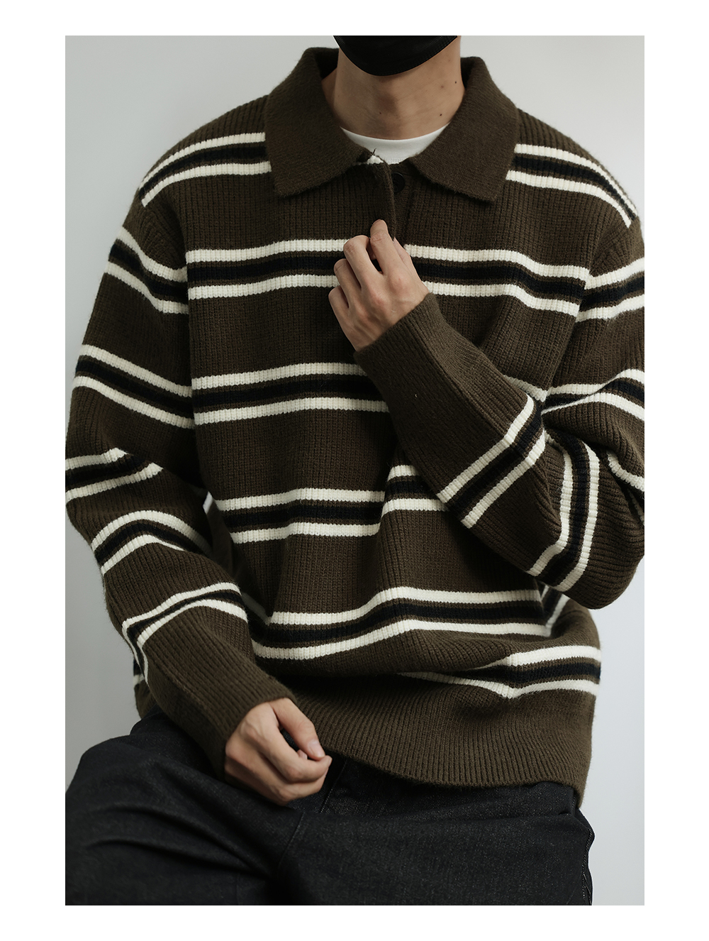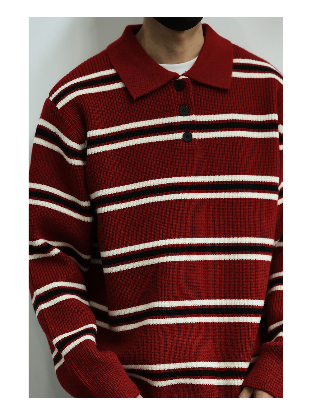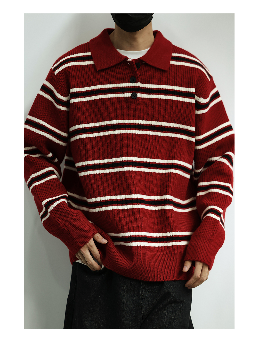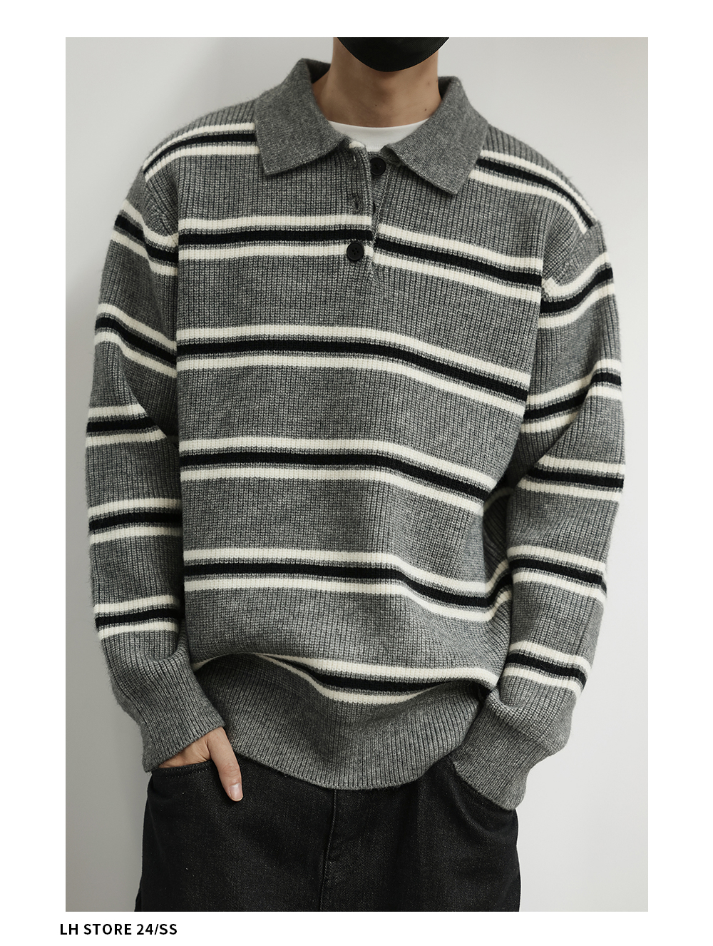 LH store 美式復古條紋POLO毛衣男秋寬松情侶翻領長袖針織衫上衣
