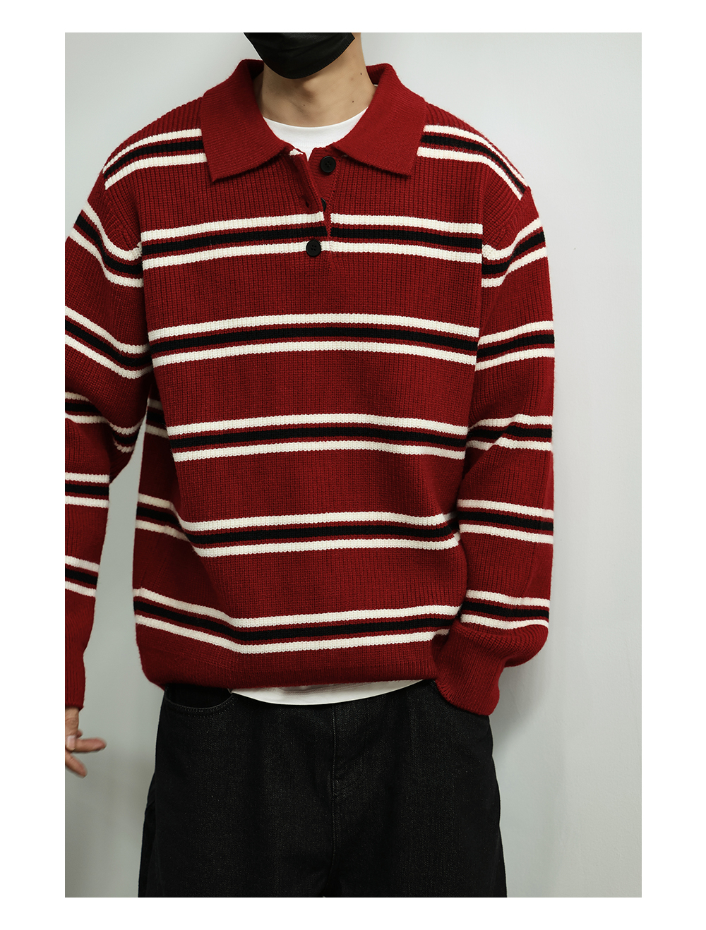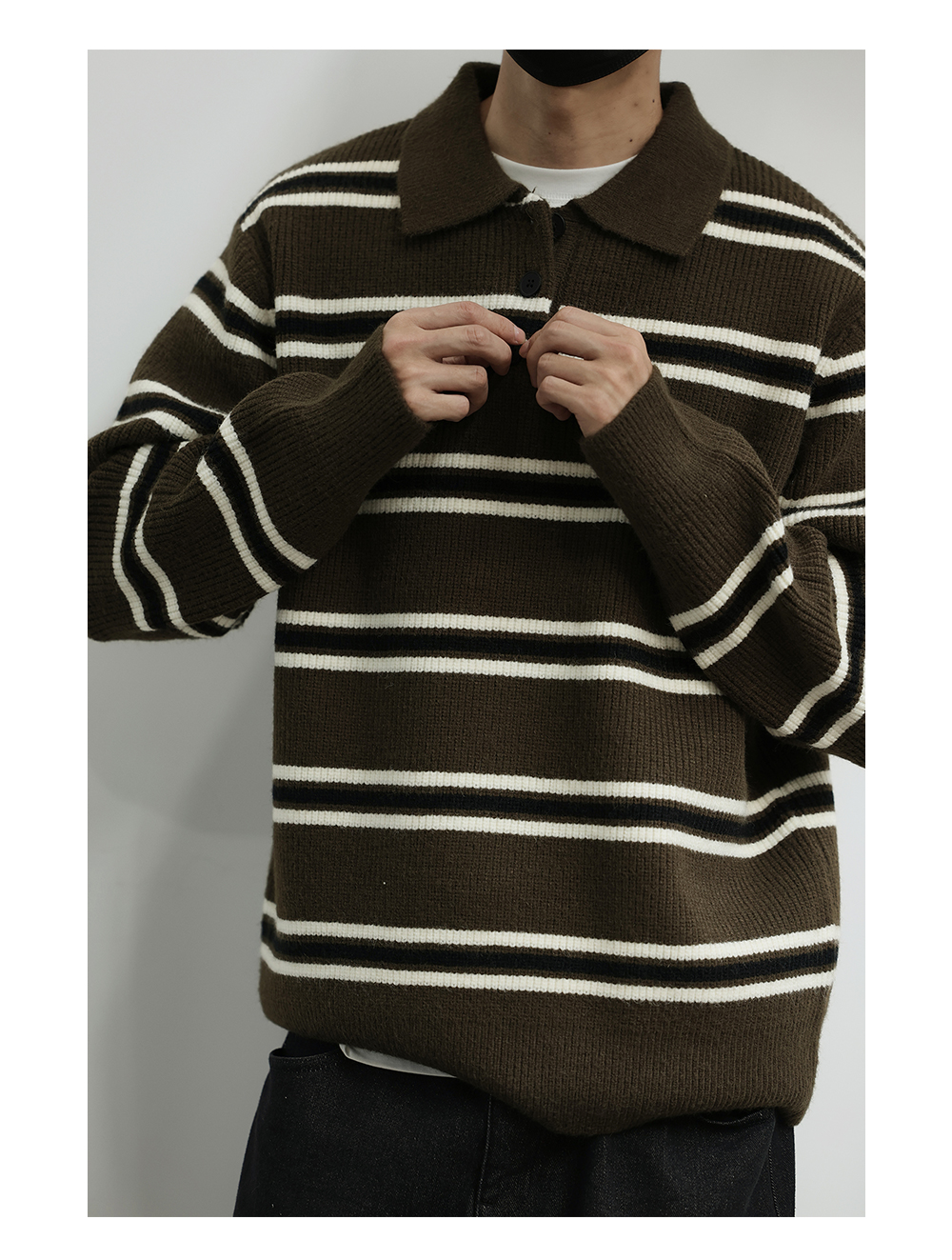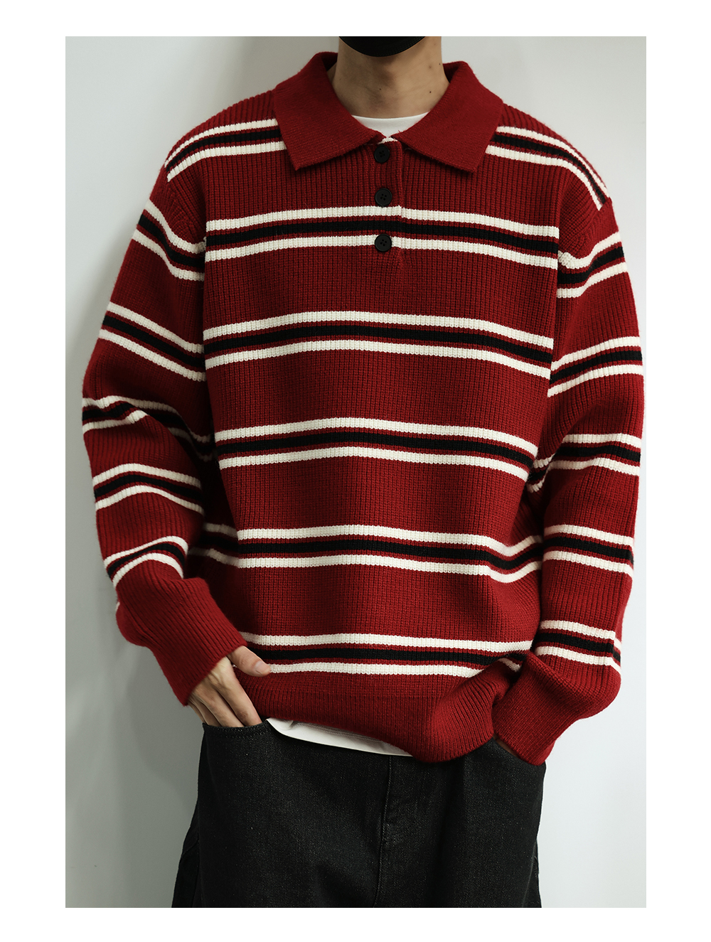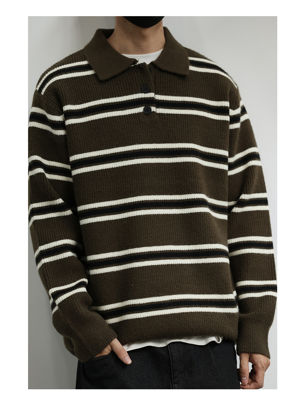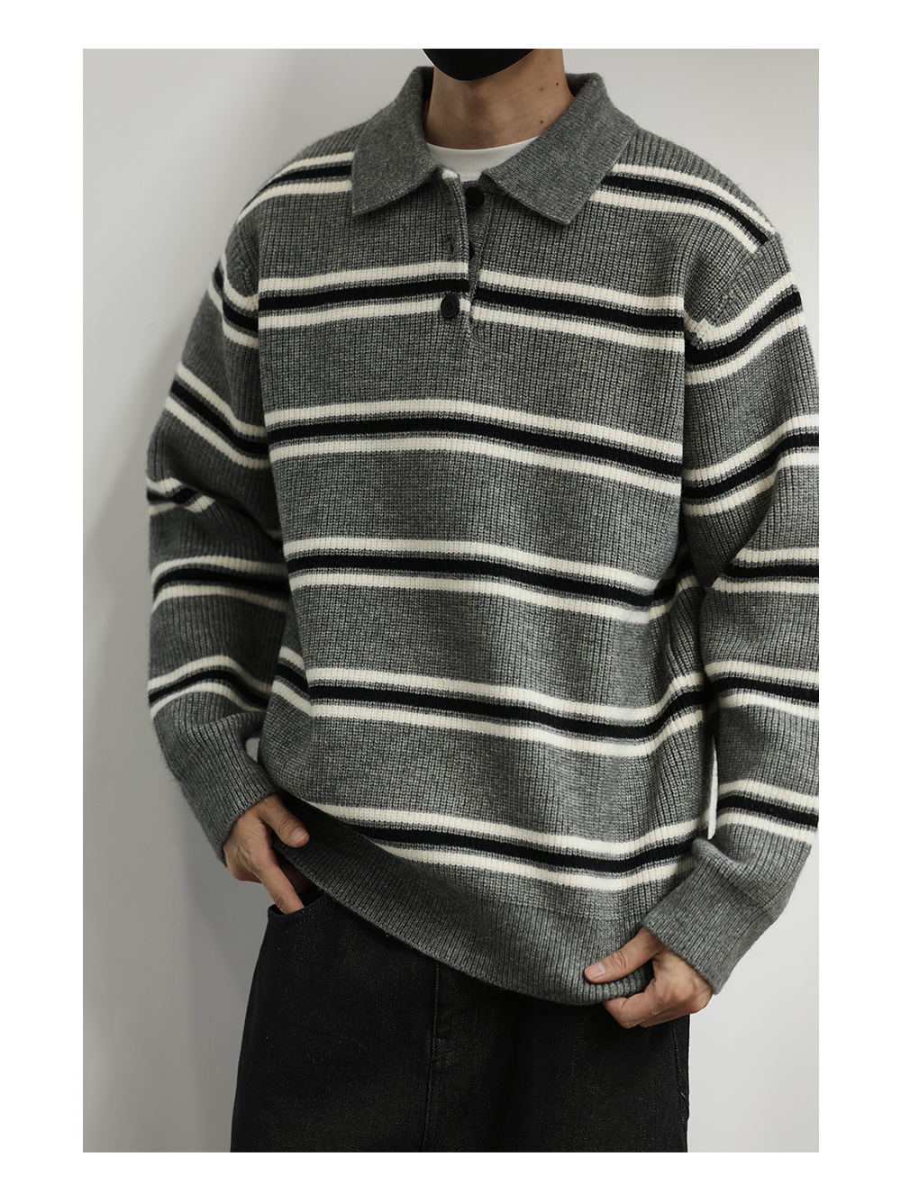 LH store 美式復古條紋POLO毛衣男秋寬松情侶翻領長袖針織衫上衣