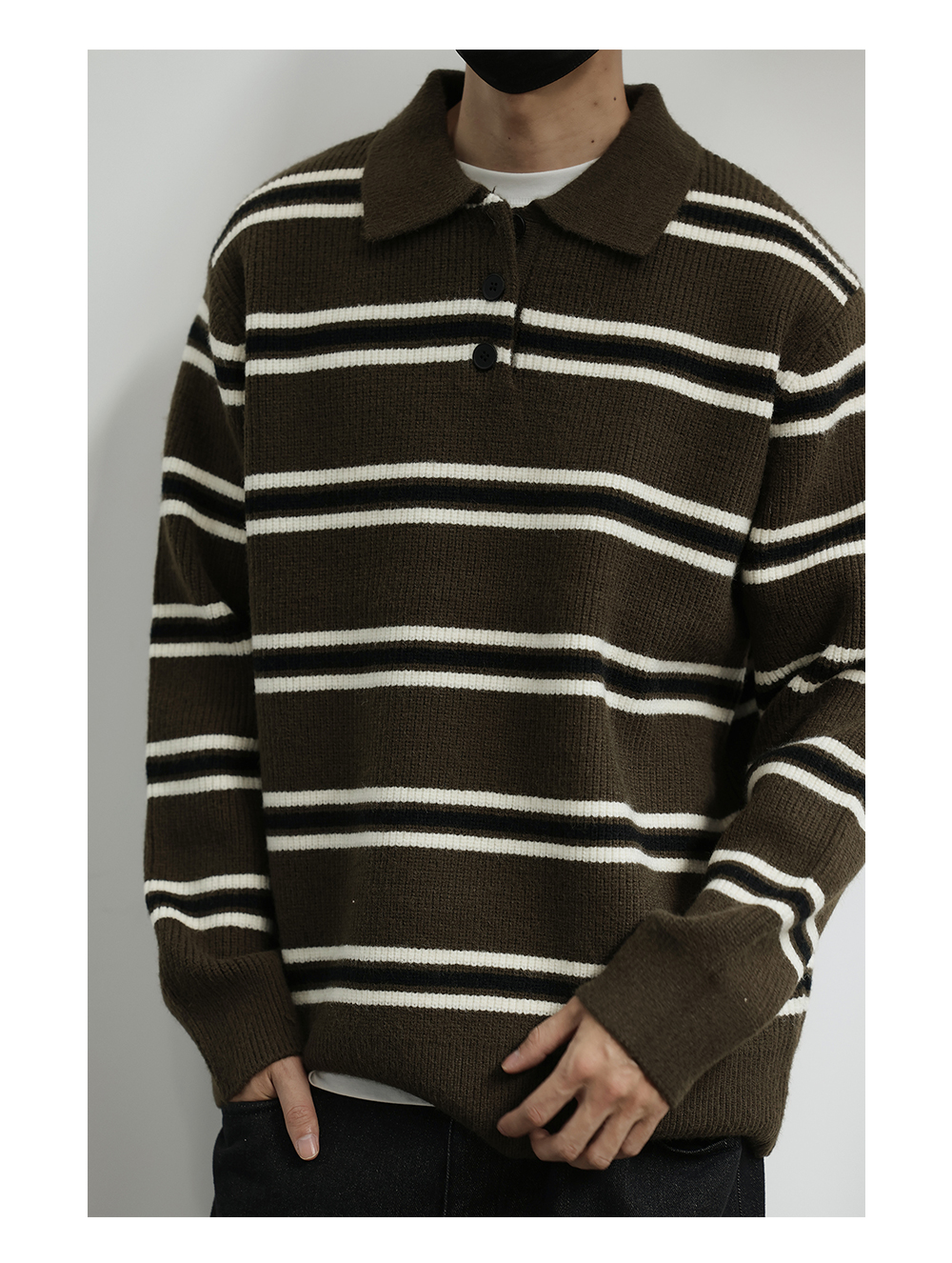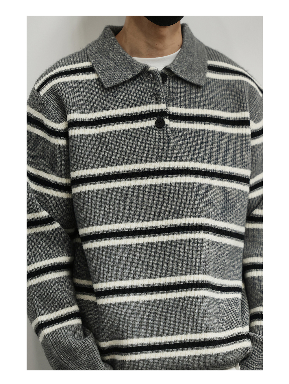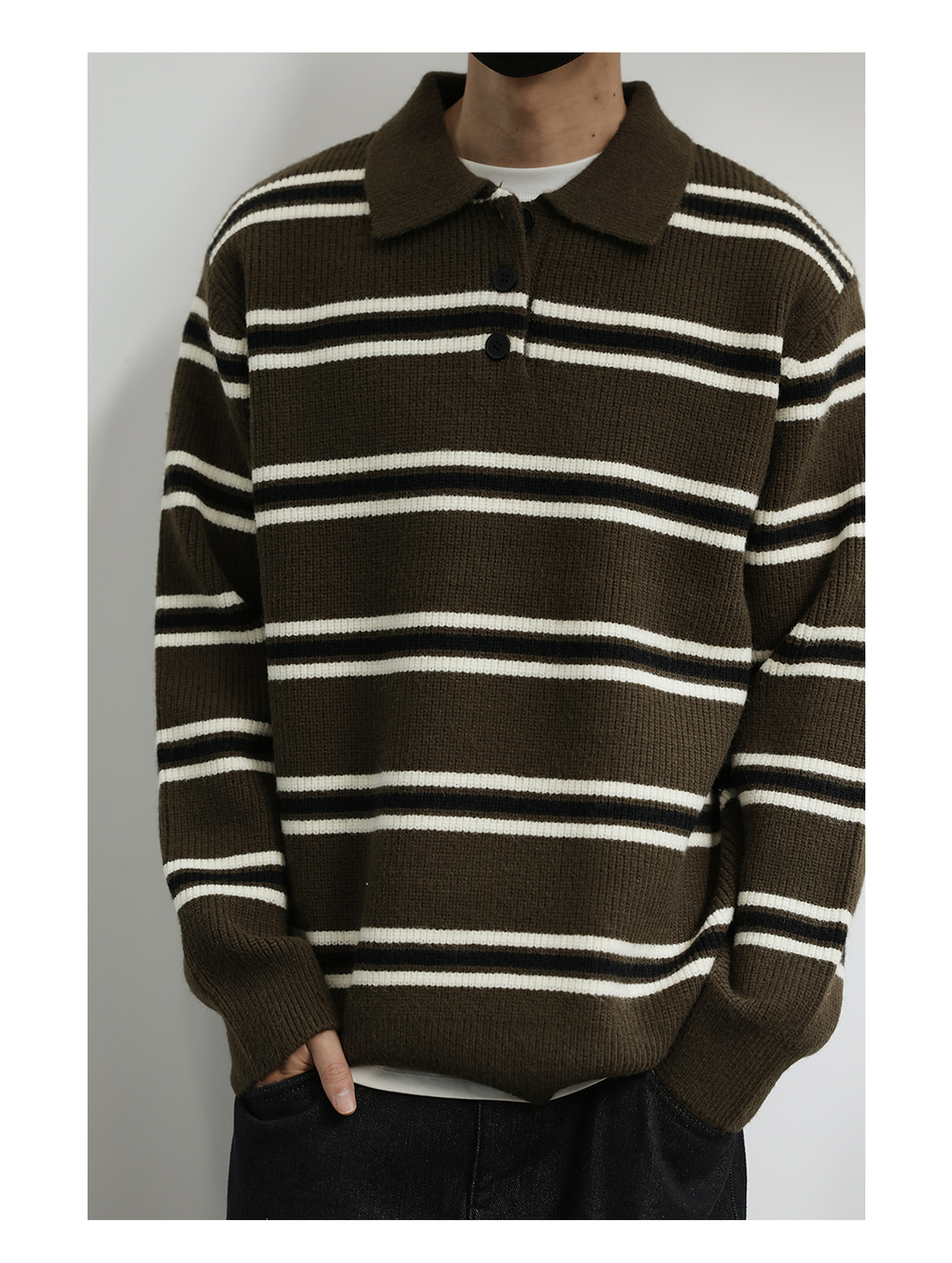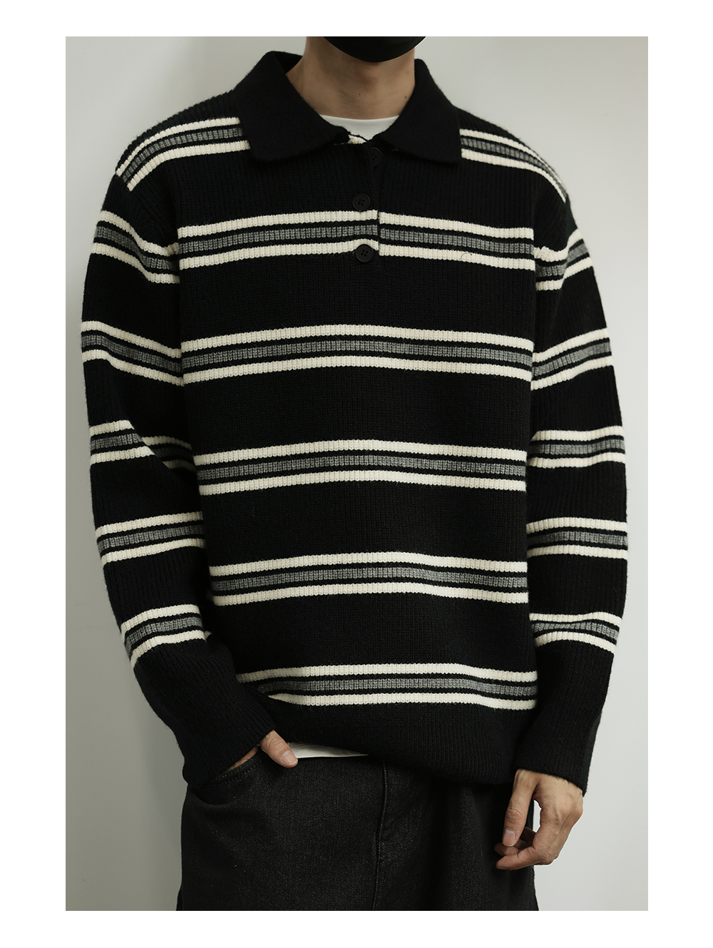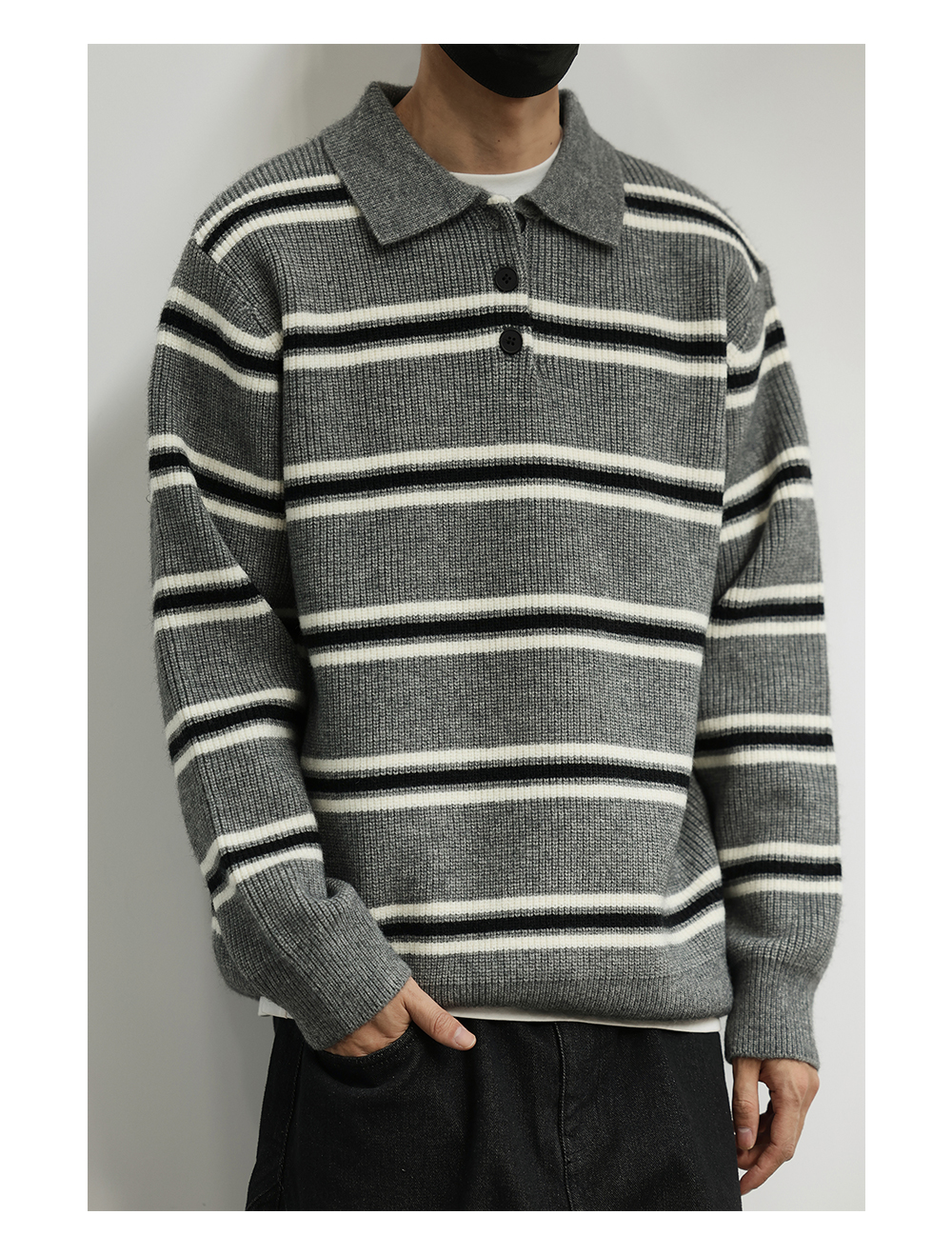 LH store 美式復古條紋POLO毛衣男秋寬松情侶翻領長袖針織衫上衣