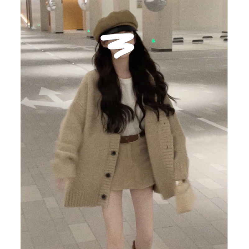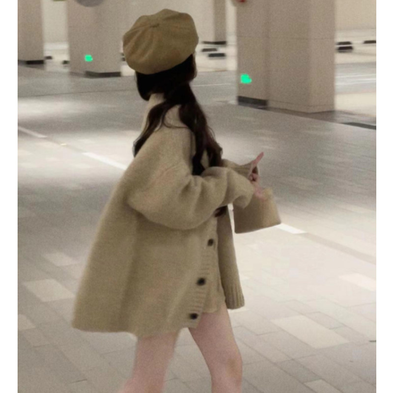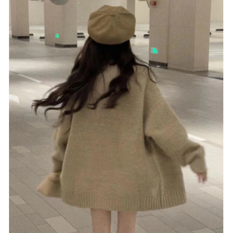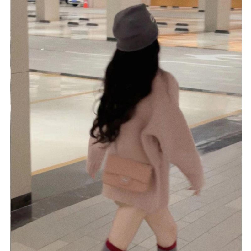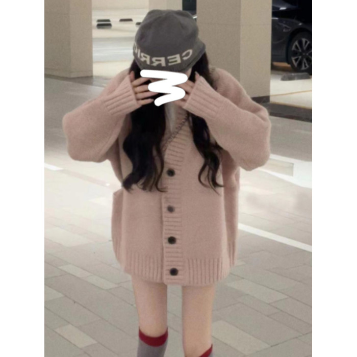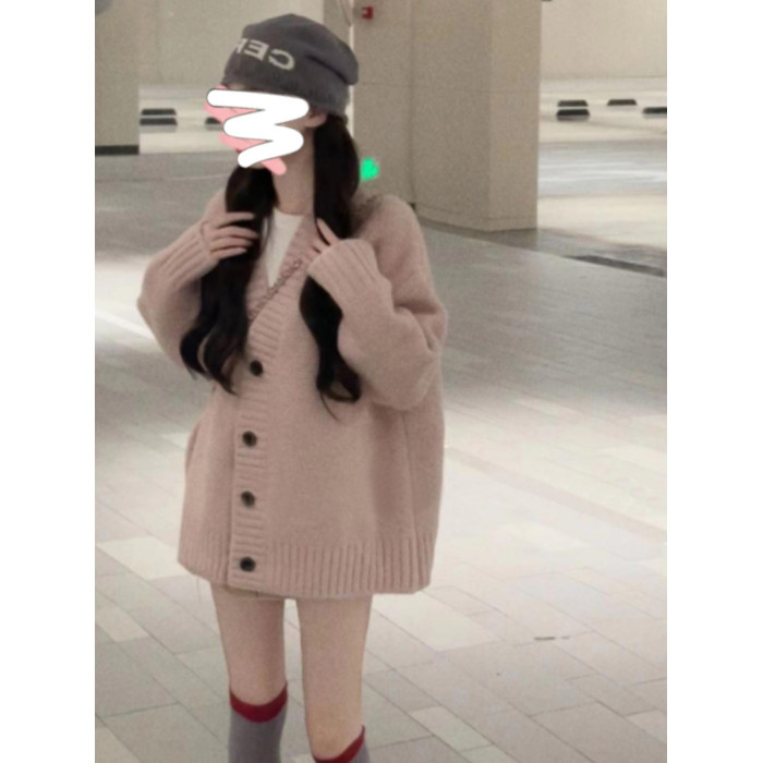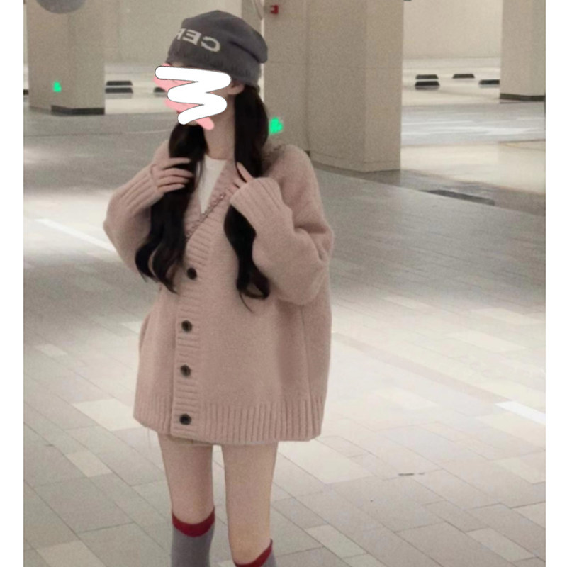 日系慵嬾風粉色V領長袖毛衣外套女秋冬季軟糯粗針織開衫上衣寬鬆