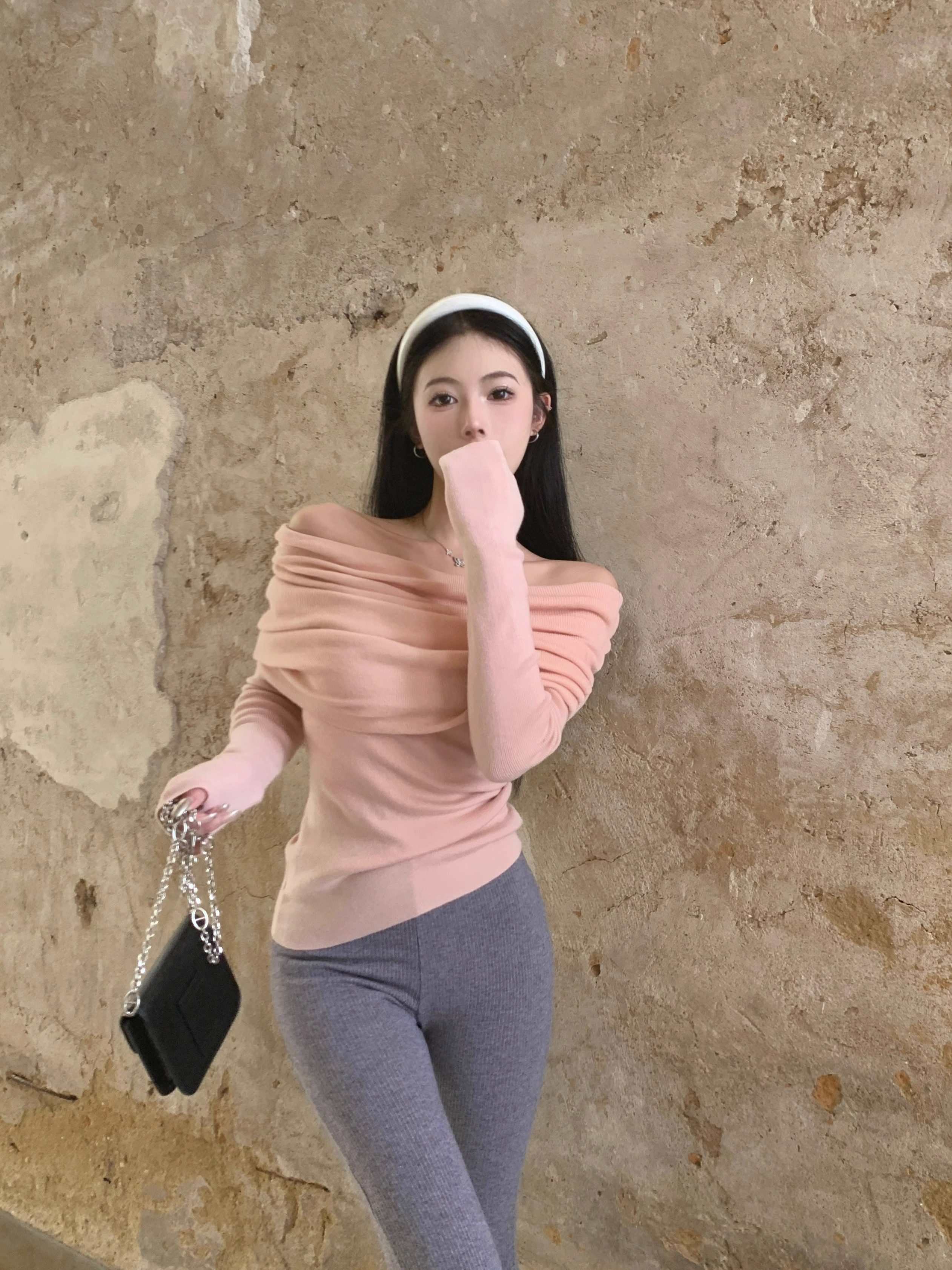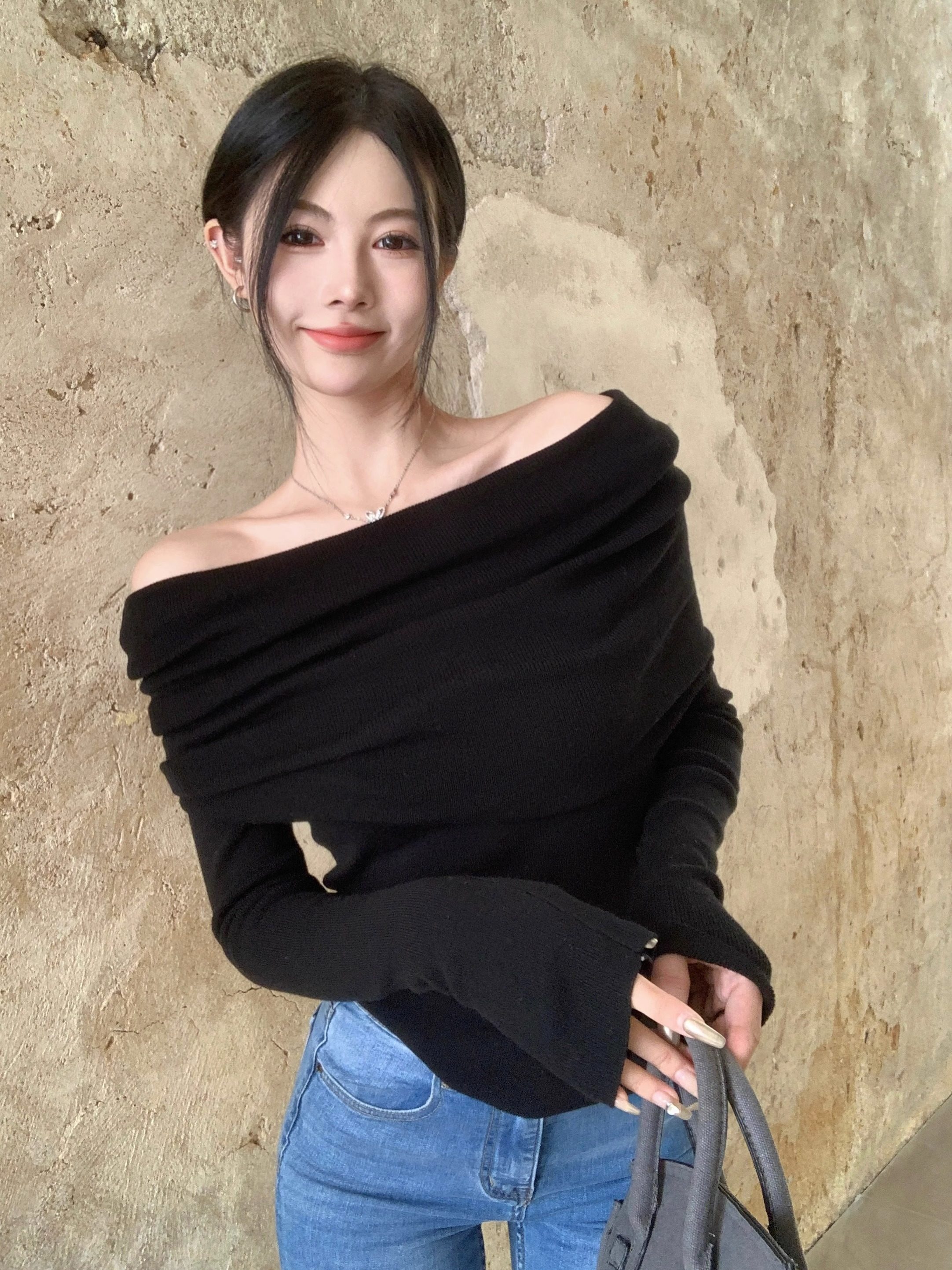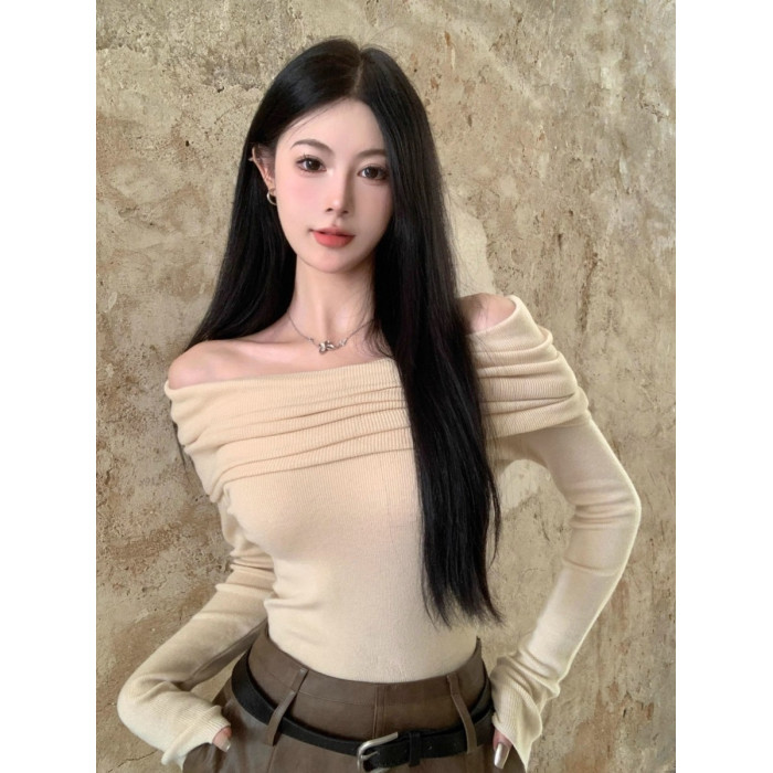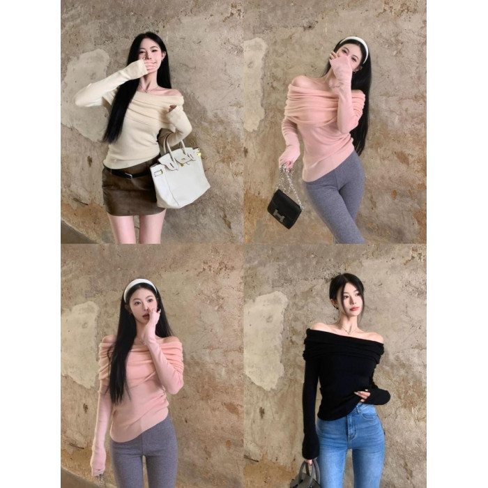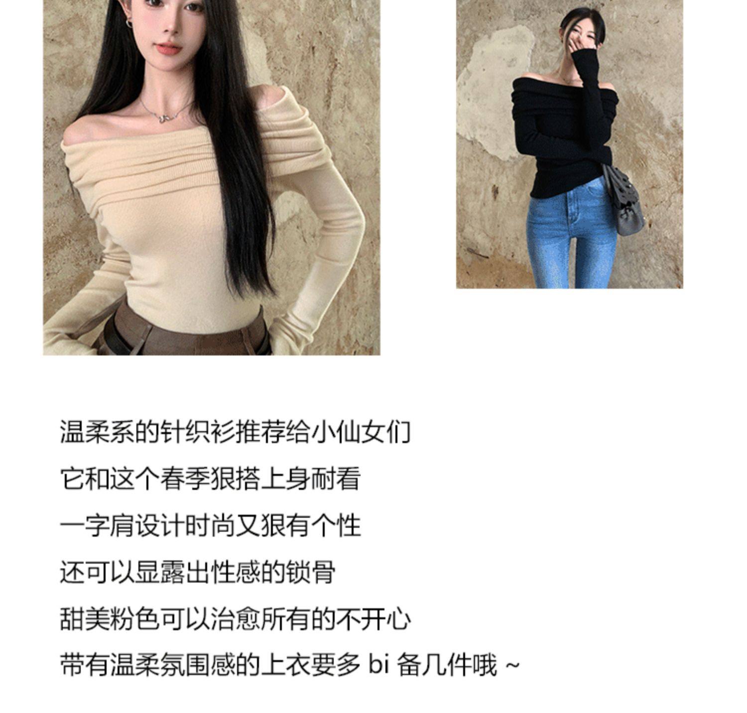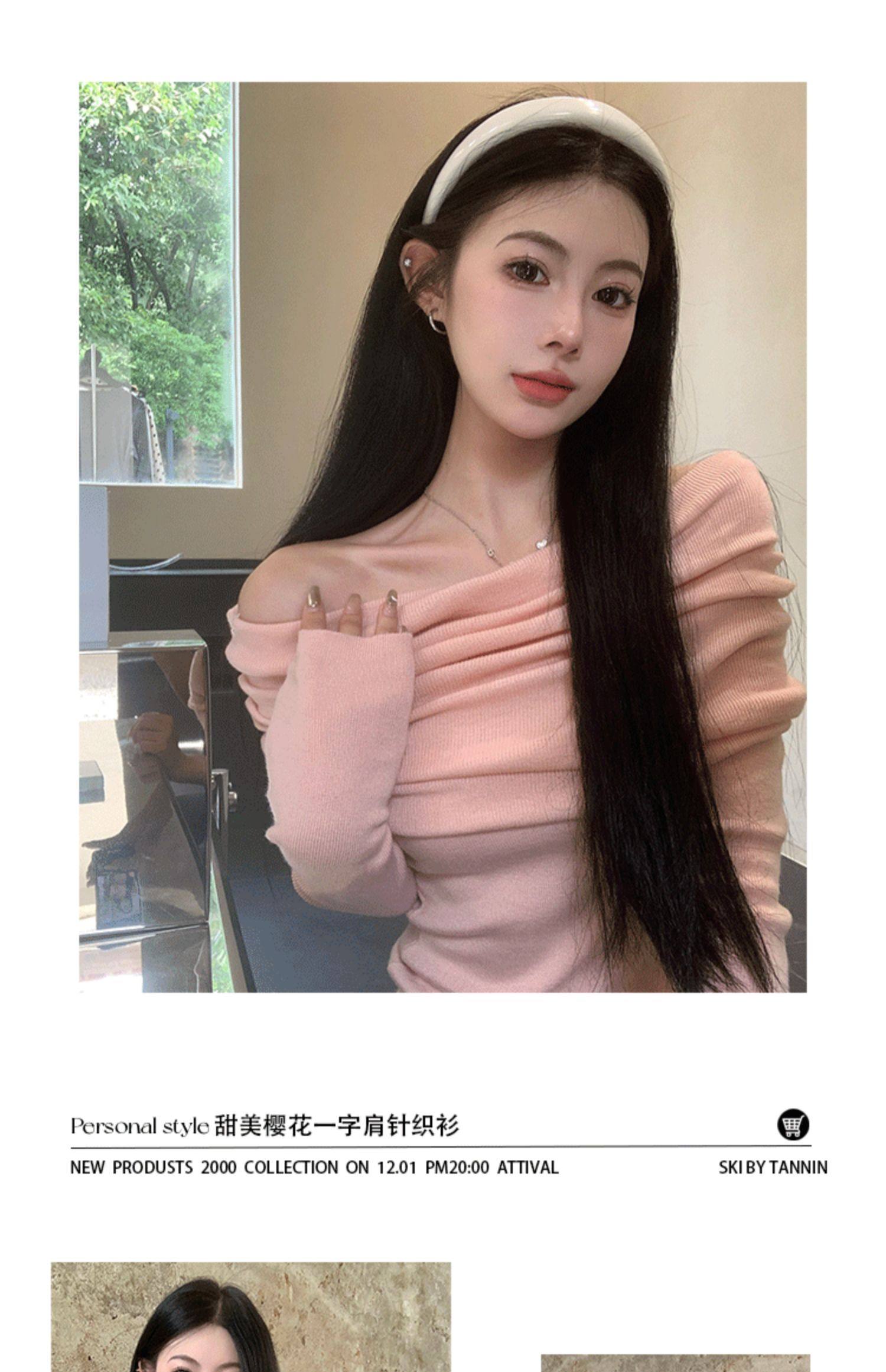 溫柔鎖骨一字肩粉色針織衫女裝秋冬毛衣打底衫黑色一字領露肩上衣