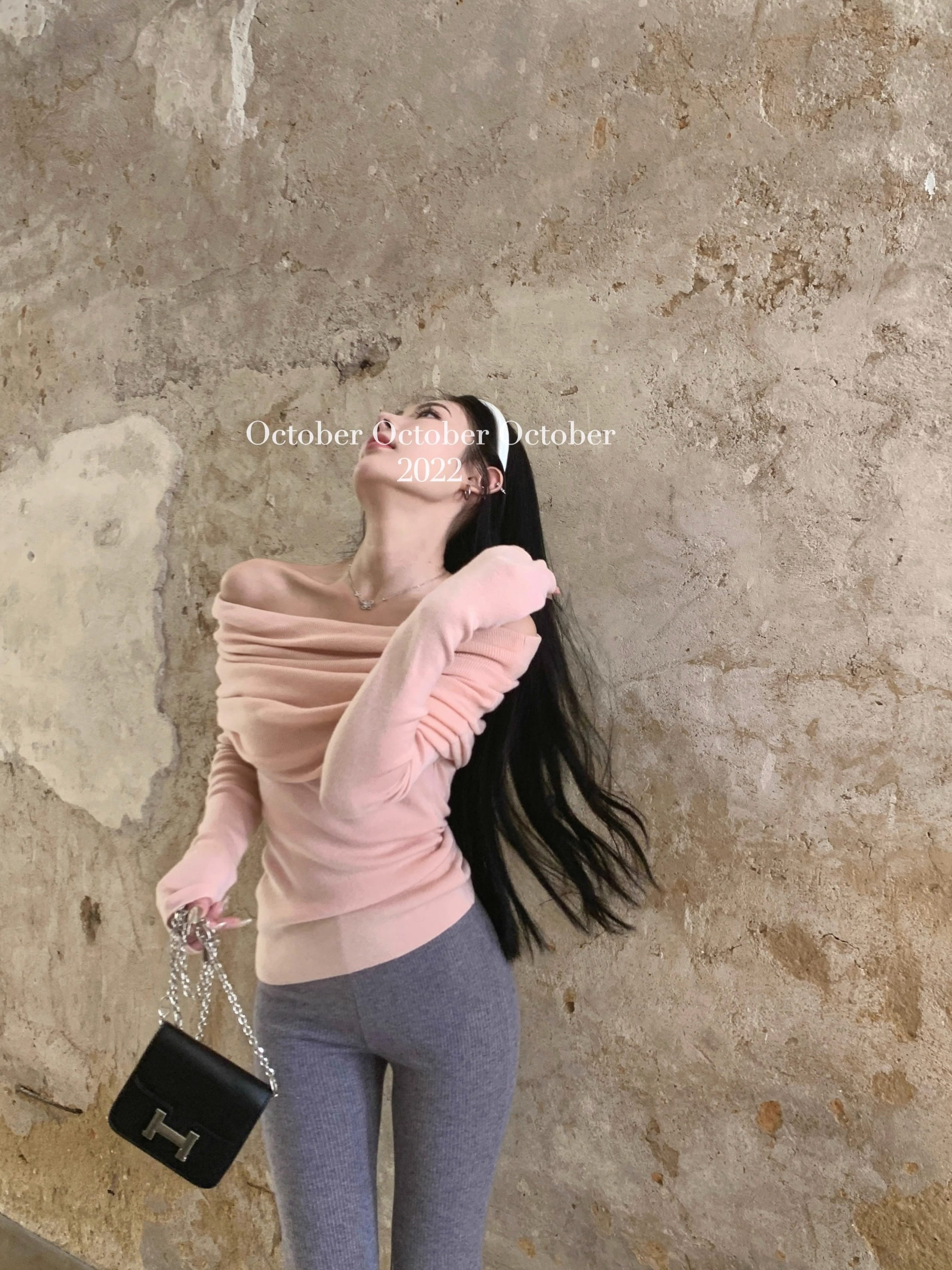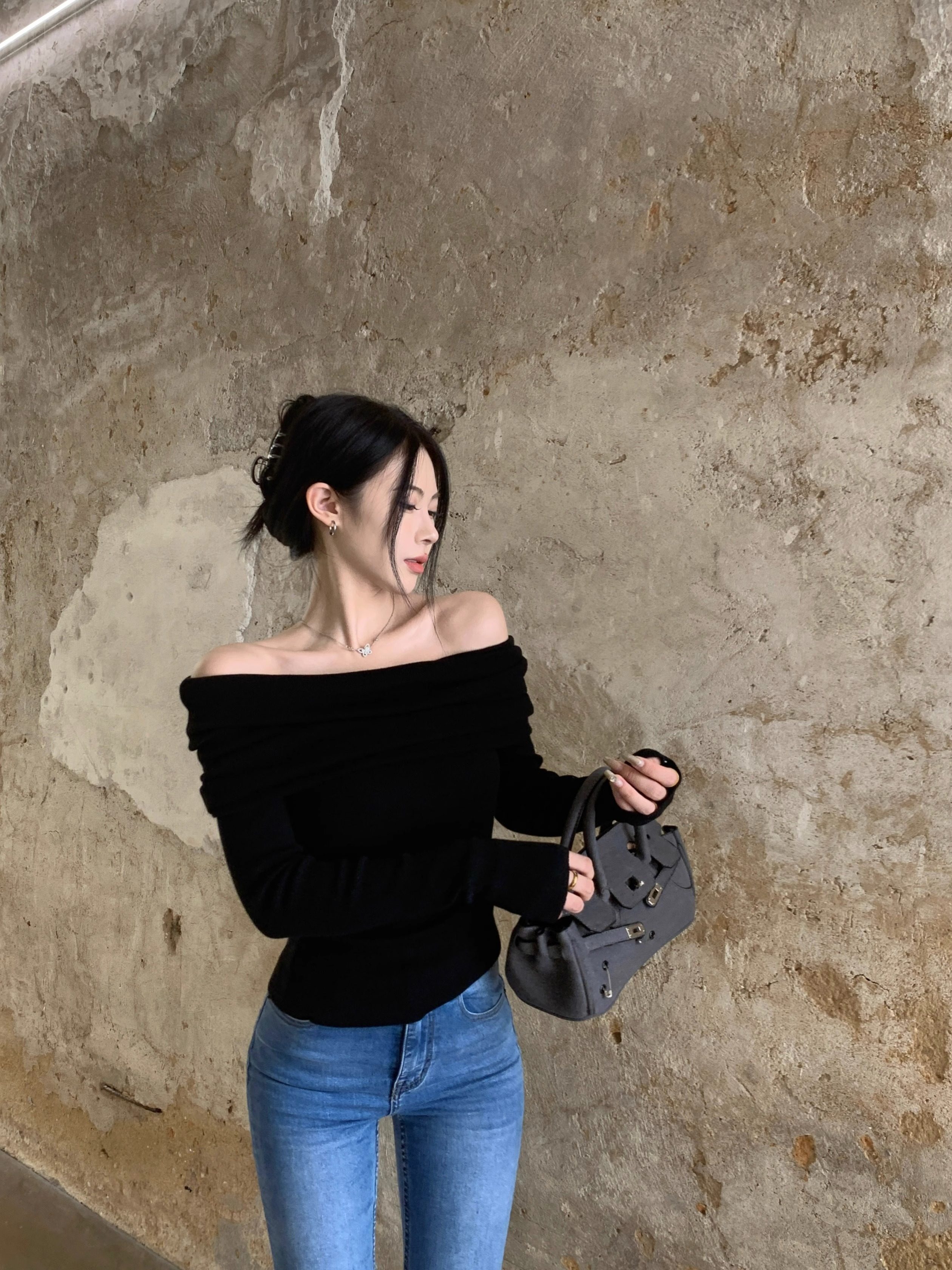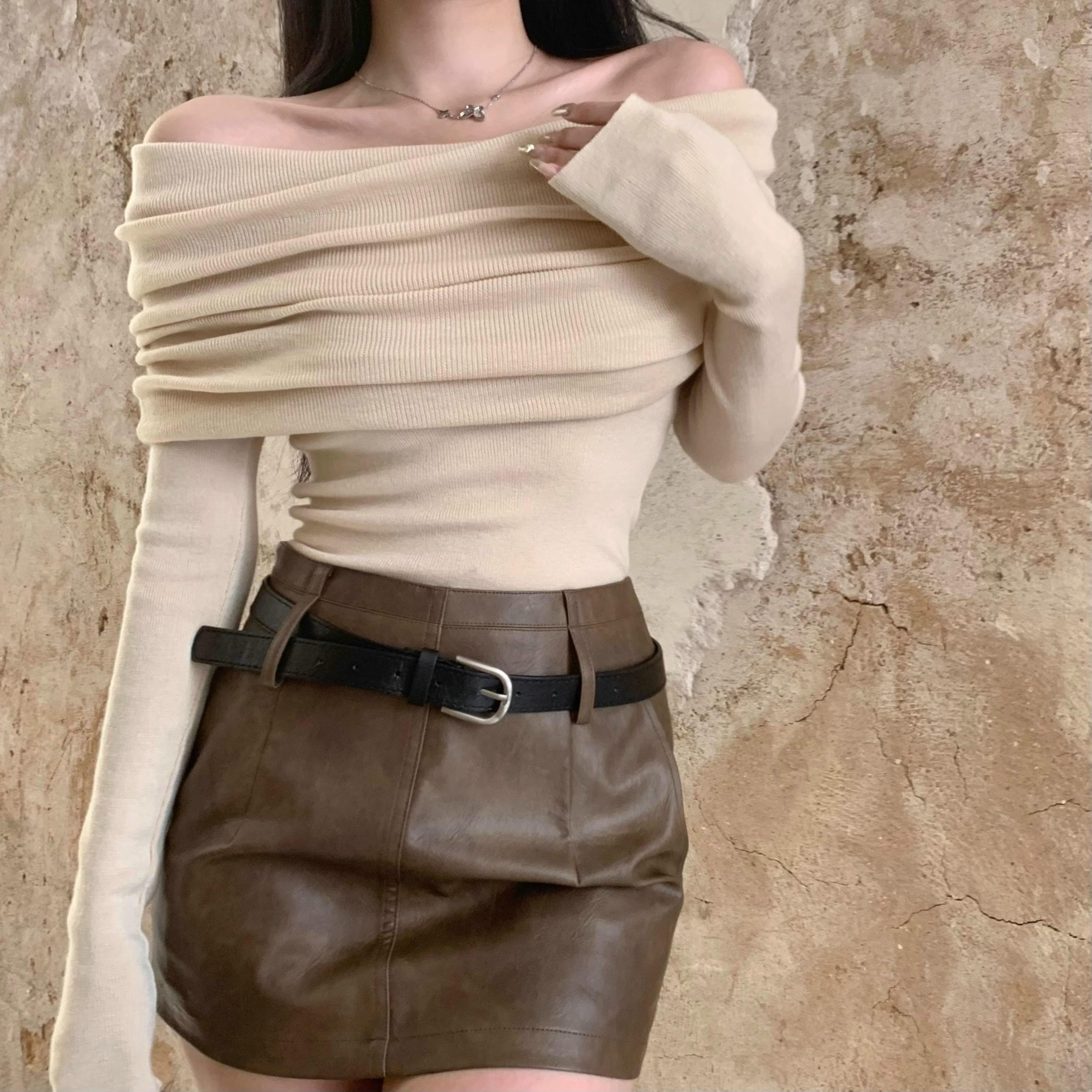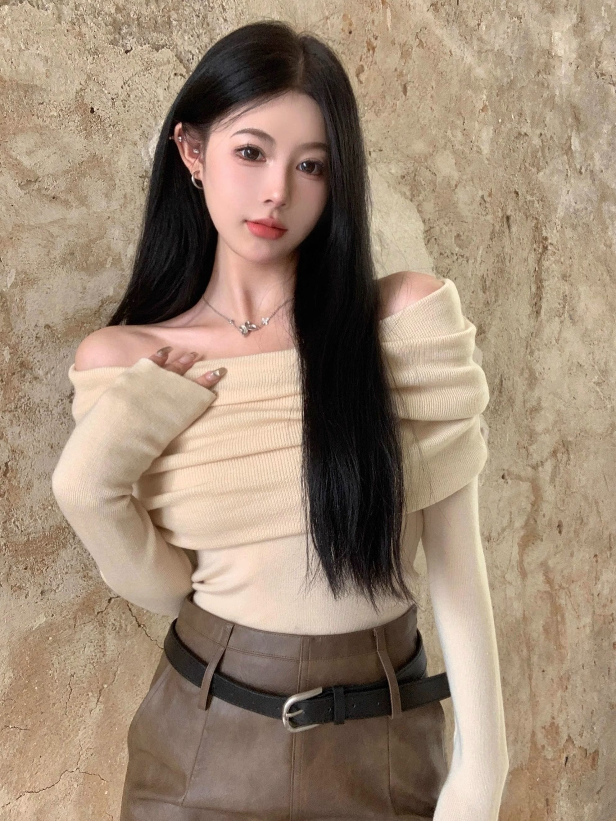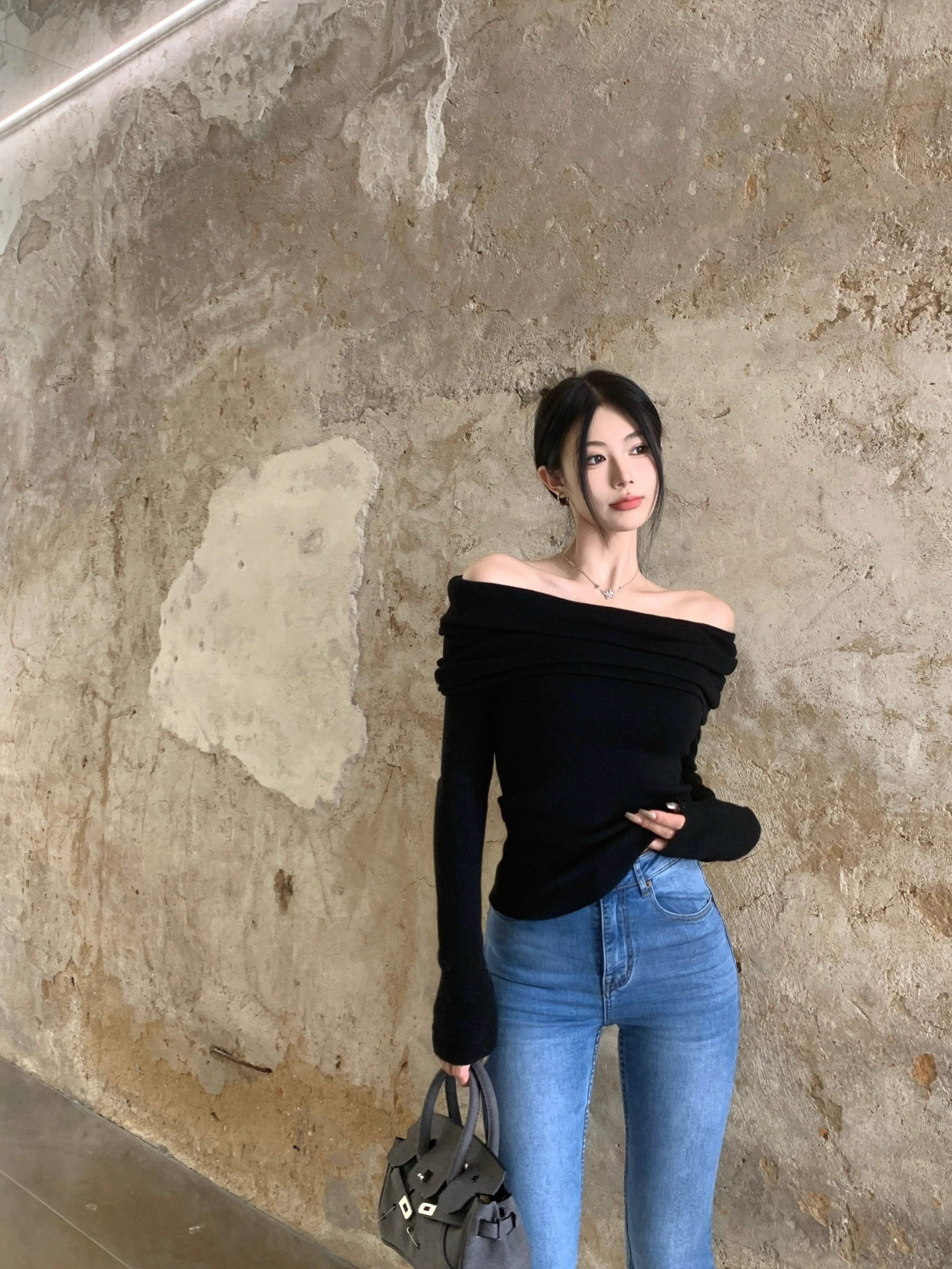 溫柔鎖骨一字肩粉色針織衫女裝秋冬毛衣打底衫黑色一字領露肩上衣