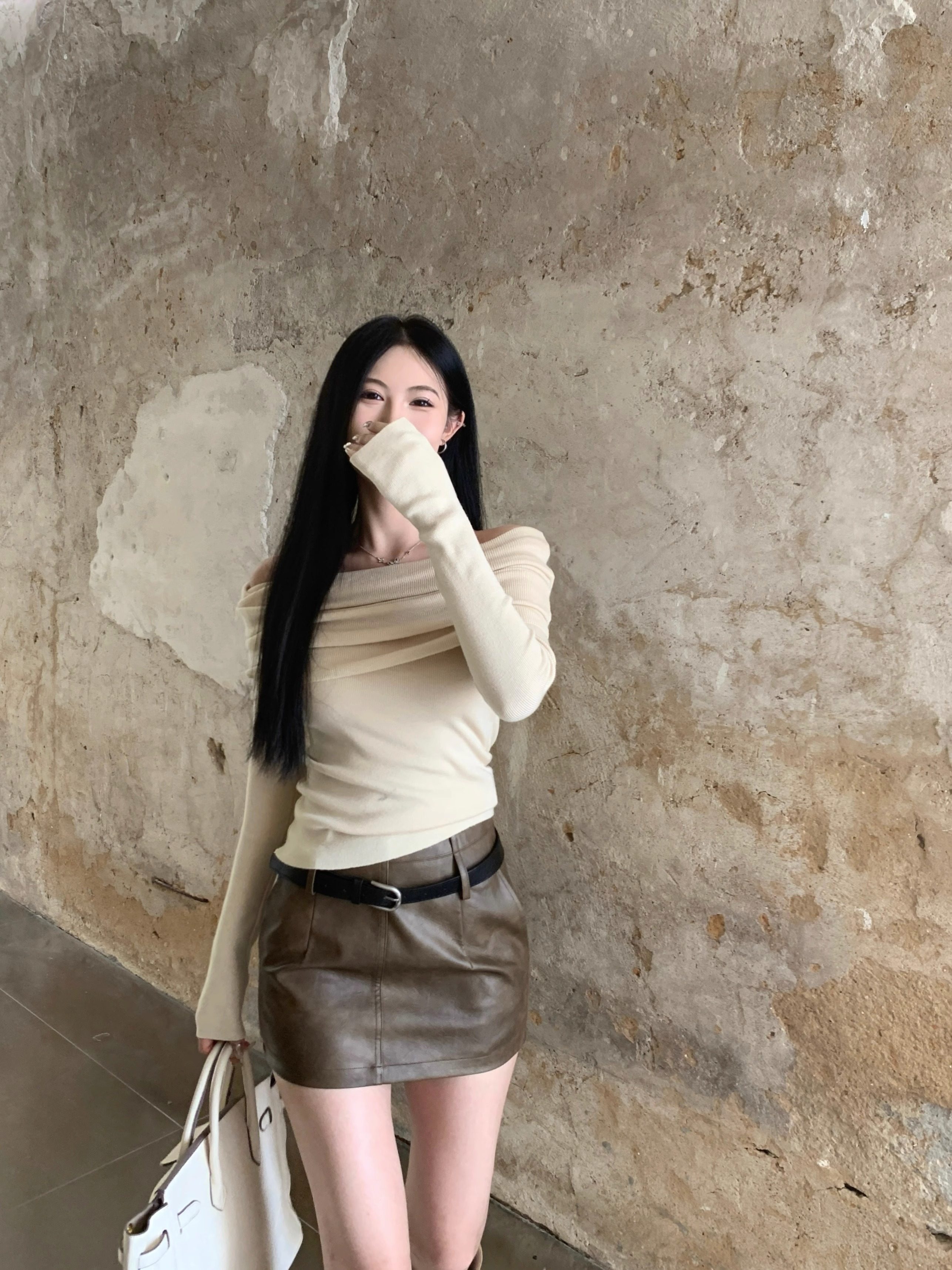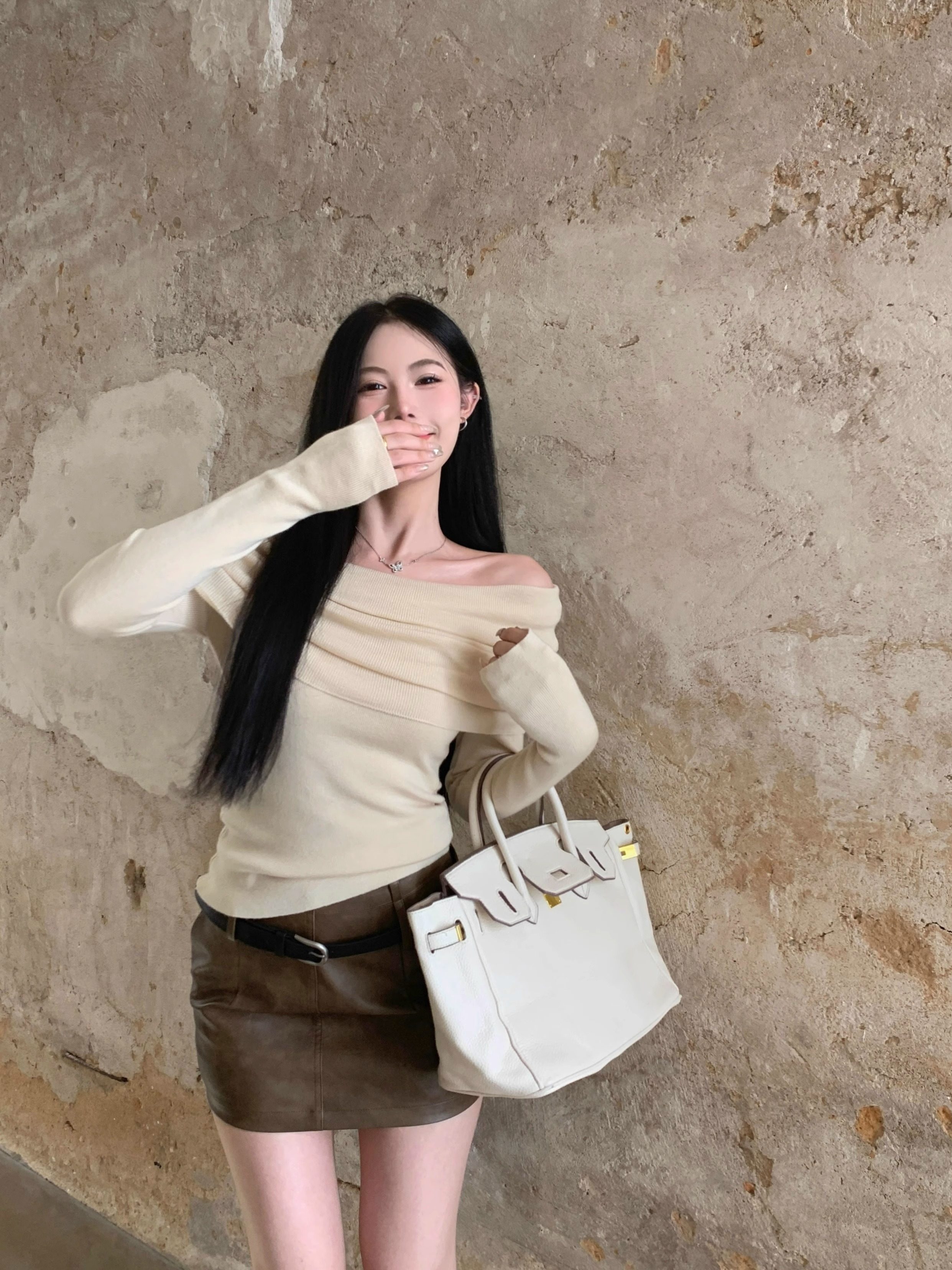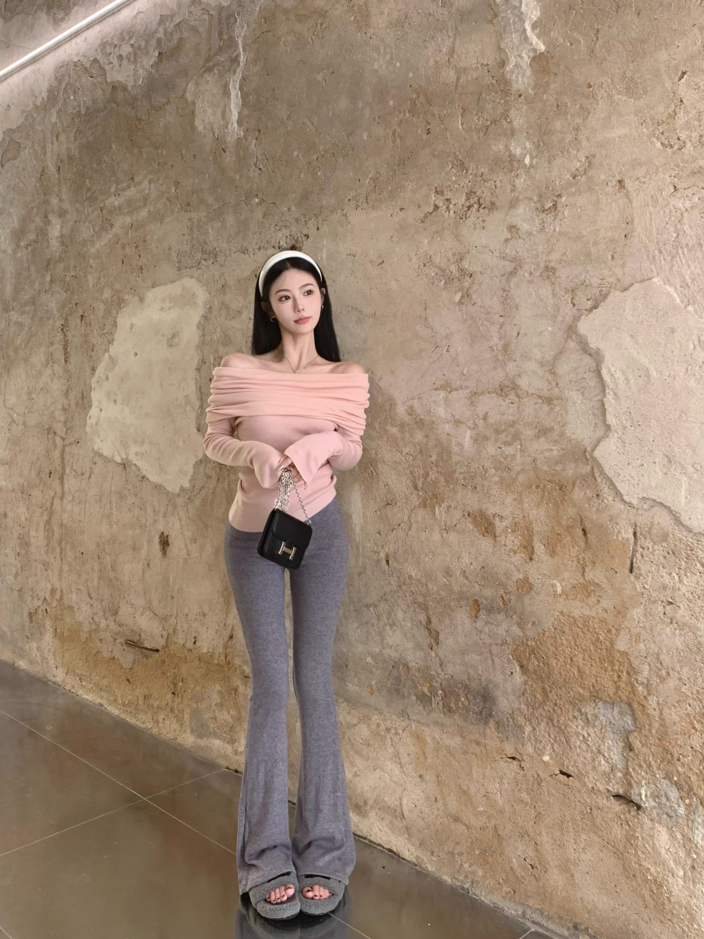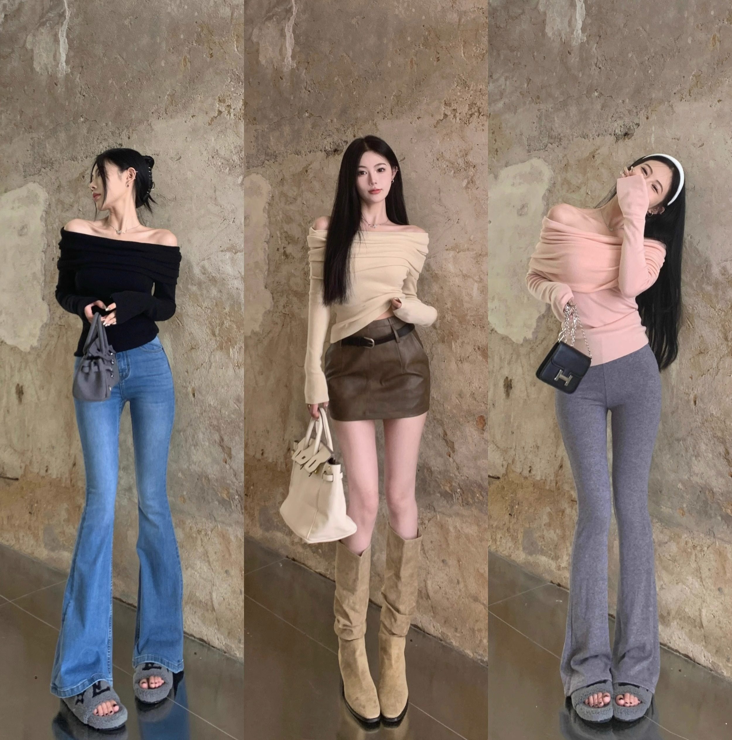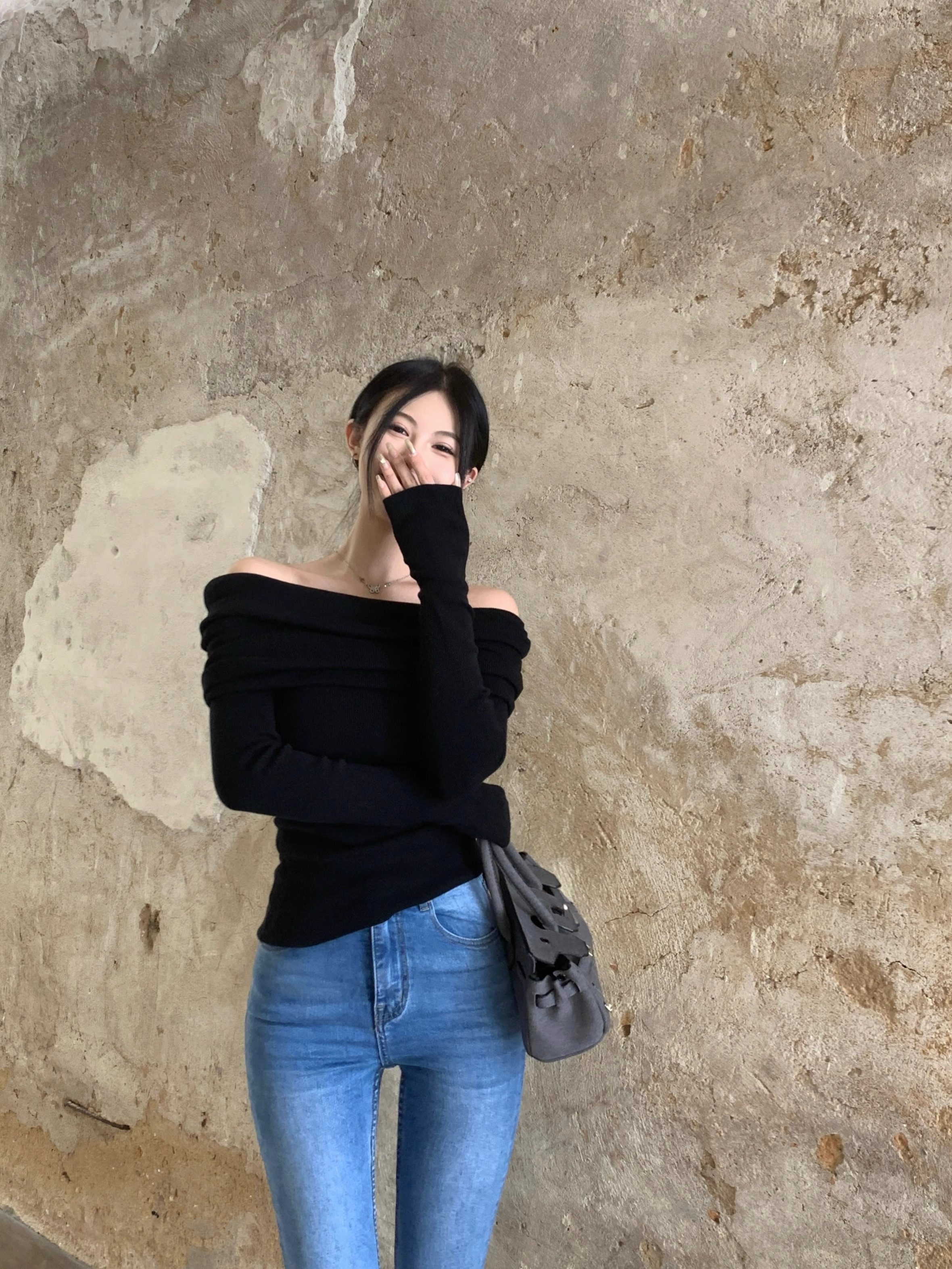 溫柔鎖骨一字肩粉色針織衫女裝秋冬毛衣打底衫黑色一字領露肩上衣