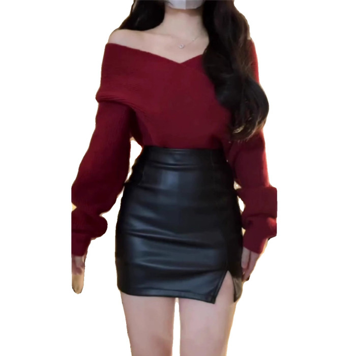 新年紅露肩交叉氛圍感毛衣女春裝內搭v領短款打底衫別致甜辣上衣