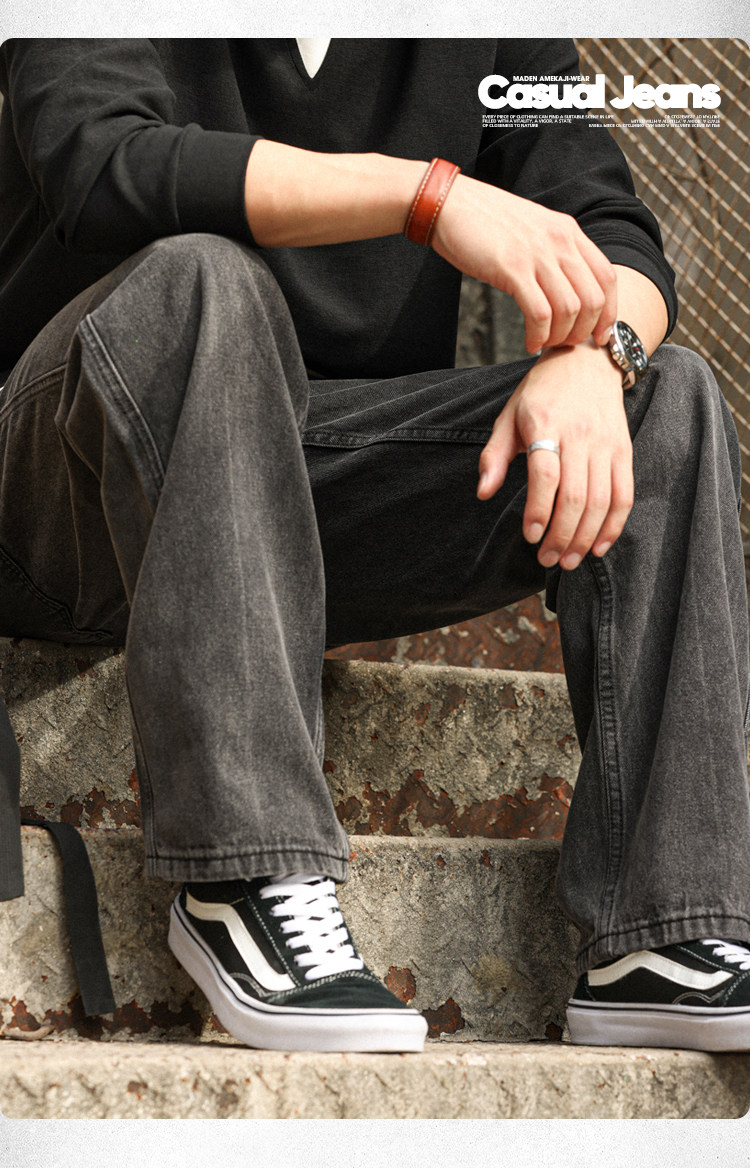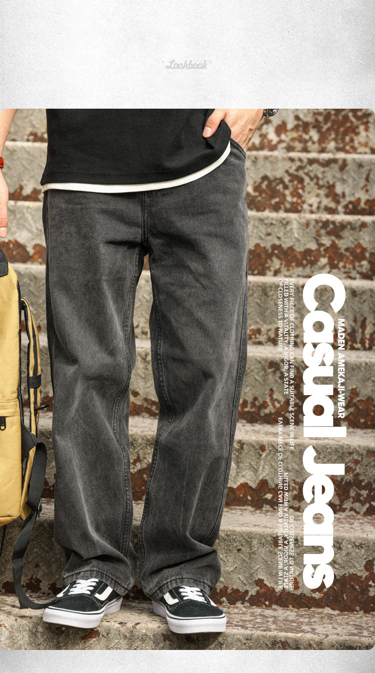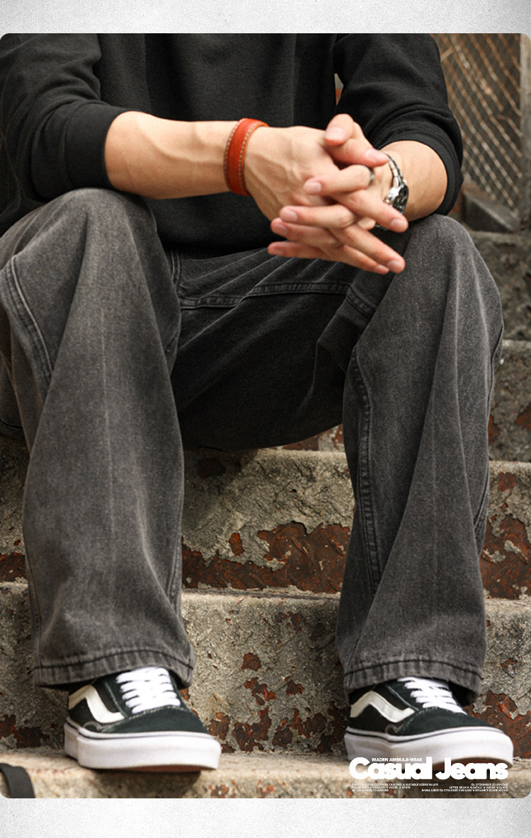 BGYO 美式復古水洗黑色牛仔褲男士vintage重磅垂墜感直筒濶腿長褲