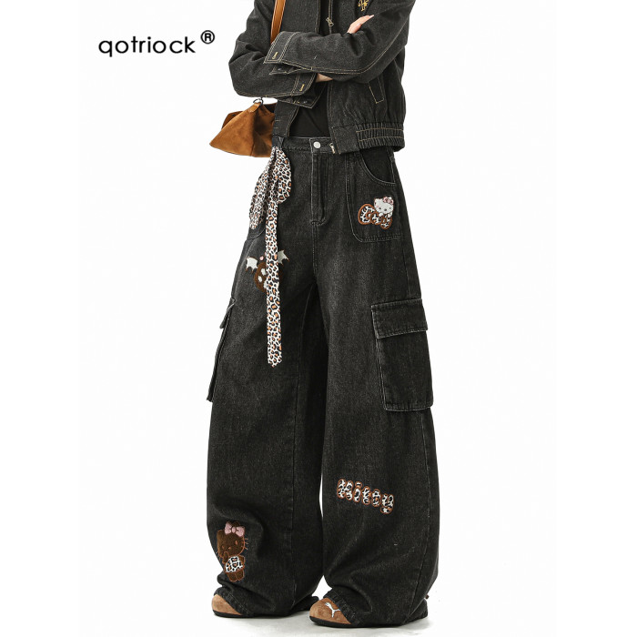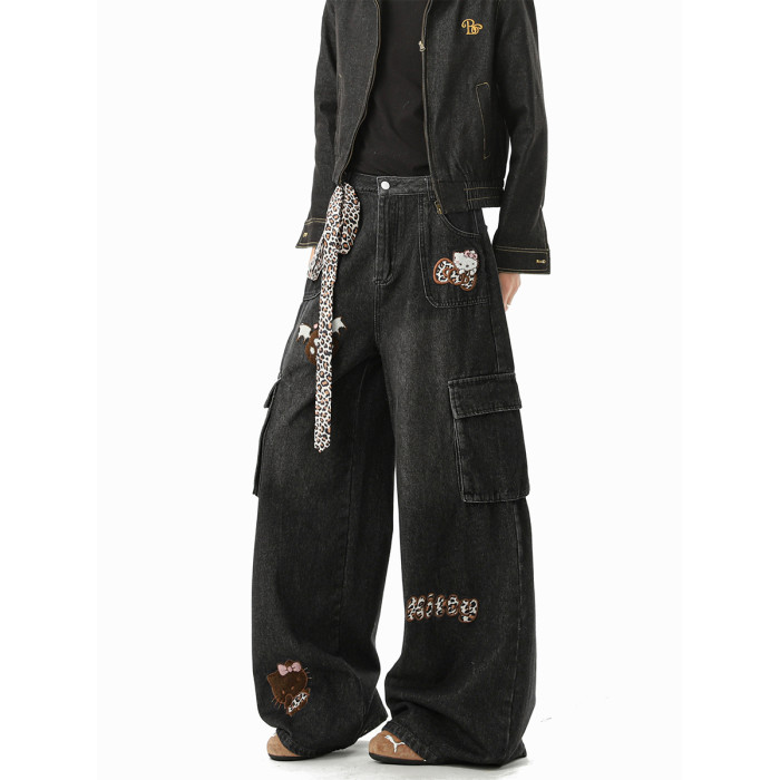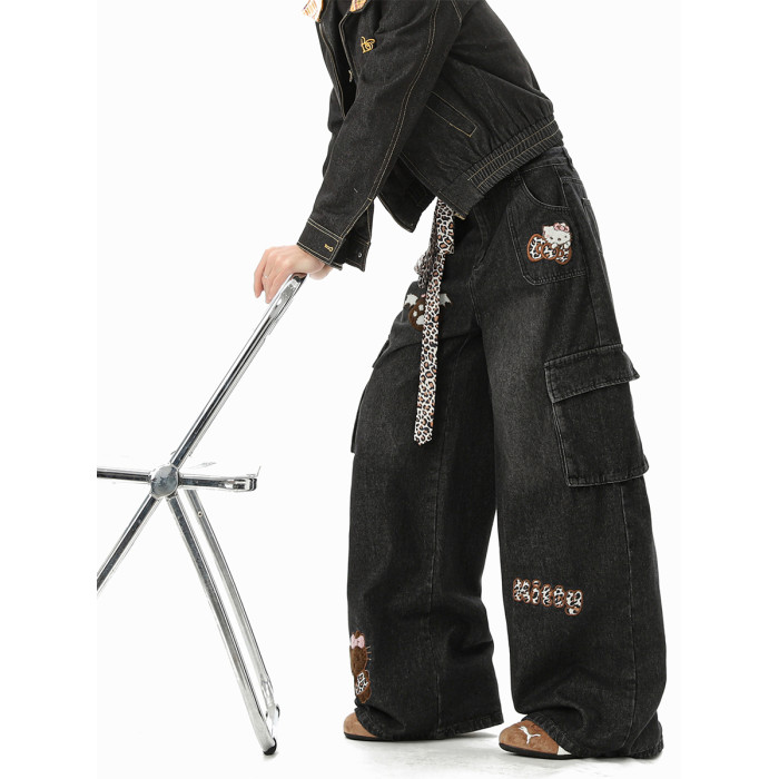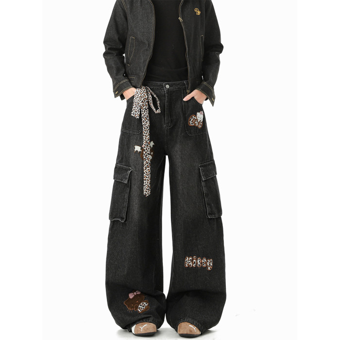 美式豹紋kt貓貼布牛仔褲男冬季潮牌寬鬆水洗大碼多口袋工裝拖地褲