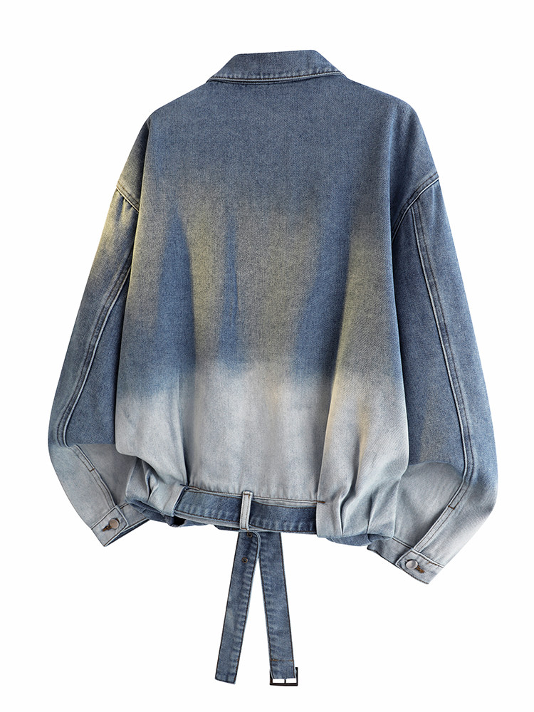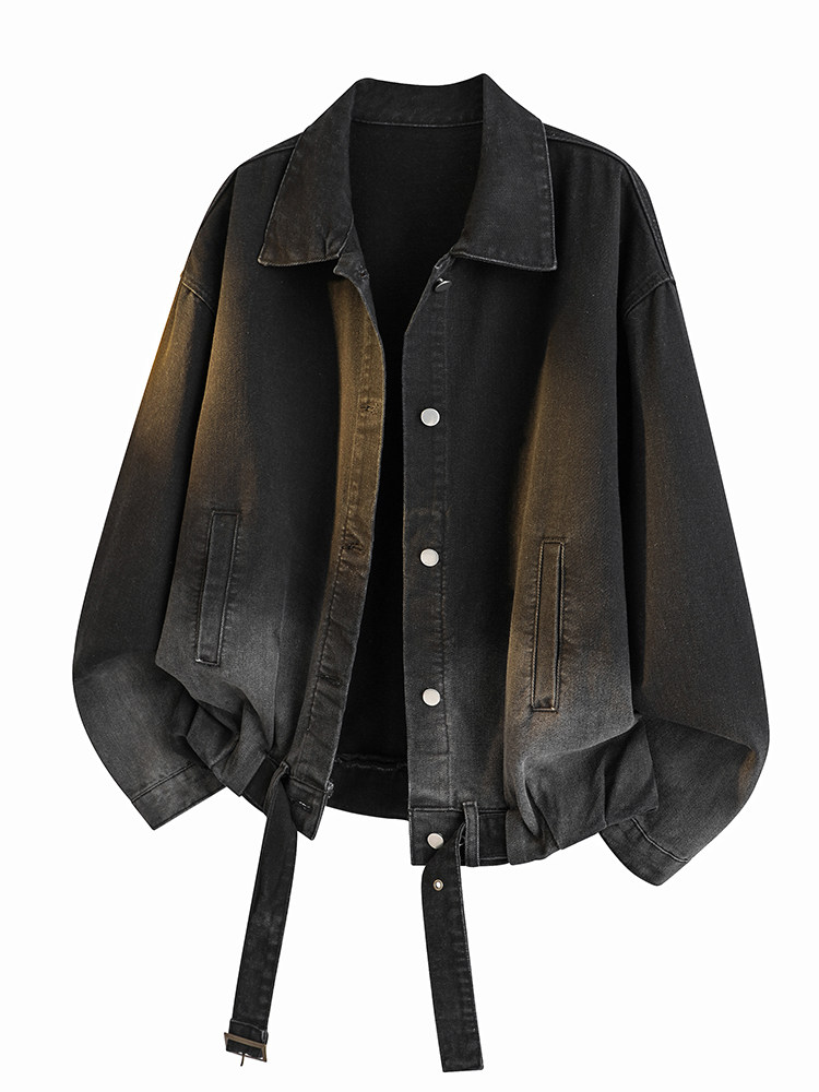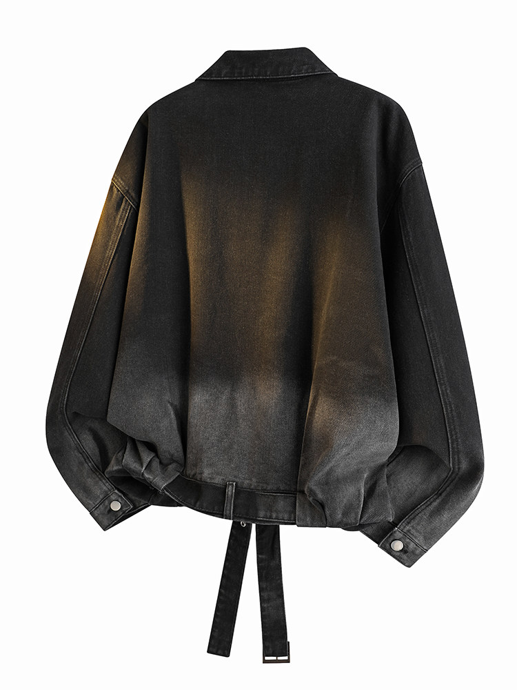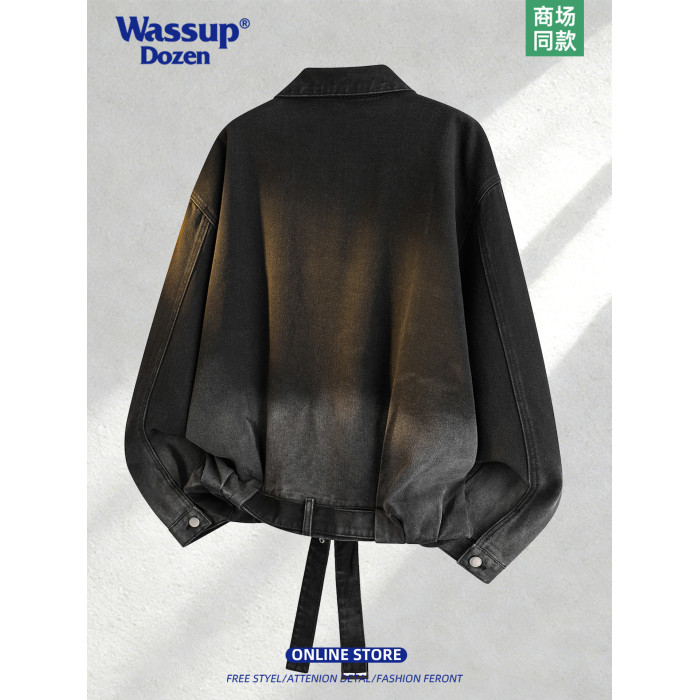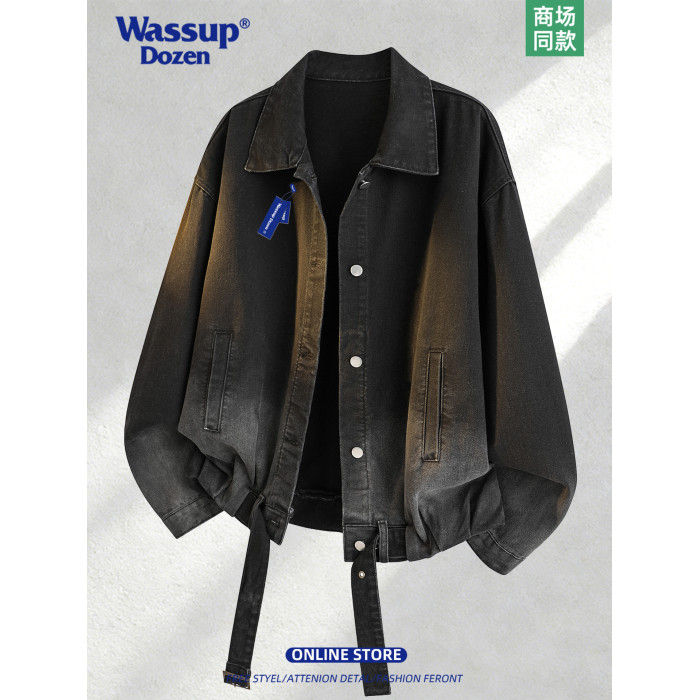 WASSUP DOZEN美式漸變做舊繙領牛仔外套男春寬鬆痞帥休閒百搭夾克