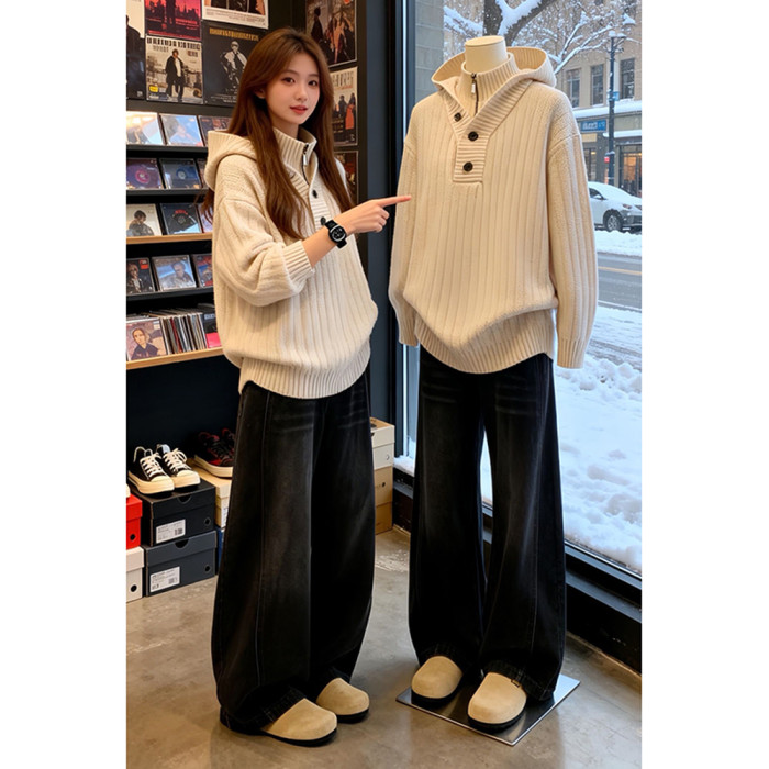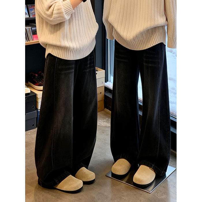 黑色美式微喇牛仔褲男冬季加絨加厚褲子新塘高質量復古寬鬆彎刀褲