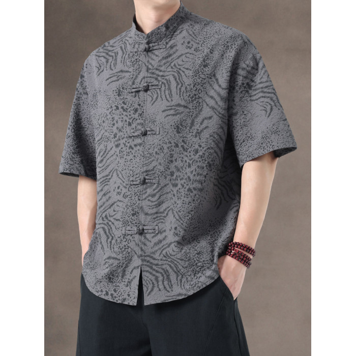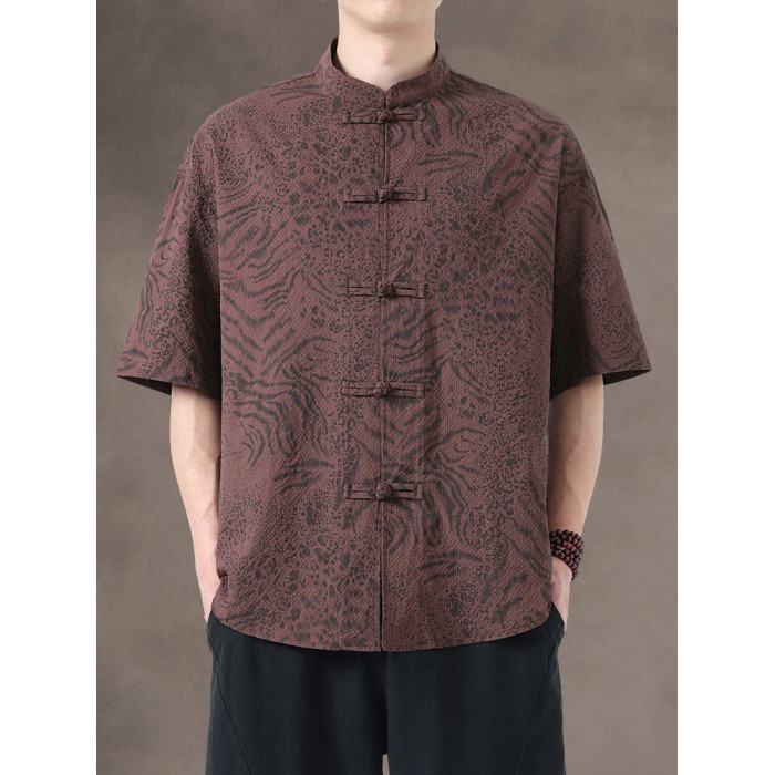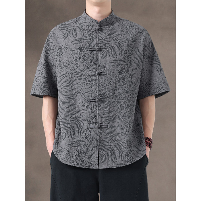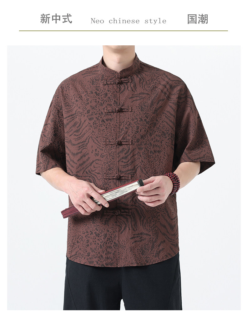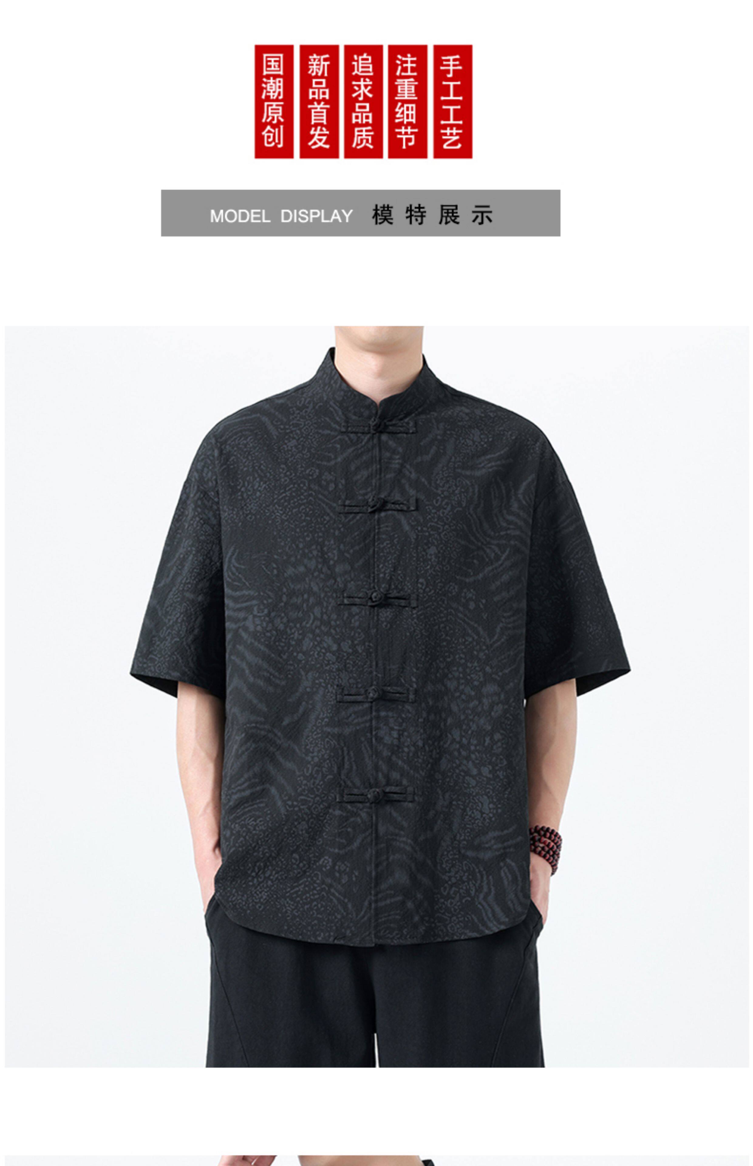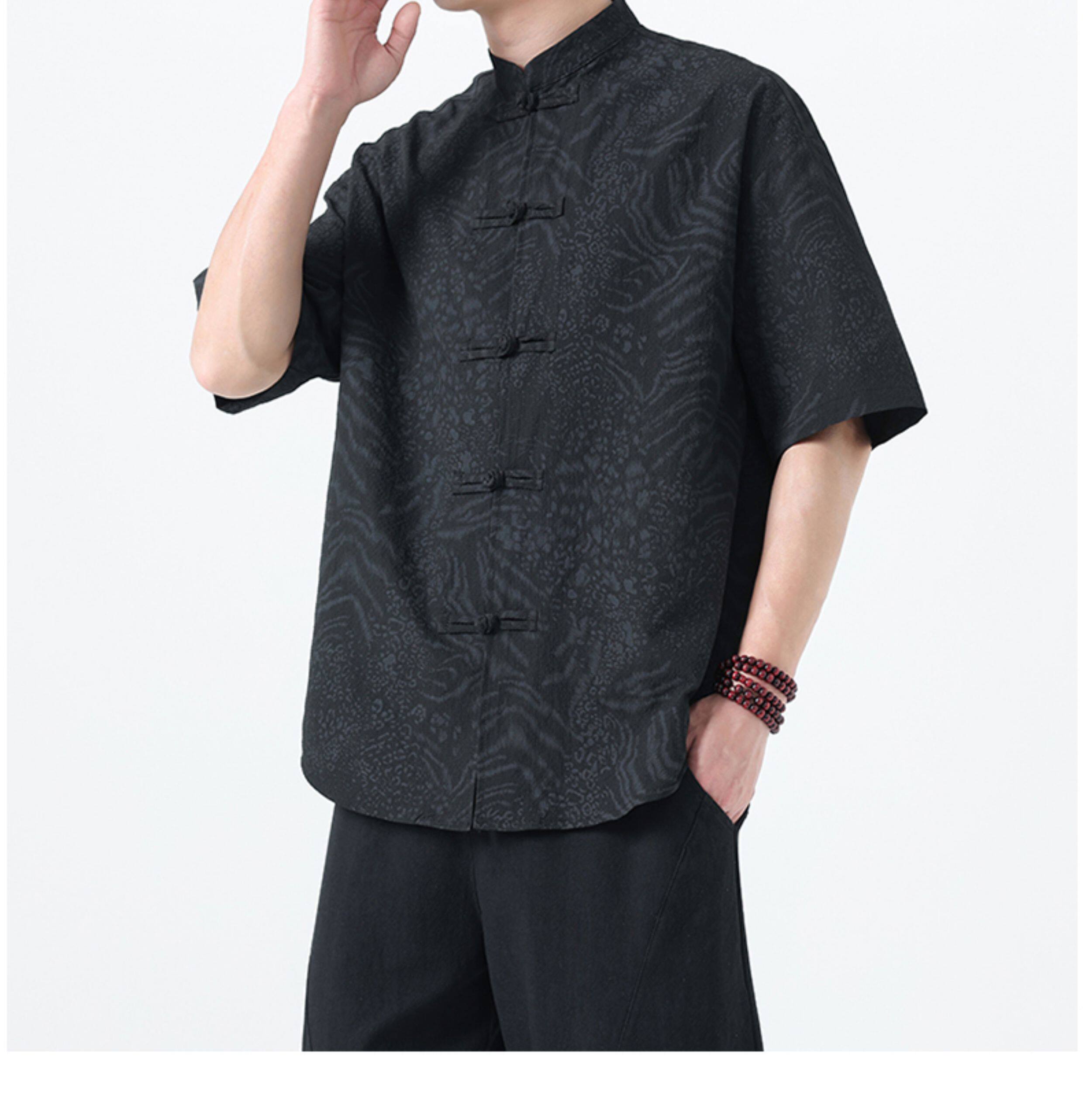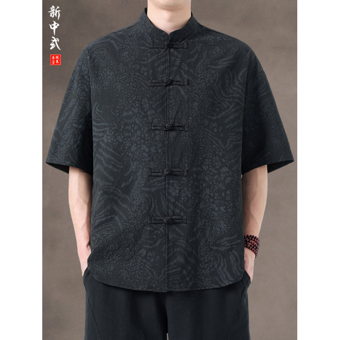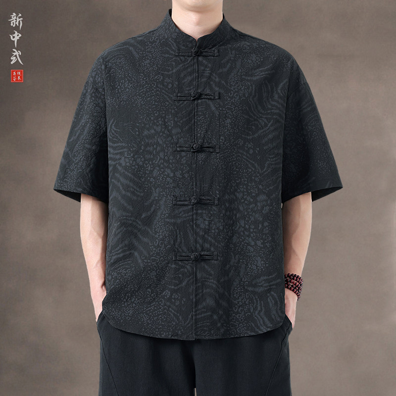 新中式夏季薄款印花唐裝短袖襯衫中式復古大碼立領半袖茶服男上衣