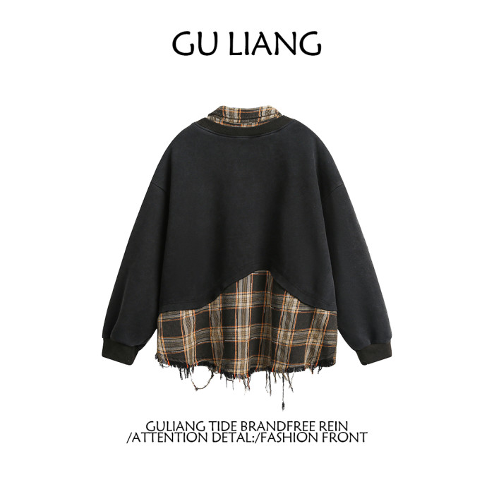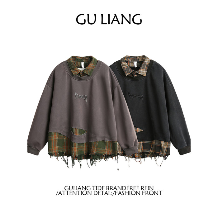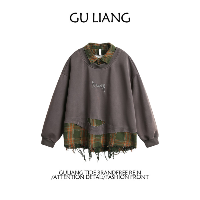 GU LIANG「設計師品牌」/男女同款/小衆假兩件撕裂風百搭情侶衛衣
