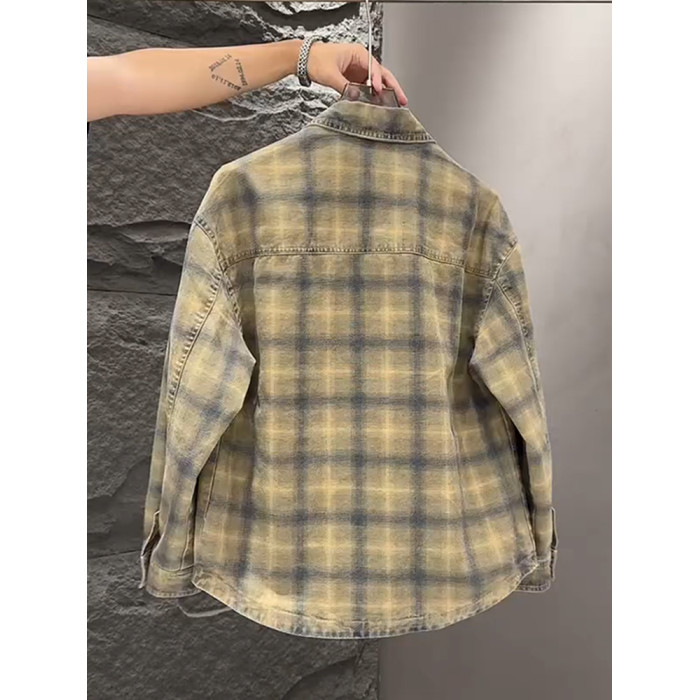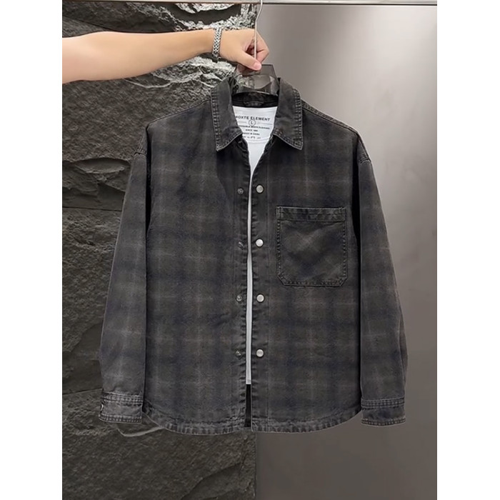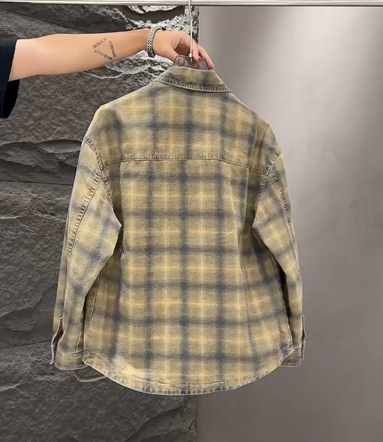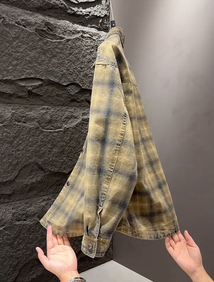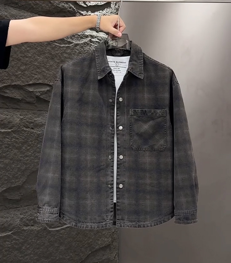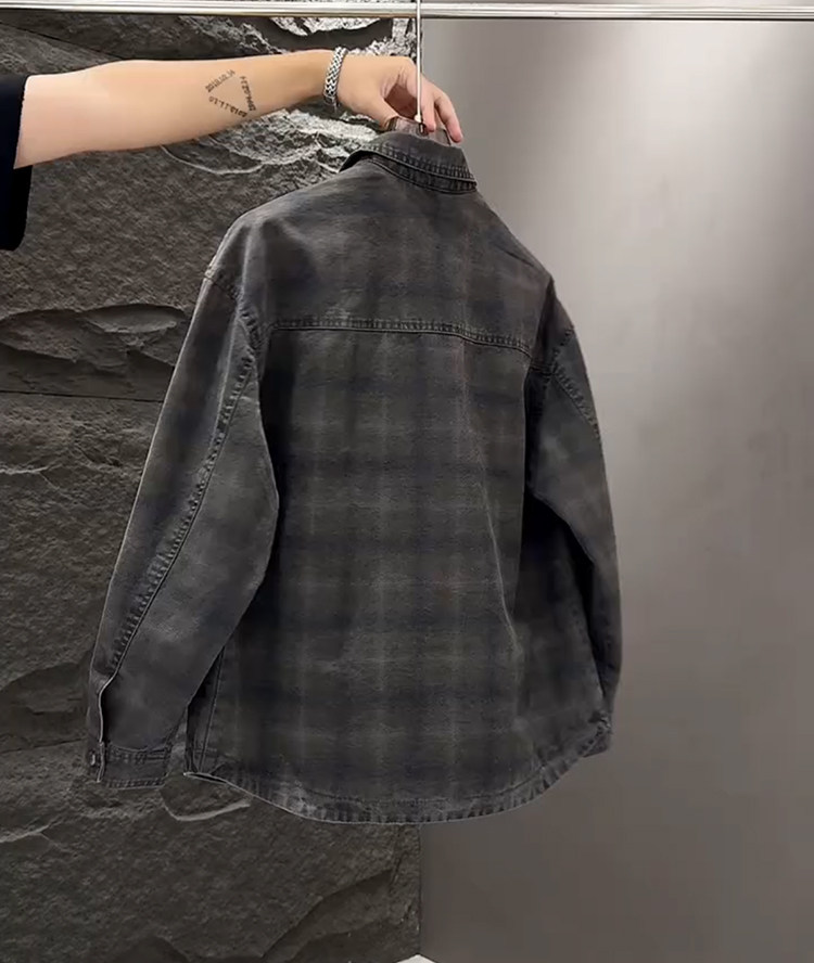 春秋款格子牛仔外套男款潮牌高級感2026新款寬鬆重磅夾克男美式潮