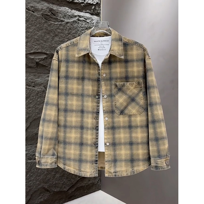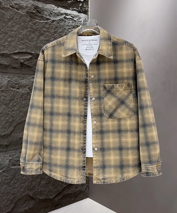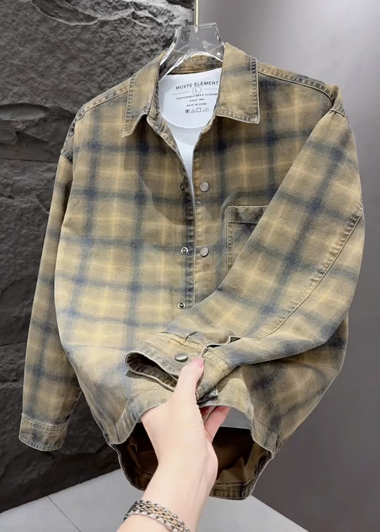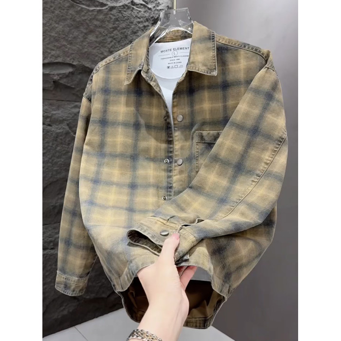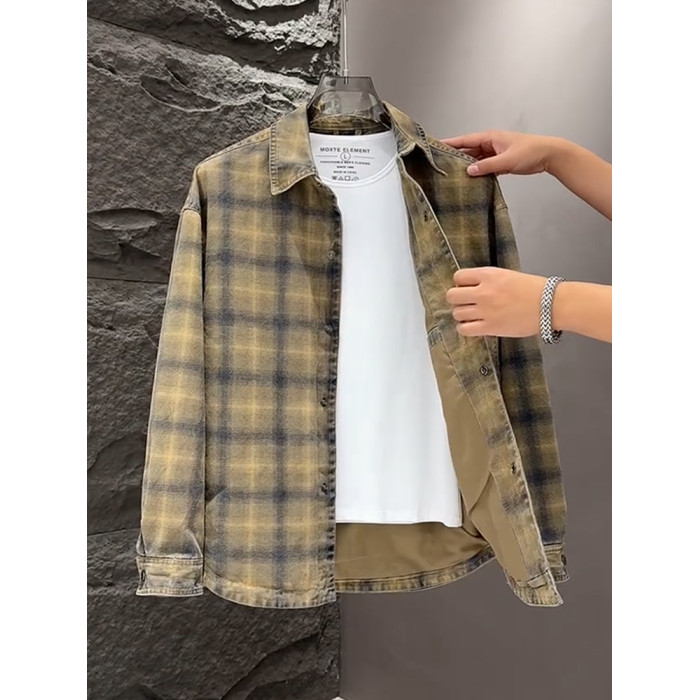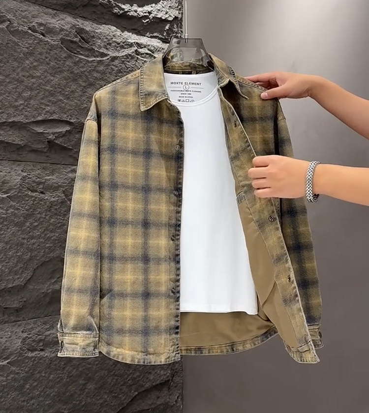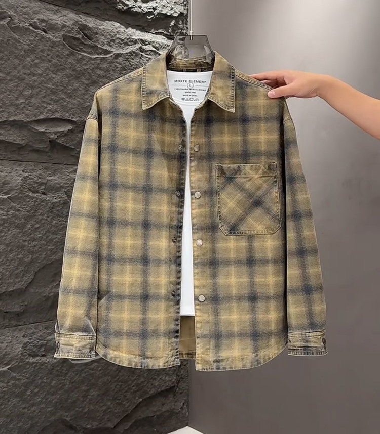 春秋款格子牛仔外套男款潮牌高級感2026新款寬鬆重磅夾克男美式潮