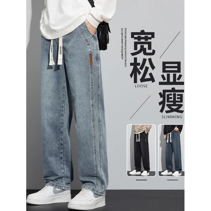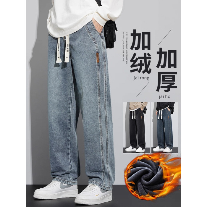 策息加絨加厚保暖秋冬牛仔褲子男款寬鬆直筒美式高街濶腿休閒長褲