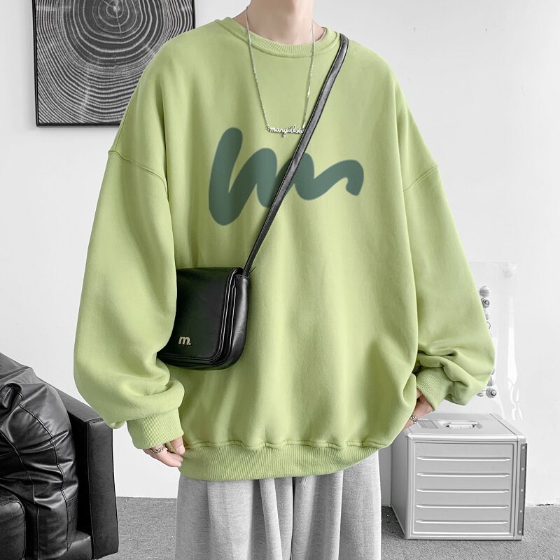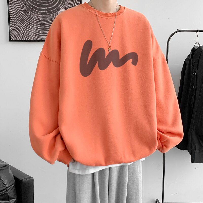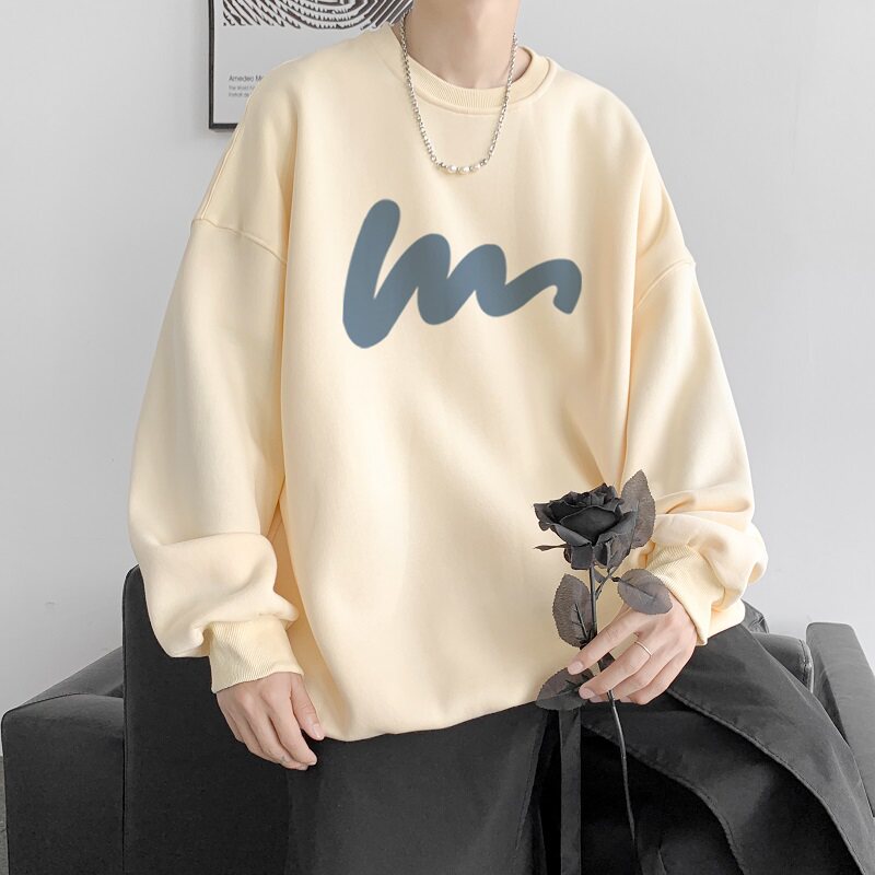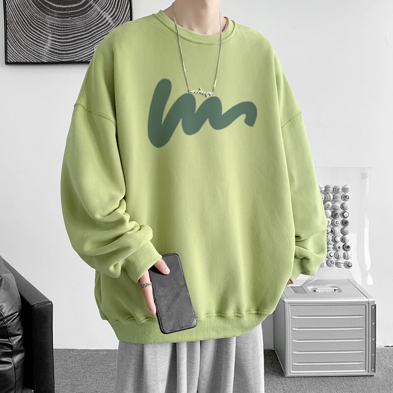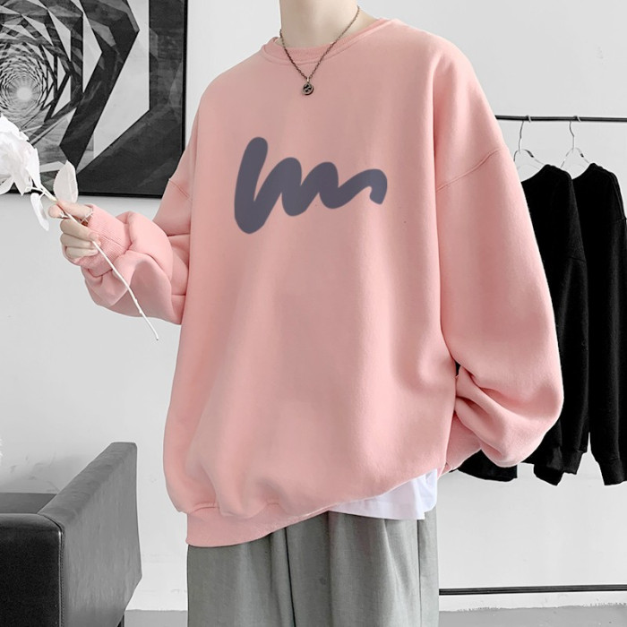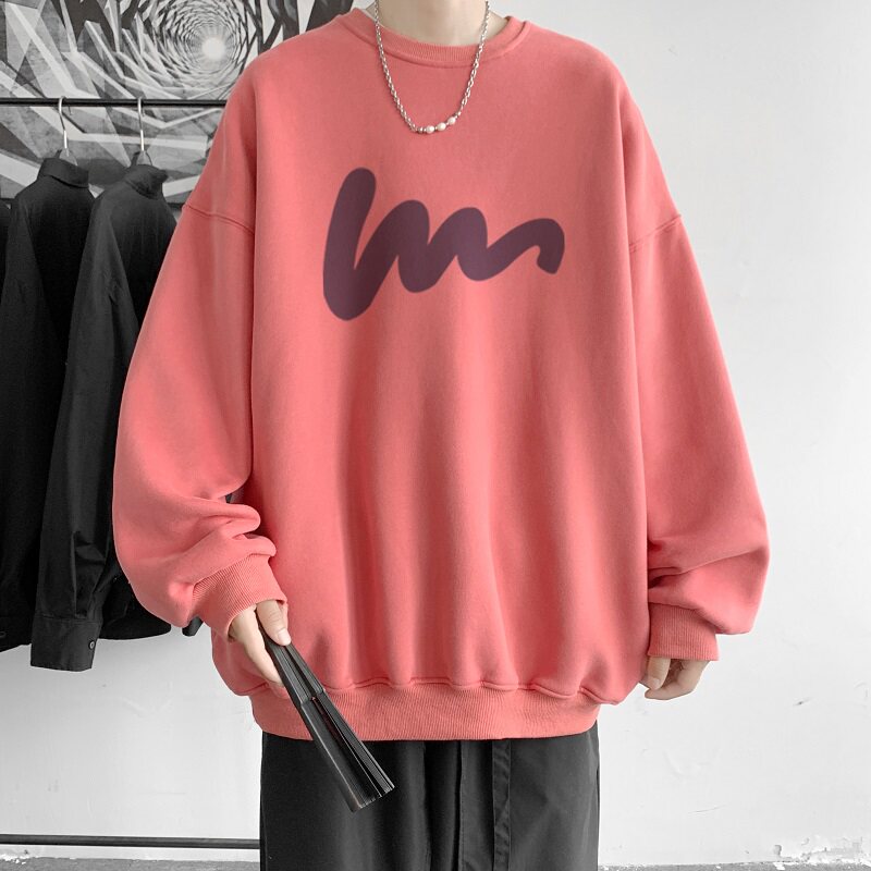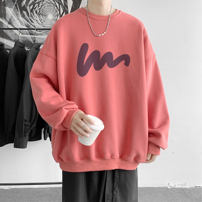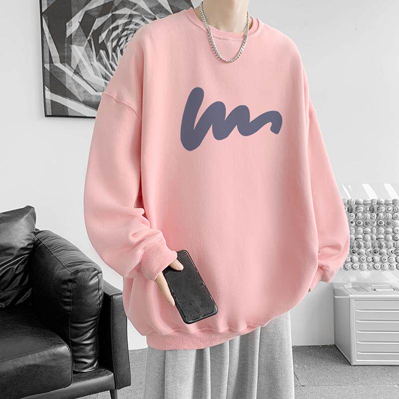 600G重磅粉色印花圓領衛衣男春季加絨長袖T恤落肩打底衫外套潮流