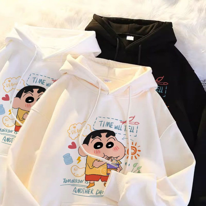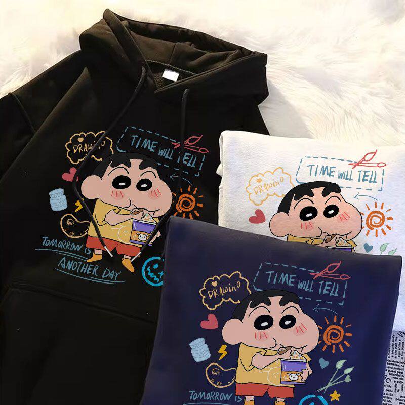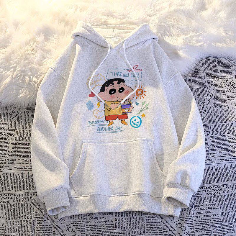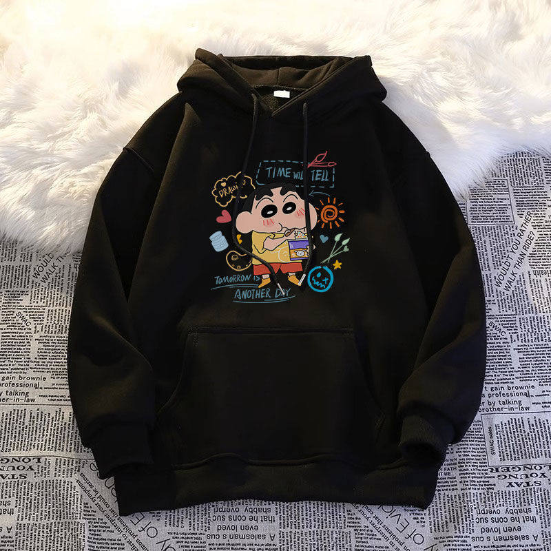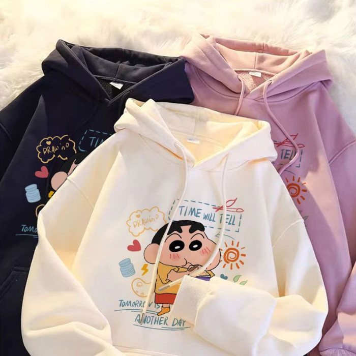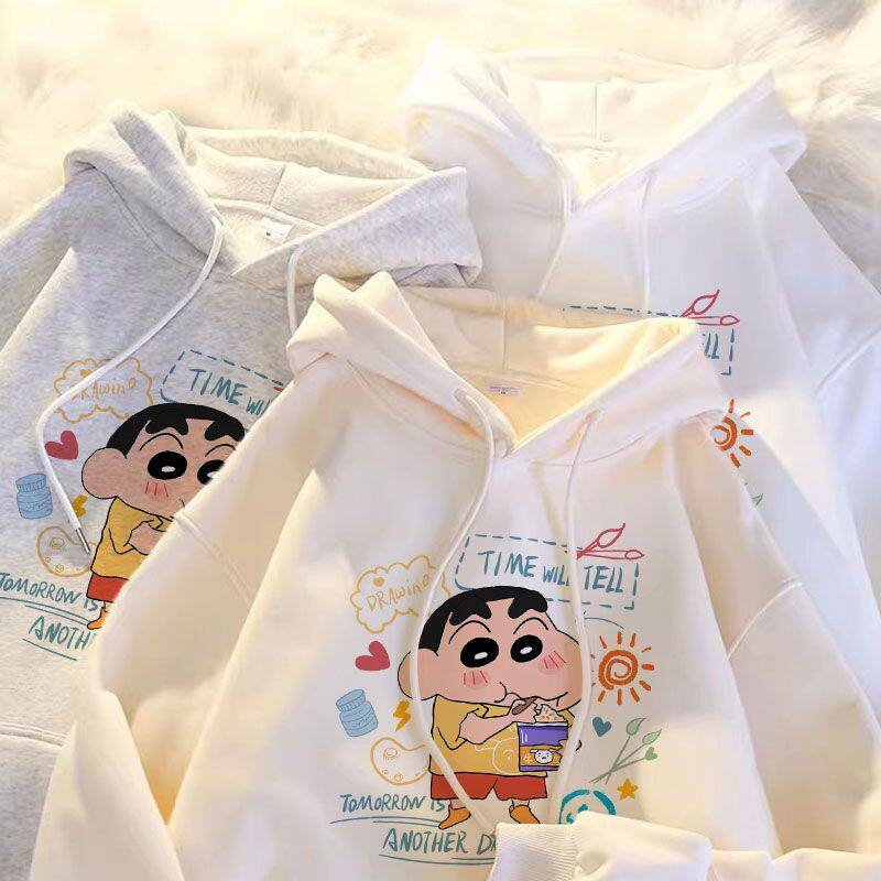 銀狐絨日系百搭蠟筆小新印花連帽衛衣情侶裝ins寬鬆秋冬季上衣男