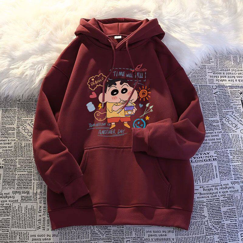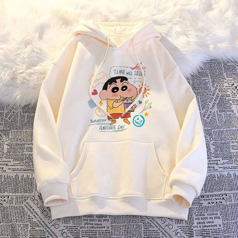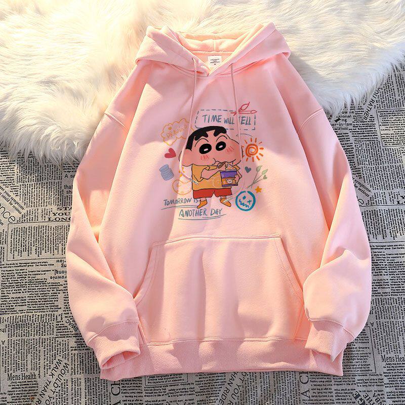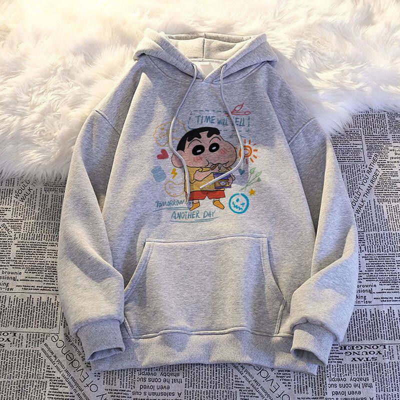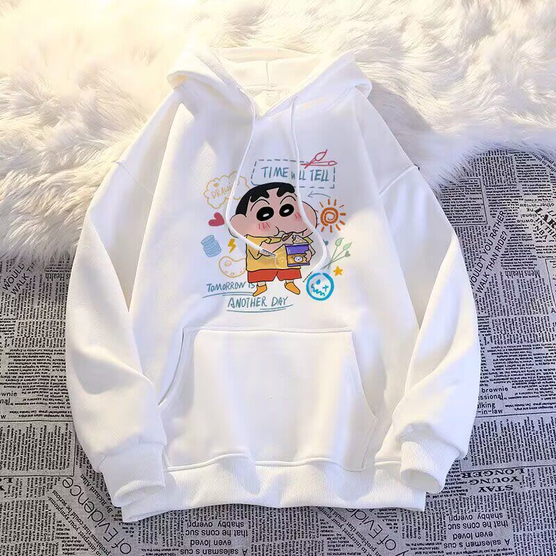 銀狐絨日系百搭蠟筆小新印花連帽衛衣情侶裝ins寬鬆秋冬季上衣男