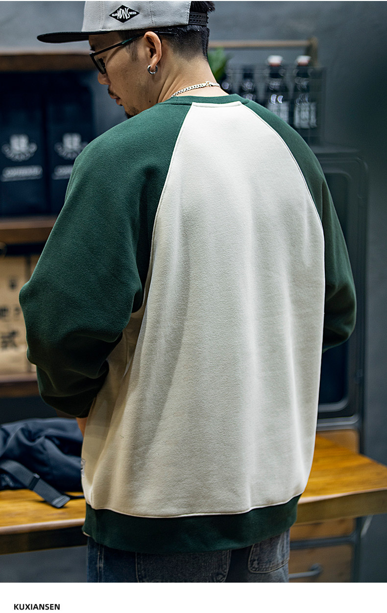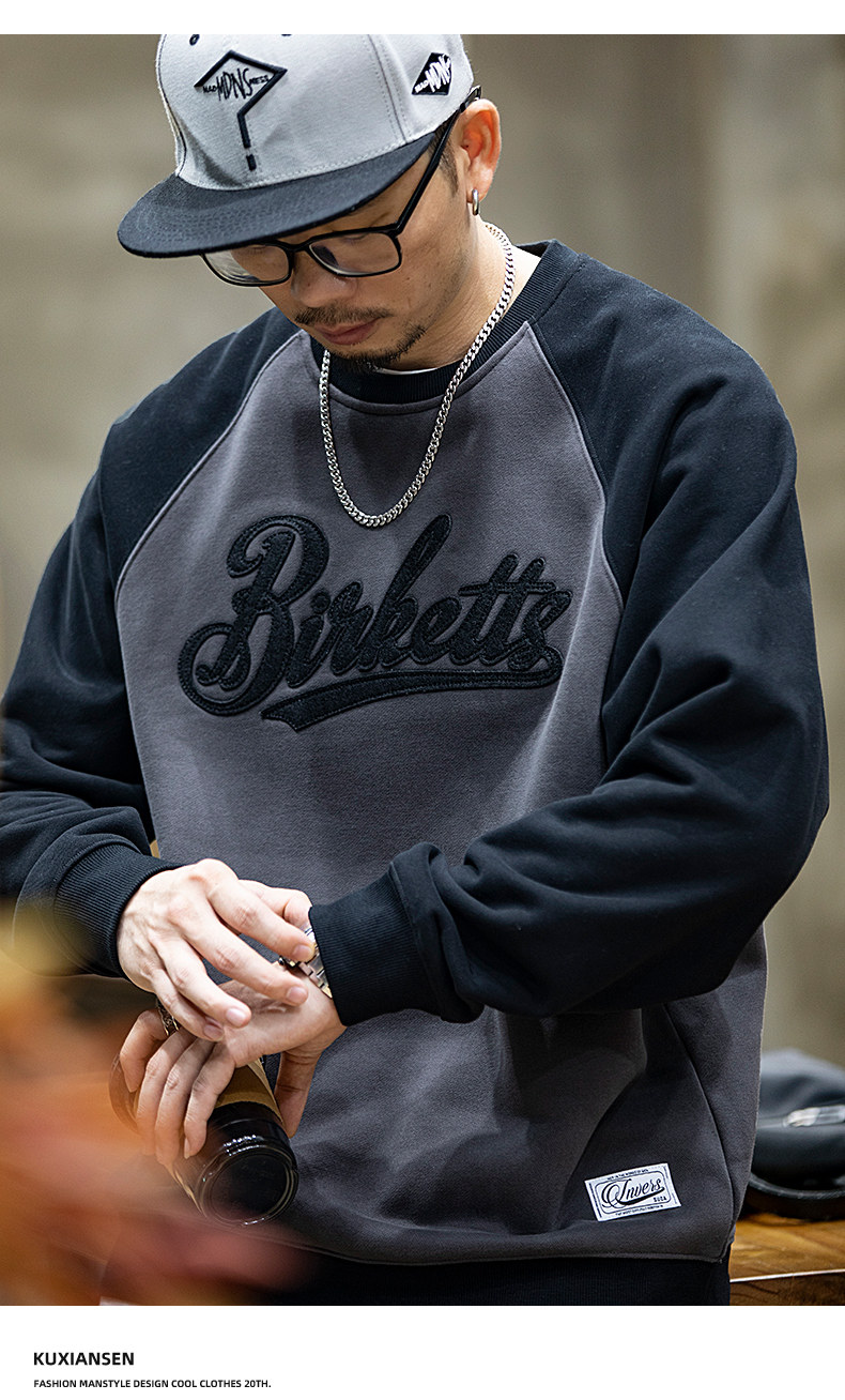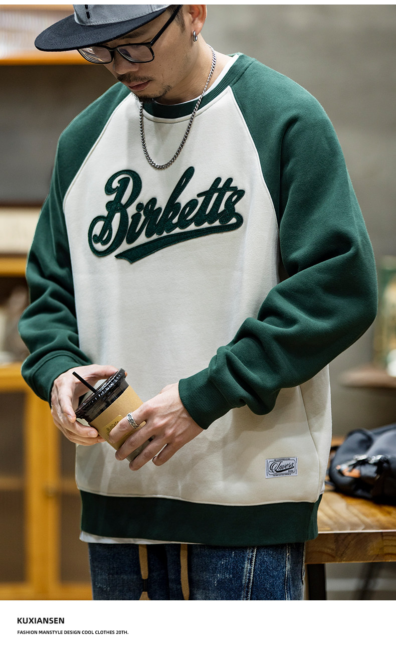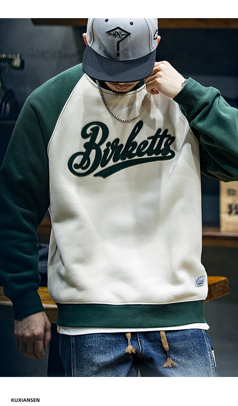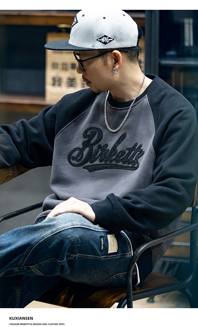 美式復古拼接衛衣男春季寬鬆潮牌刺綉圓領上衣大碼撞色休閒外套潮
