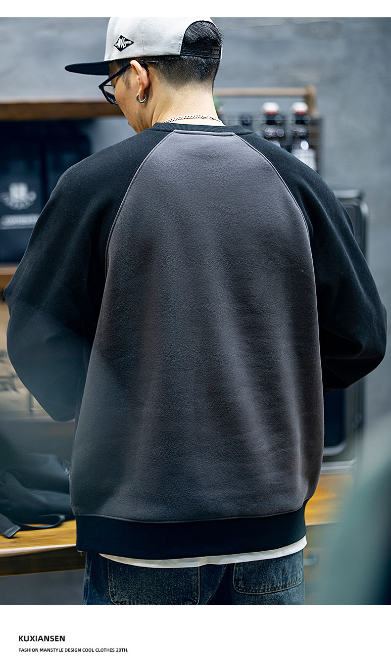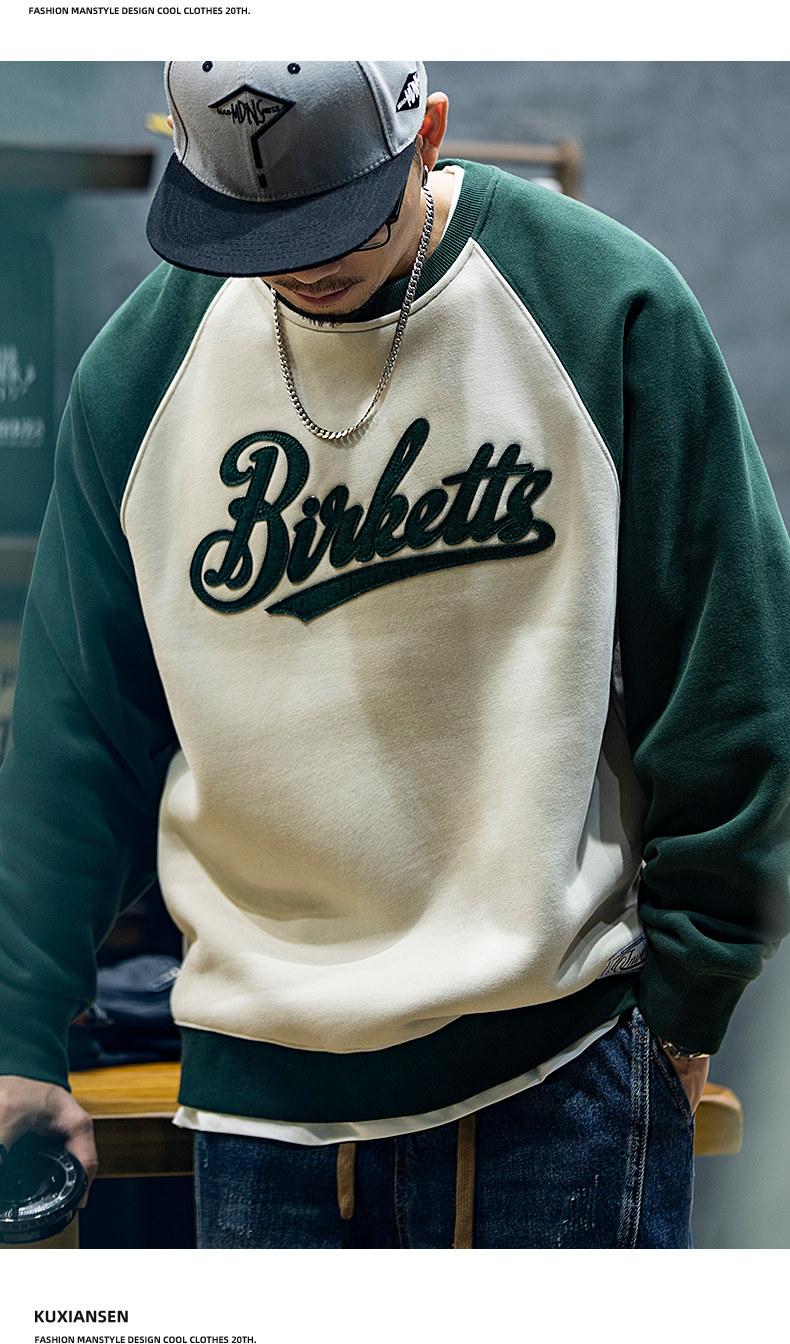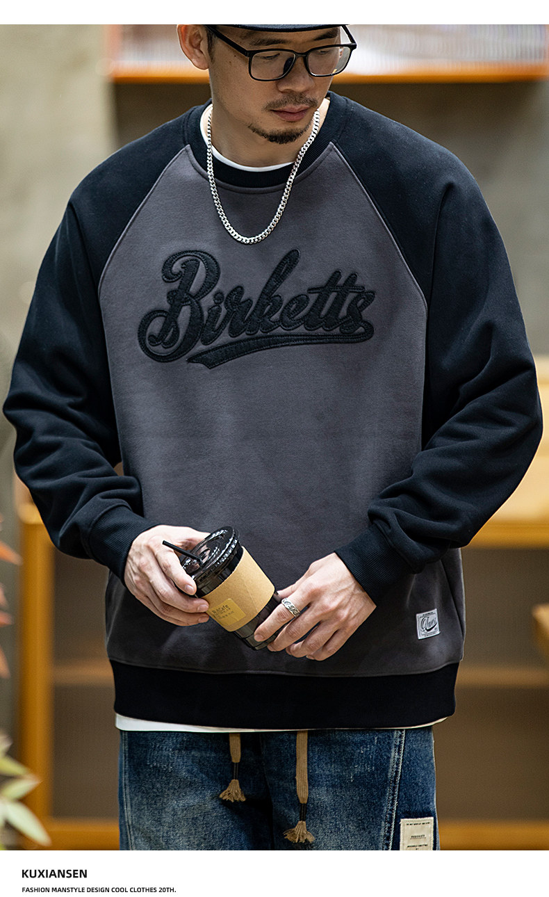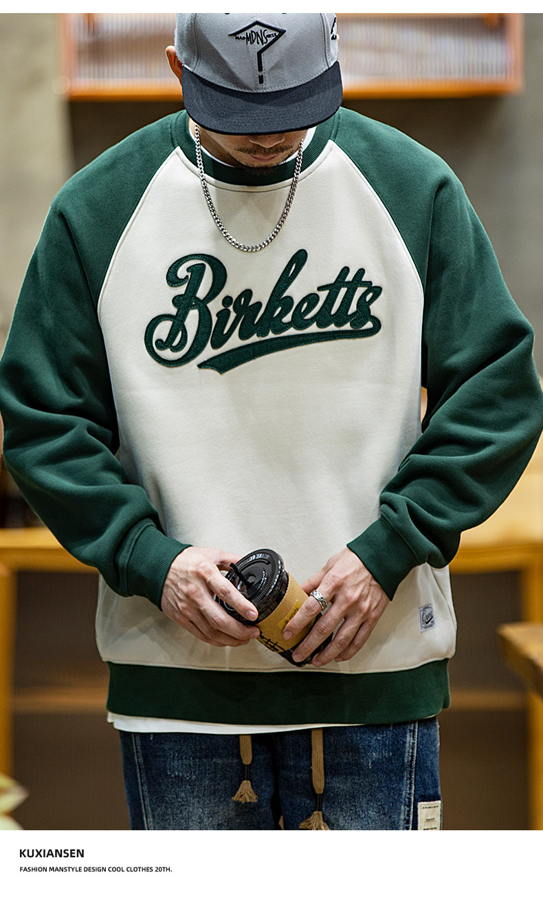 美式復古拼接衛衣男春季寬鬆潮牌刺綉圓領上衣大碼撞色休閒外套潮