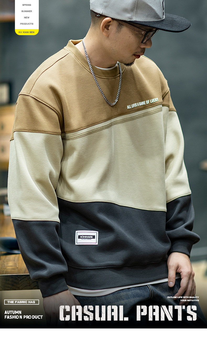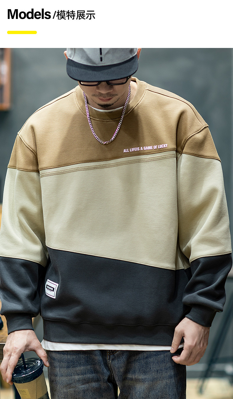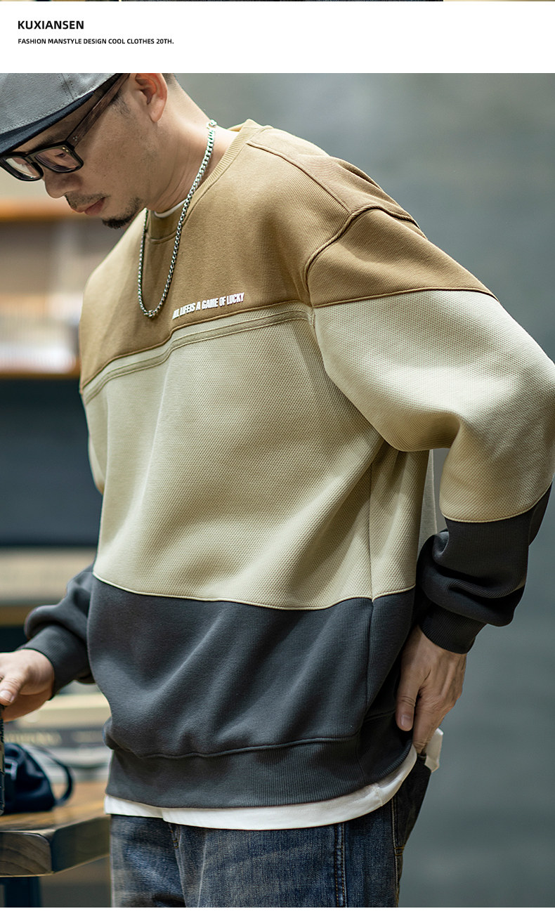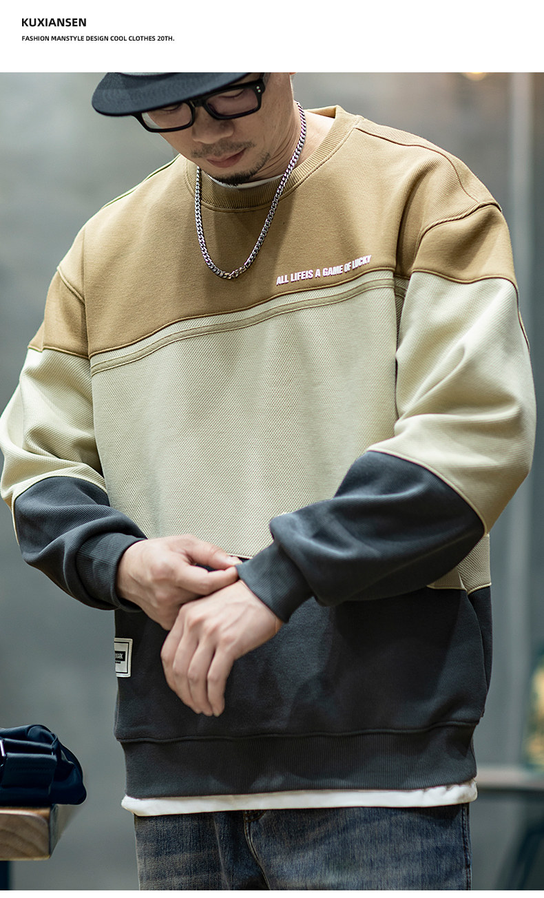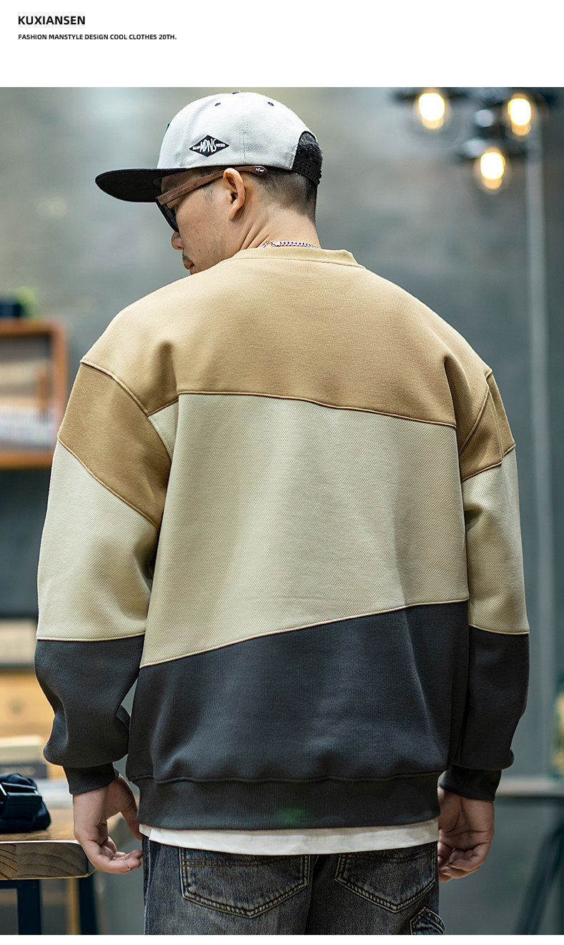 美式復古拼接衛衣男寬鬆潮牌撞色休閒上衣男士潮流大碼圓領外套潮