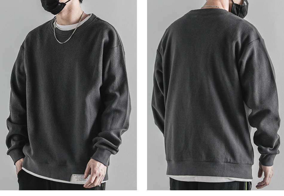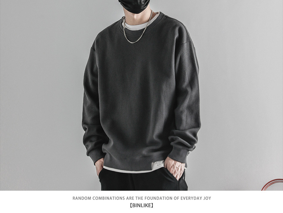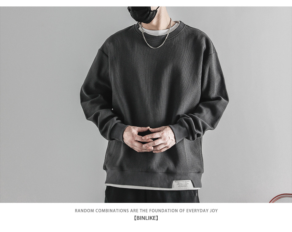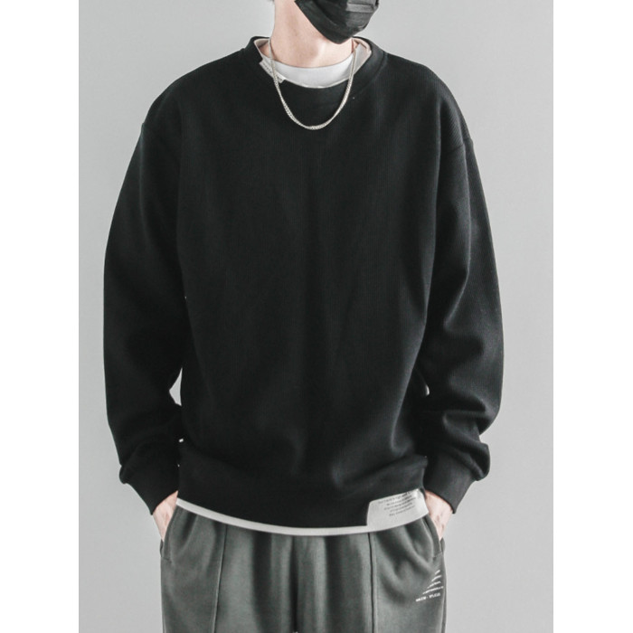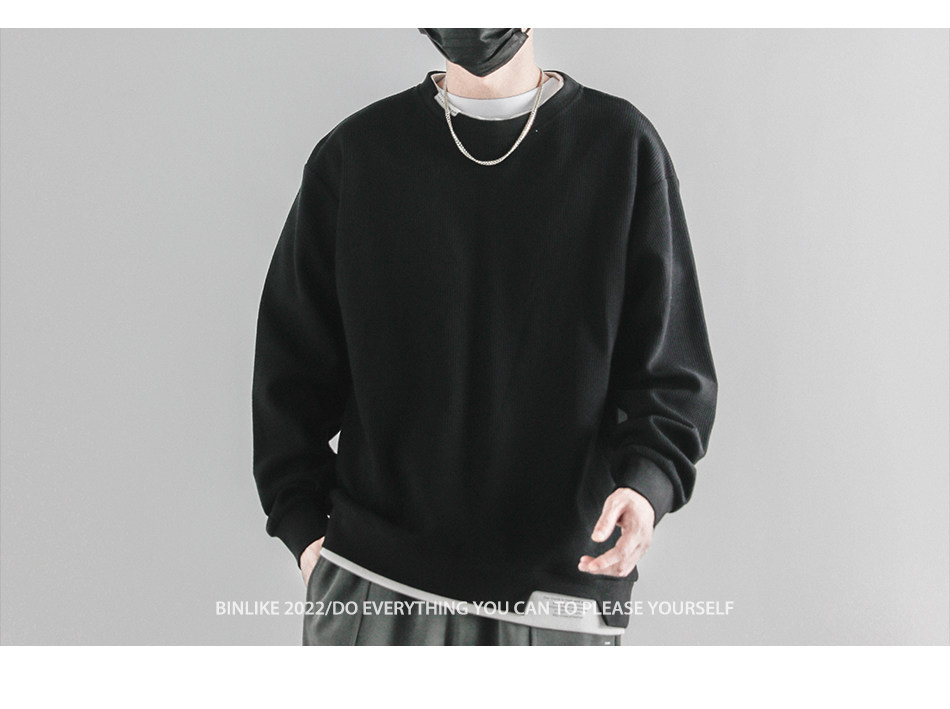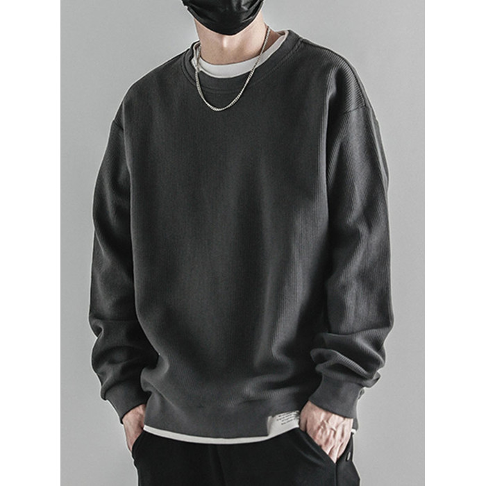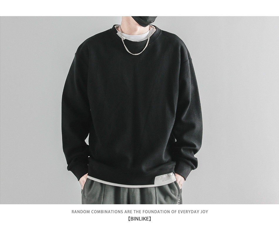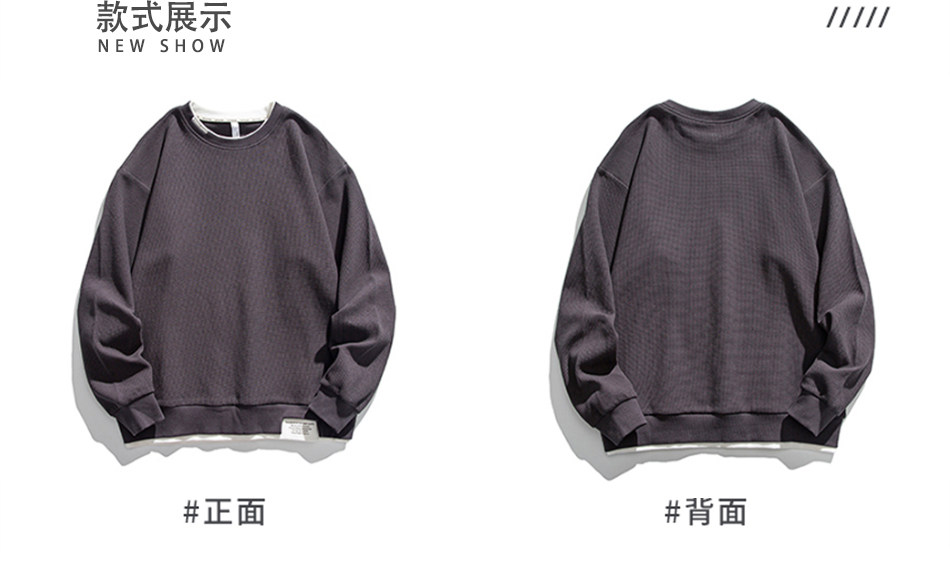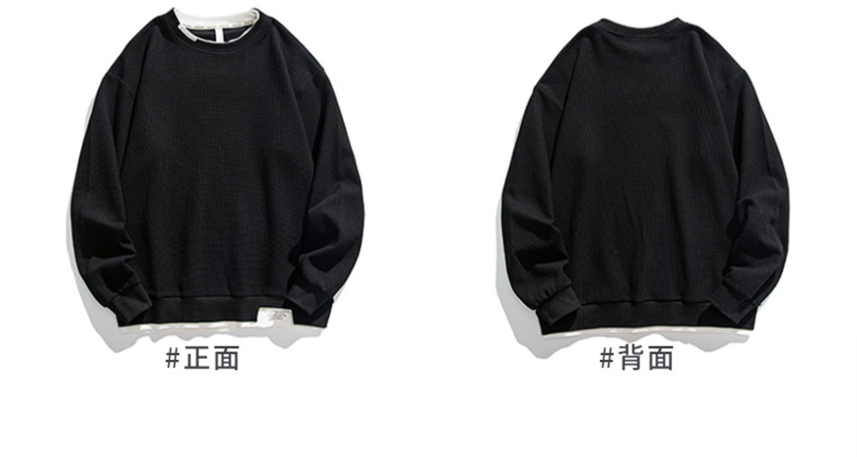 日系重磅圓領復古加絨加厚假兩件衛衣男秋冬季外套百搭華夫格上衣
