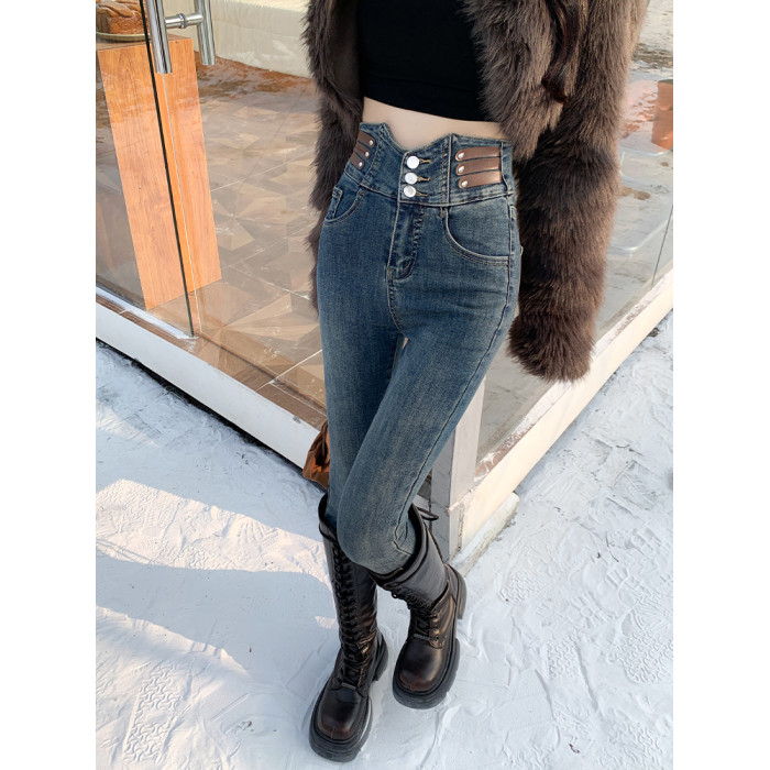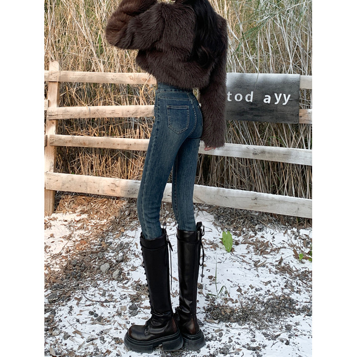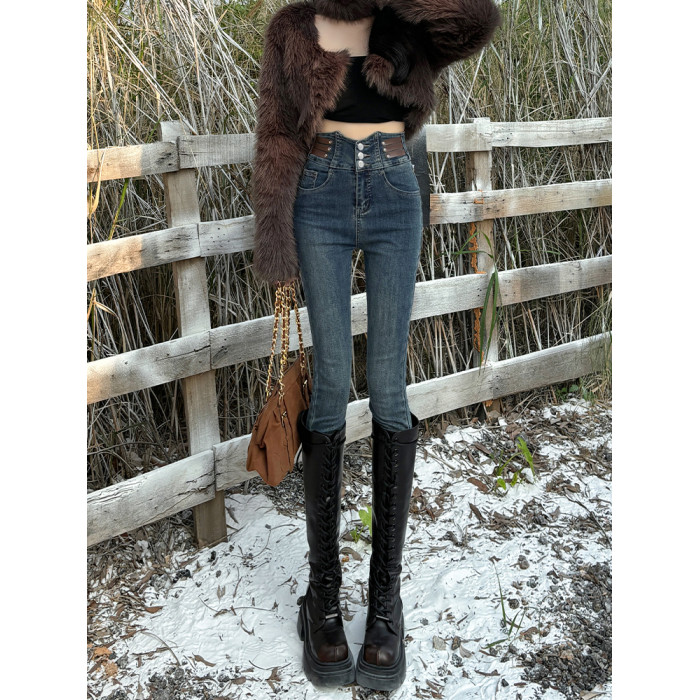 拉夏貝爾復古藍高腰緊身加絨牛仔褲女2026秋冬新款修身鉛筆小腳褲