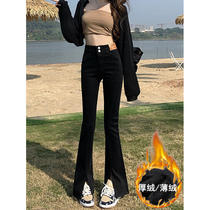 韓國黑色前開叉微喇叭牛仔褲女2025年秋冬加絨修身高腰拖地喇叭褲