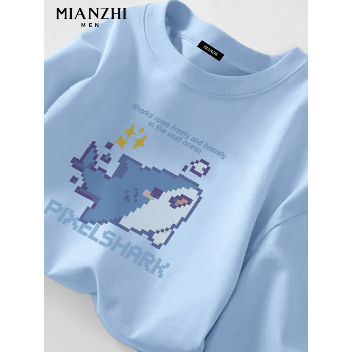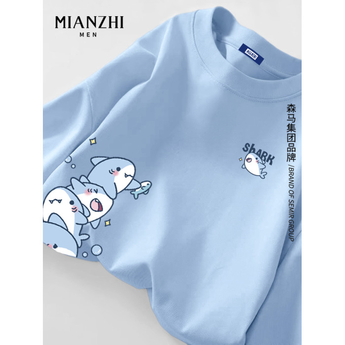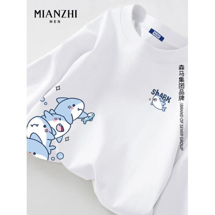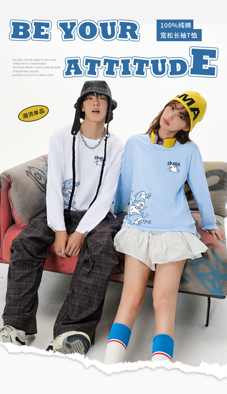 棉致小鯊魚淡藍色長袖t恤男春秋卡通青少年大碼寬鬆潮牌情侶上衣