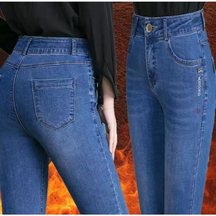 秋冬加絨牛仔褲女高腰彈力直筒寬鬆中年女士帶絨加厚保暖牛仔長褲