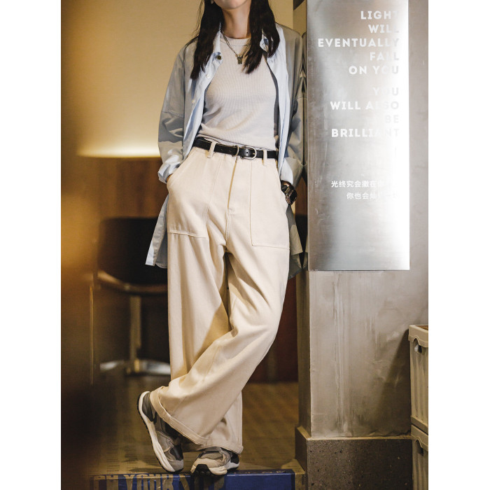 馬登老錢風米白色直筒高腰濶腿牛仔褲垂墜感寬鬆工裝休閒長褲子女
