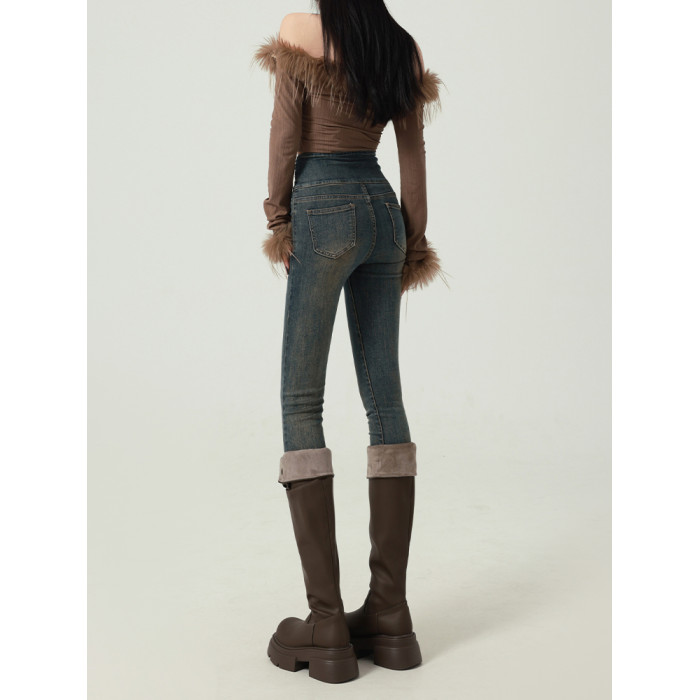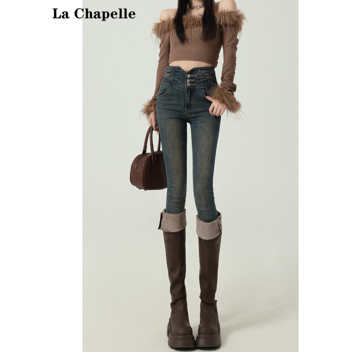拉夏貝爾高腰牛仔褲女2026新款緊身春秋季彈力小腳修身鉛筆長褲子