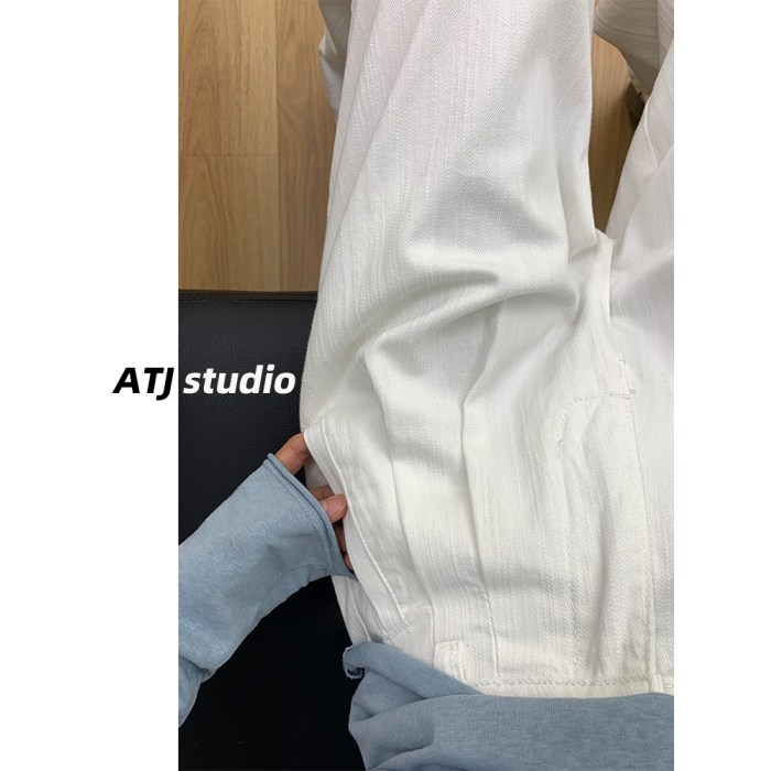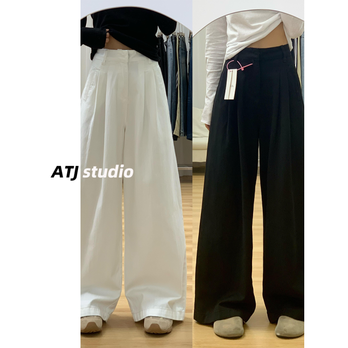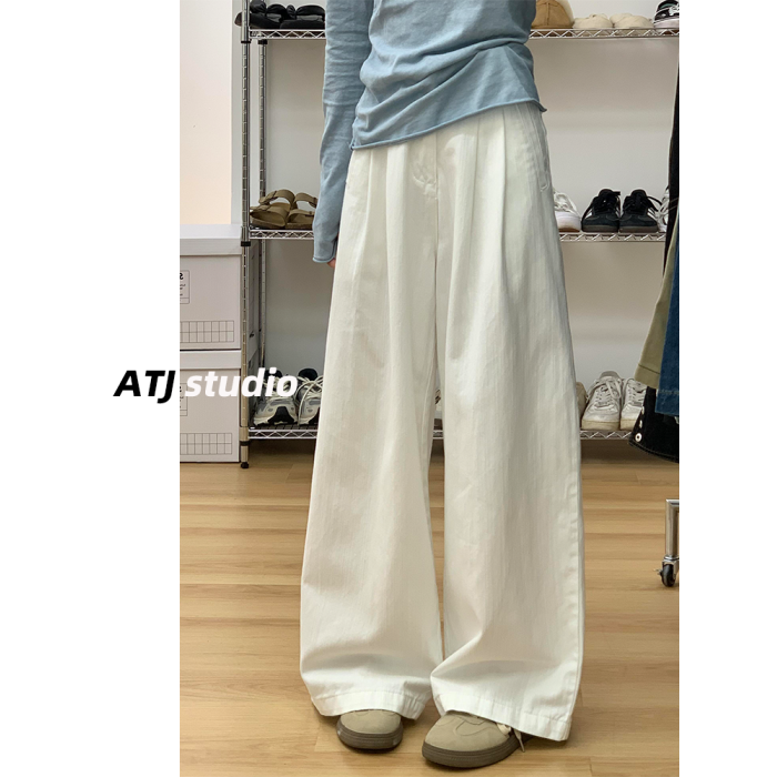 阿頭家白色高腰寬鬆濶腿褲褶皺肌理感直筒牛仔褲女垂感拖地長褲子