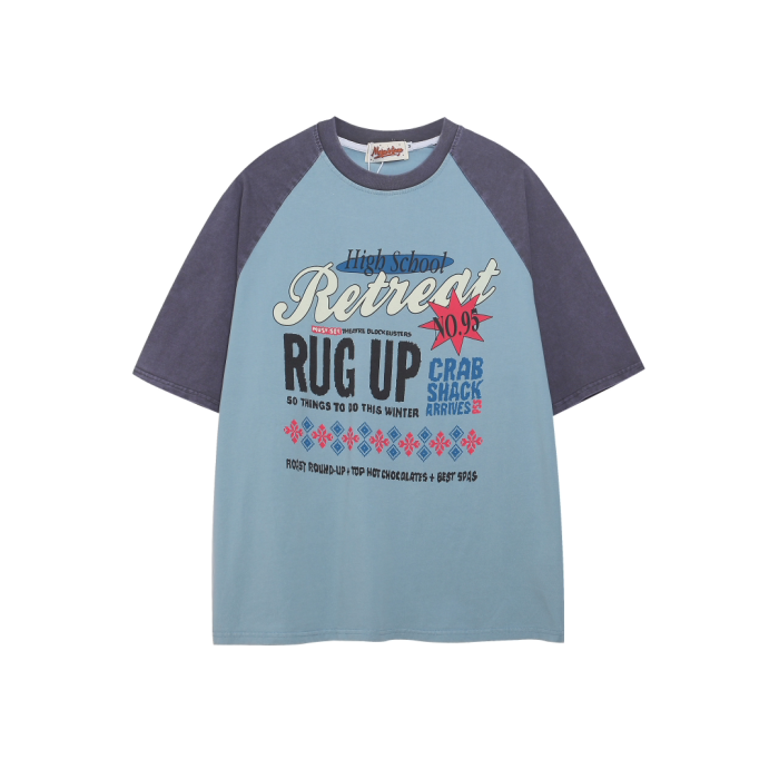 Xman美式vintage插肩袖拼色圓領短袖男t恤夏季新款寬鬆復古體恤潮