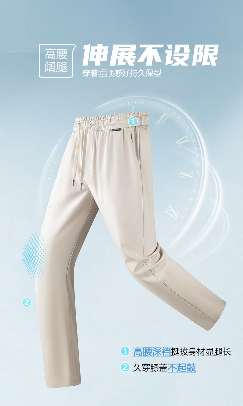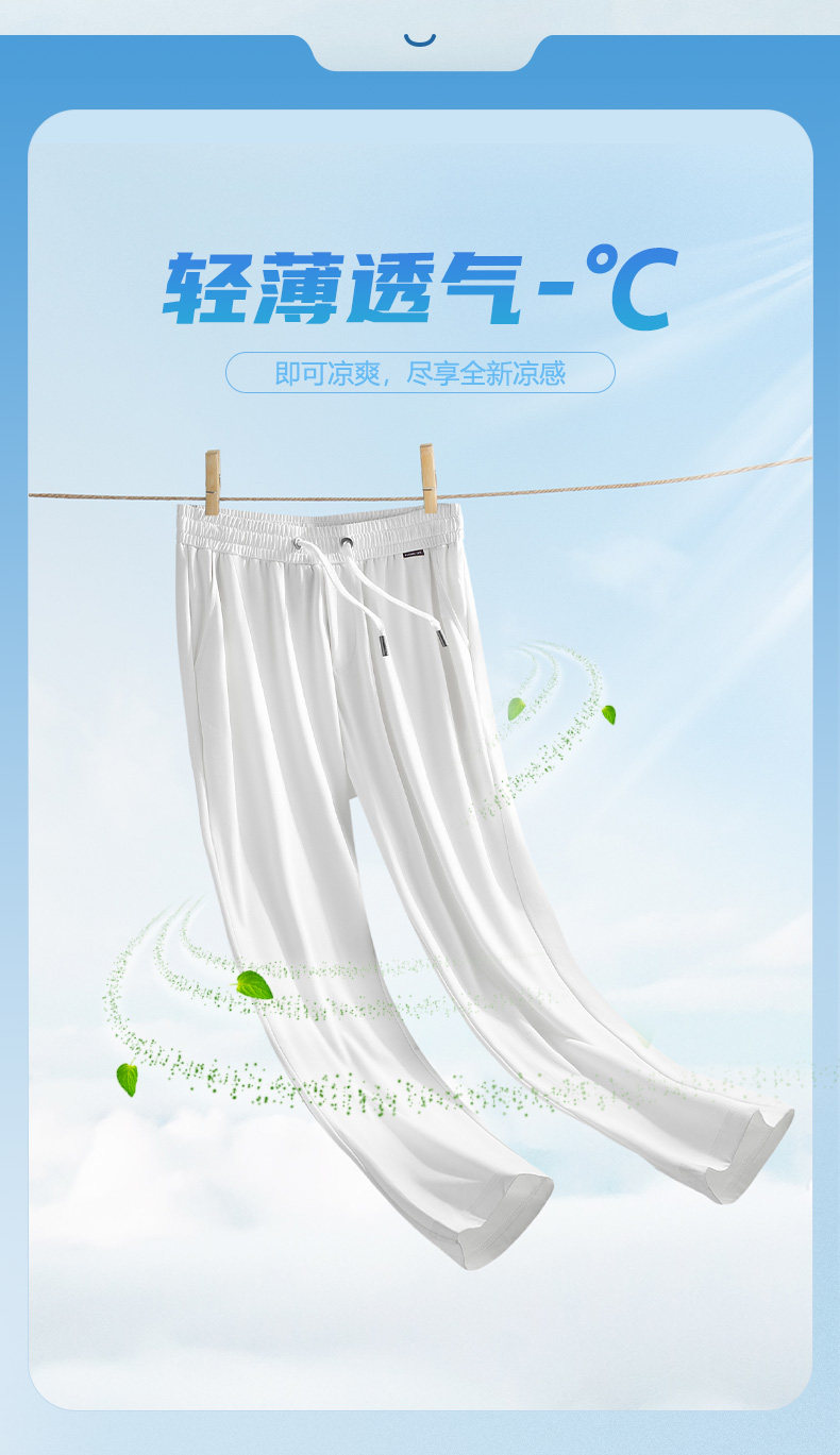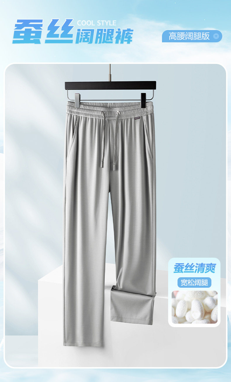 皮爾卡丹桑蠶絲濶腿褲男士夏季薄款寬鬆直筒抗皺冰絲休閒長褲子