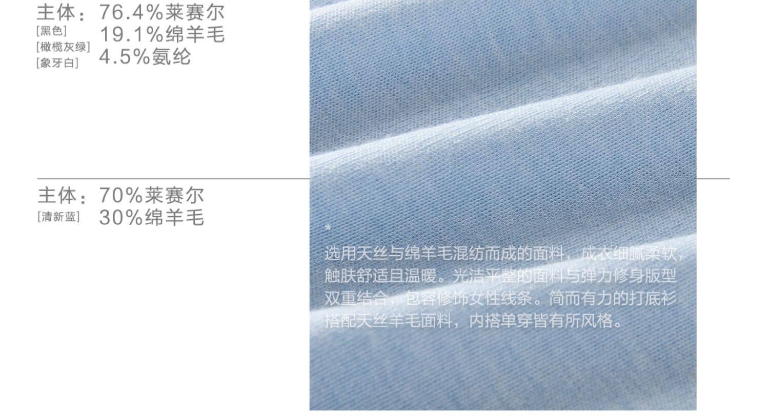 材質成分 萊賽爾纖維(萊賽爾)76.4% 綿羊毛19.1% 聚氨酯彈性纖維(氨綸)4.5%