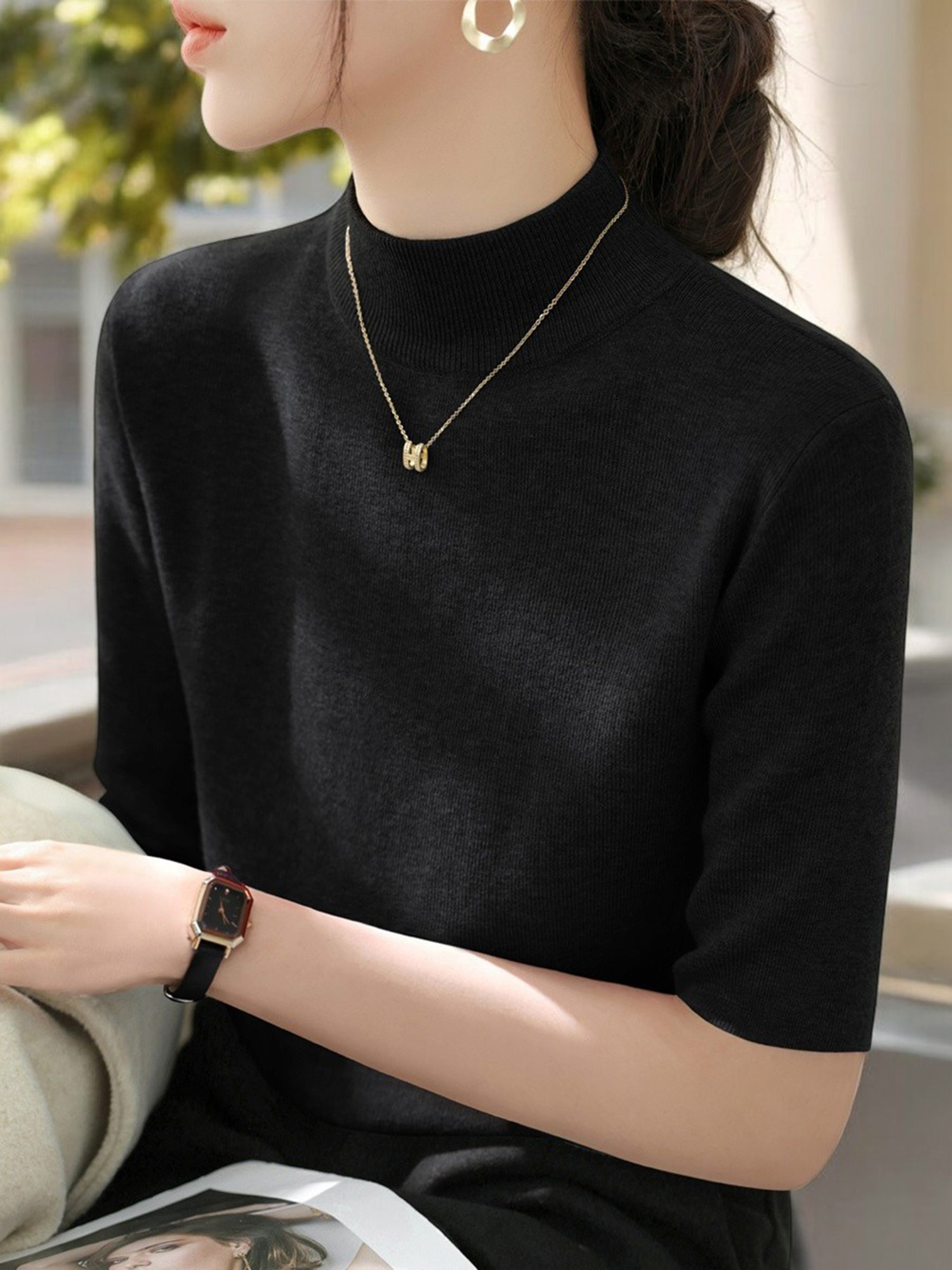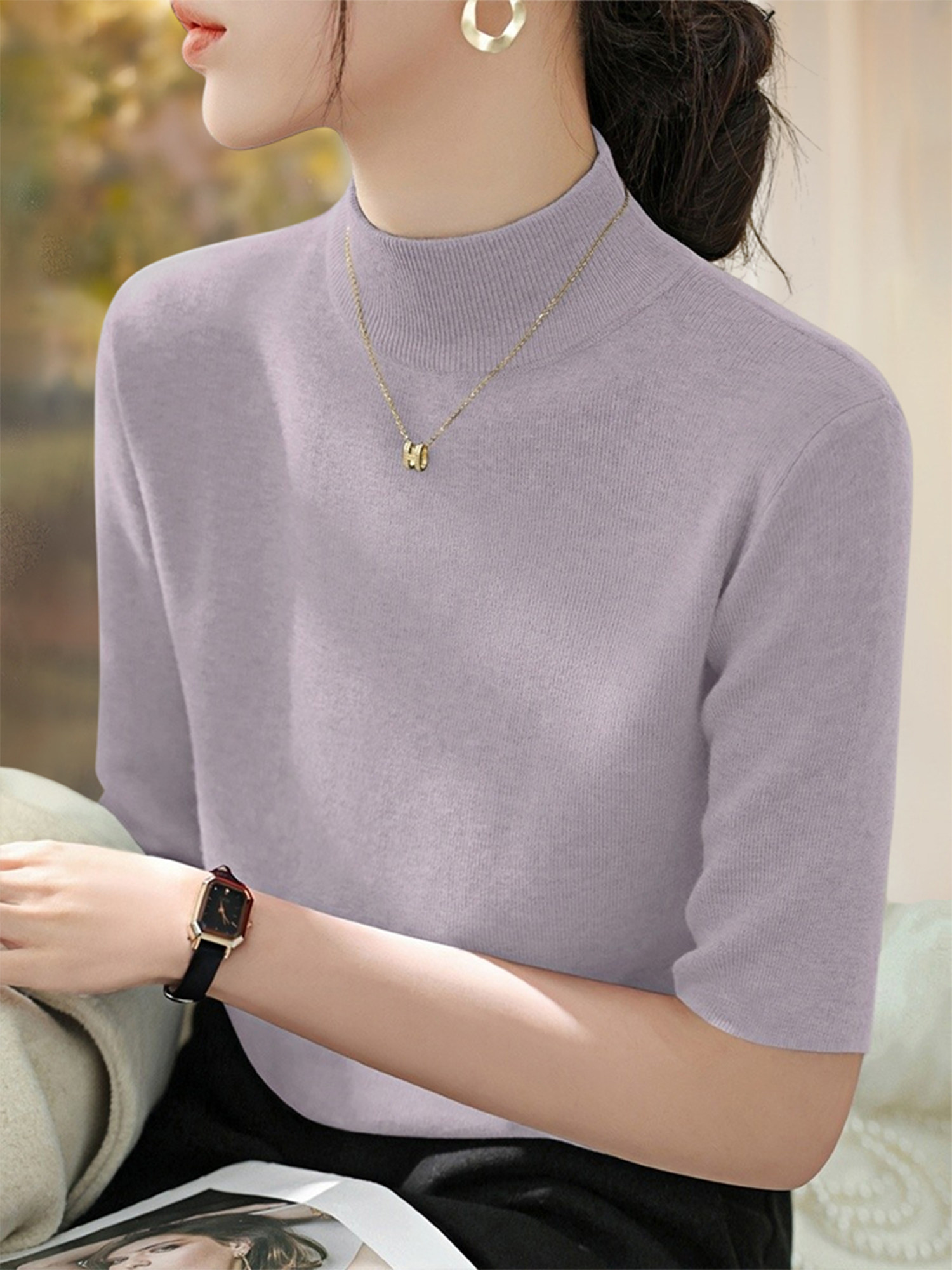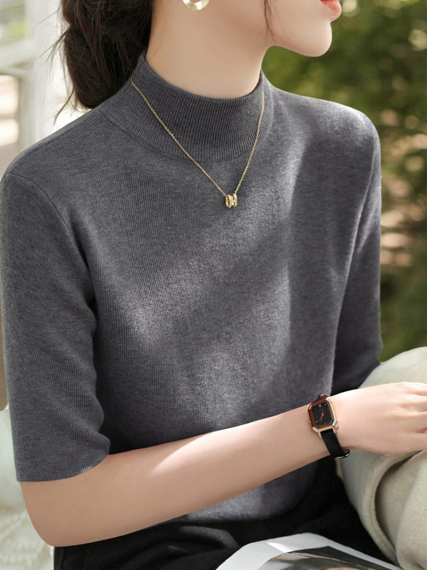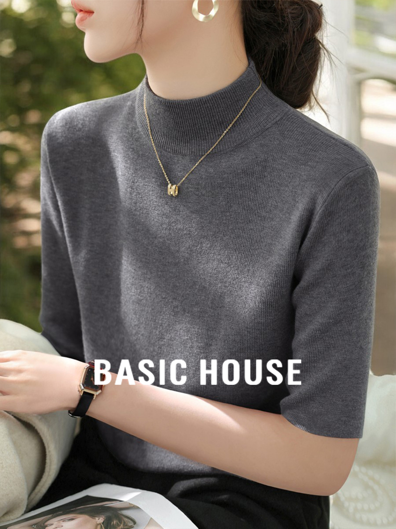 Basic House/百家好灰色半高領五分袖針織衫女2026春夏中袖打底衫