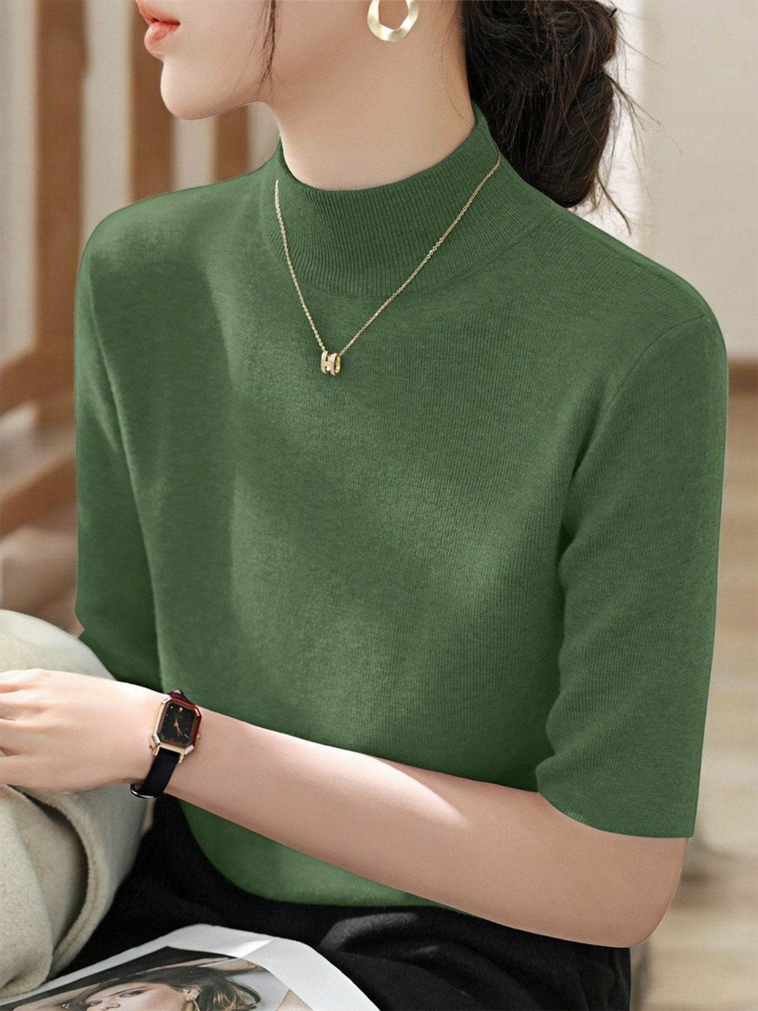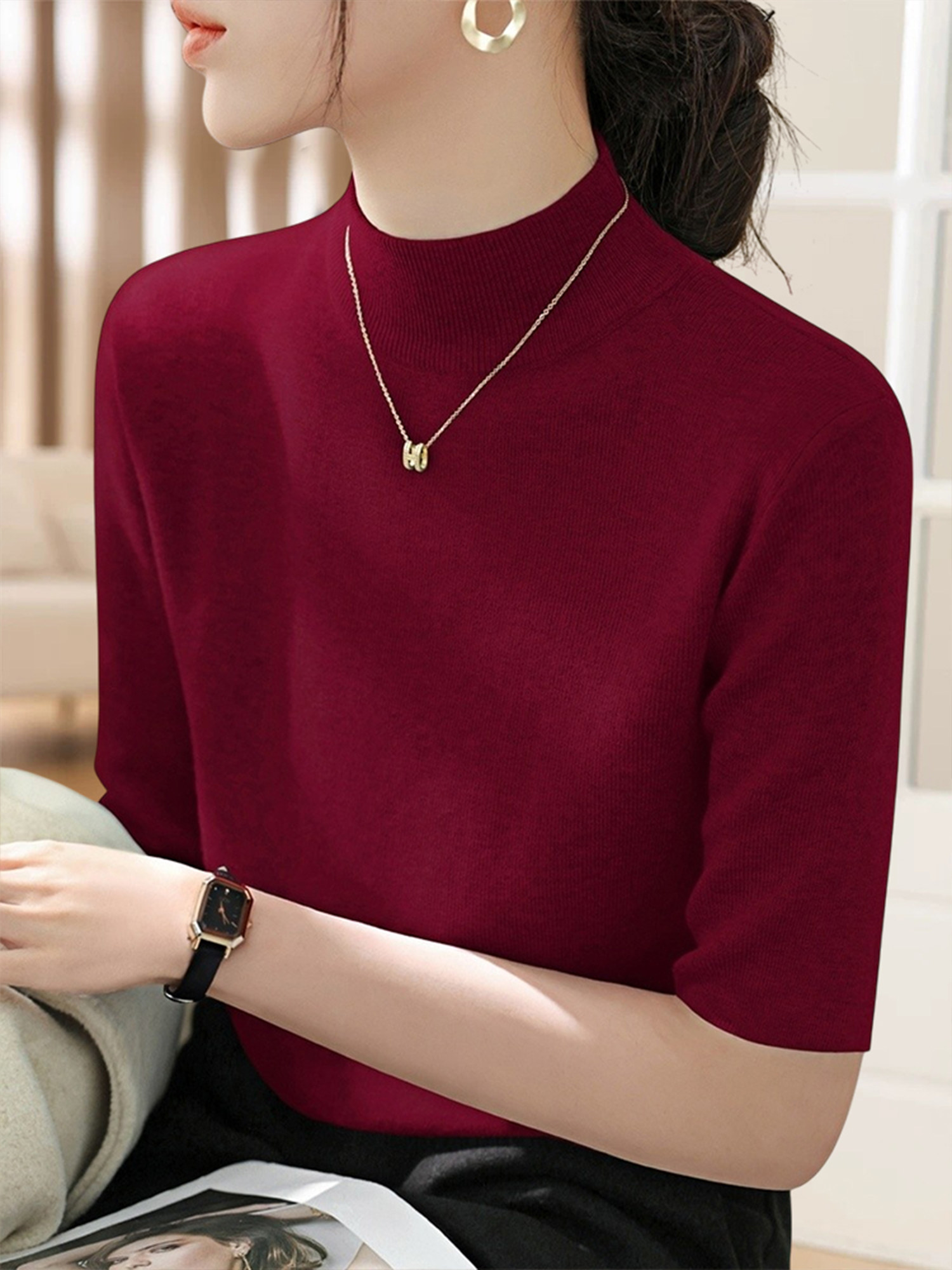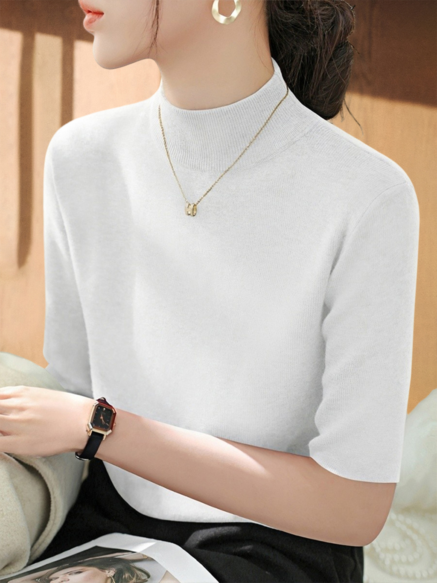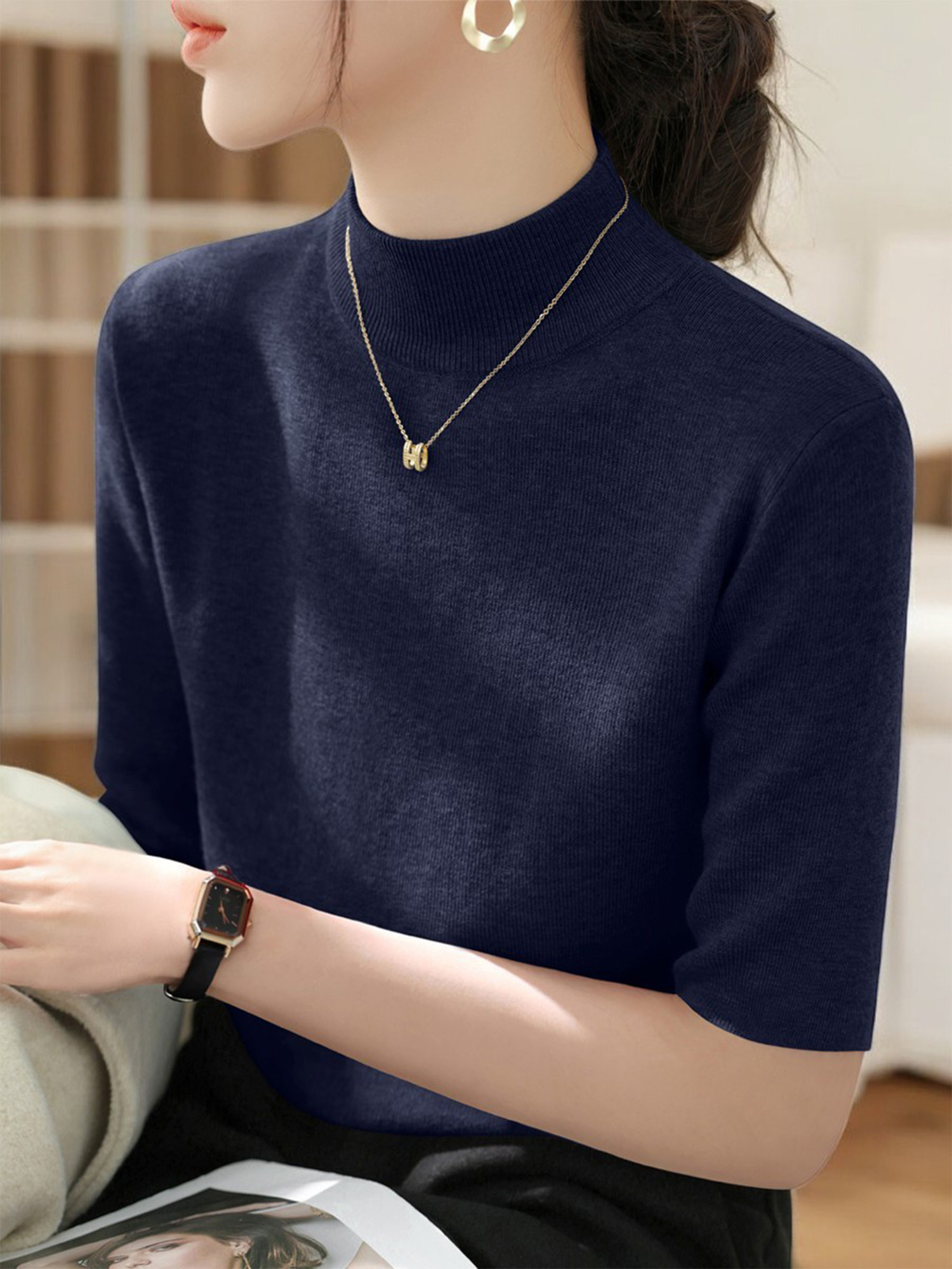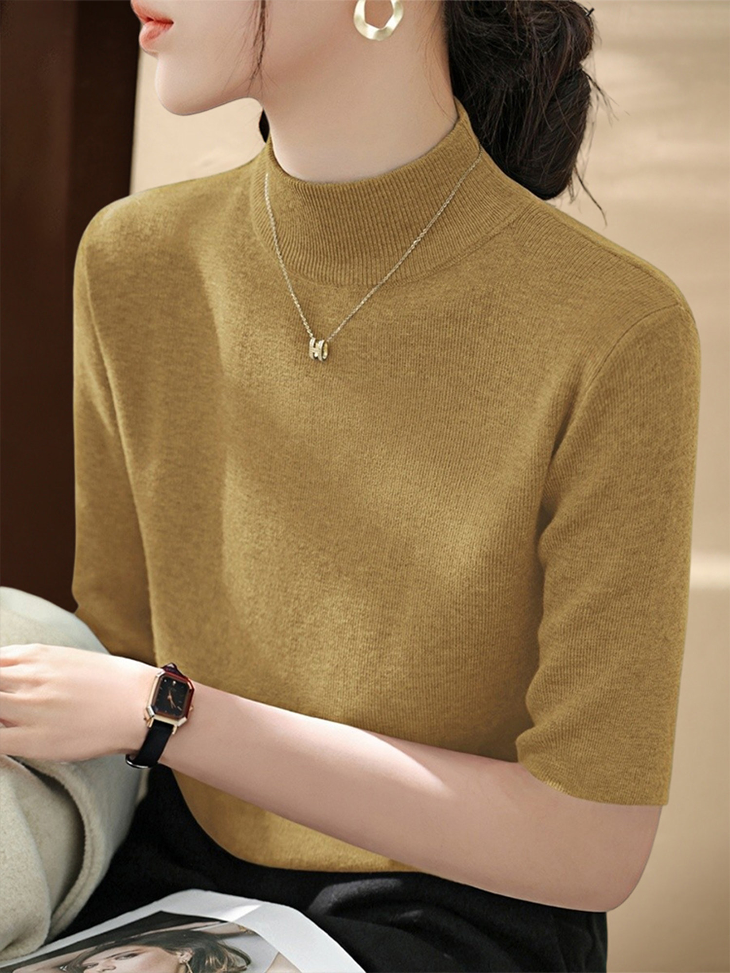 Basic House/百家好灰色半高領五分袖針織衫女2026春夏中袖打底衫