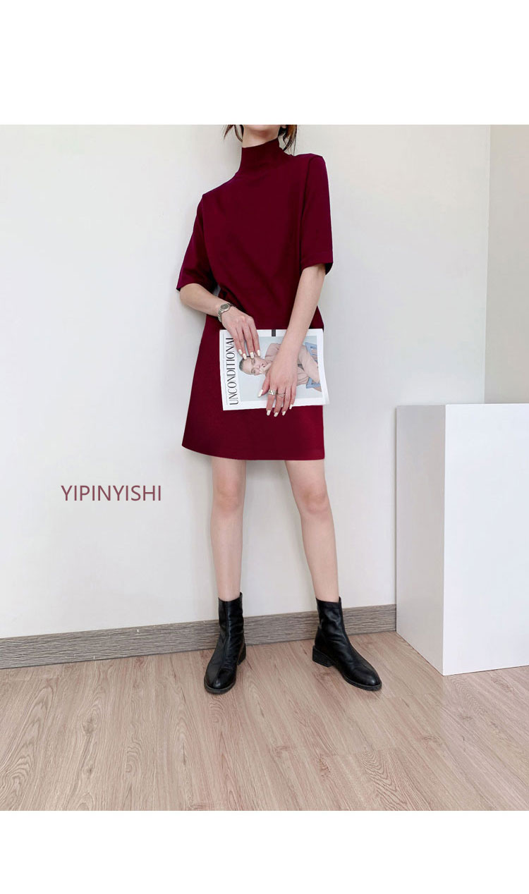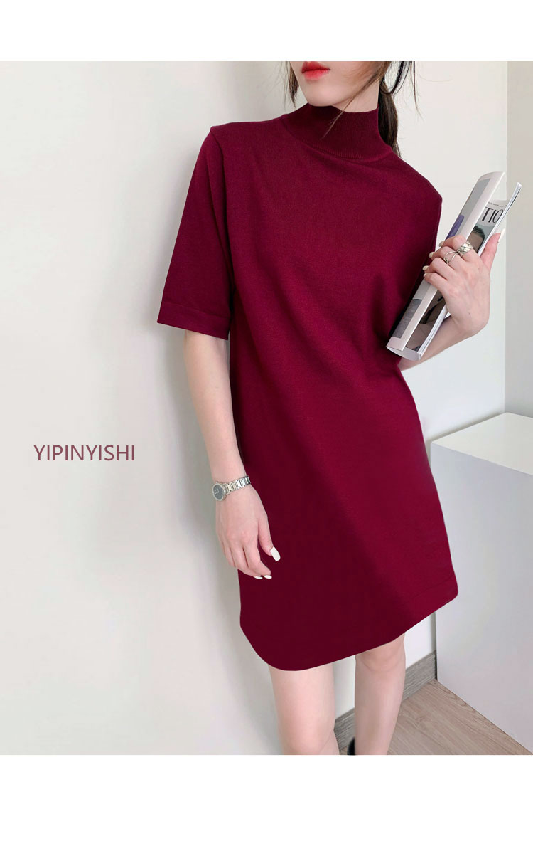 秋冬中長款半高領五分袖針織打底衫連衣裙純色直筒寬松顯瘦女上衣